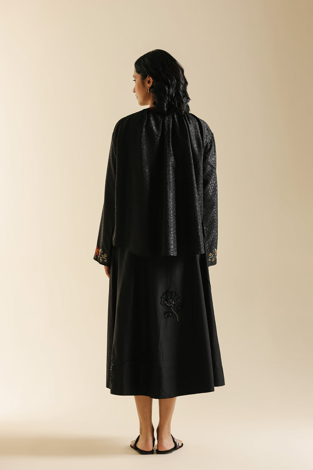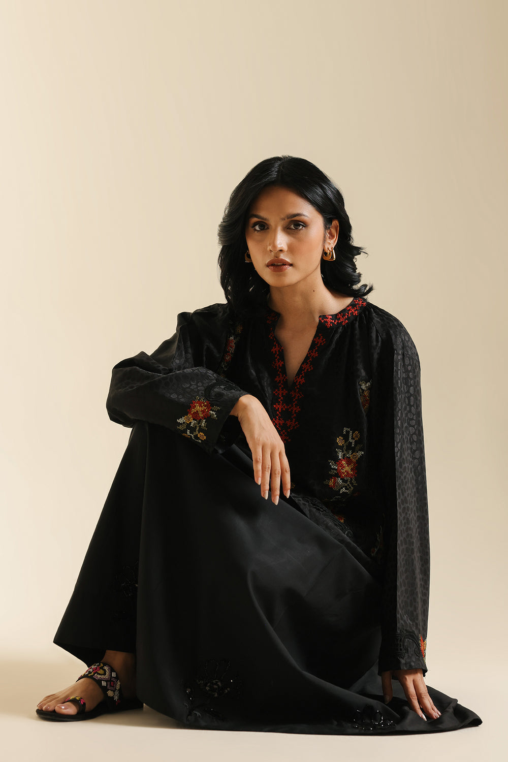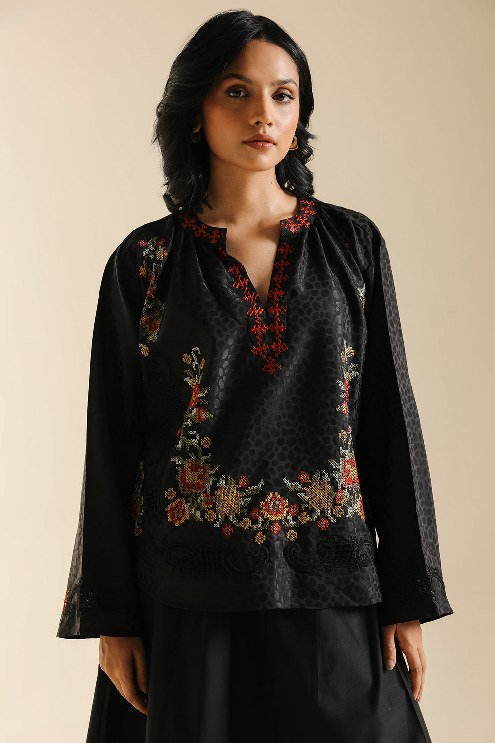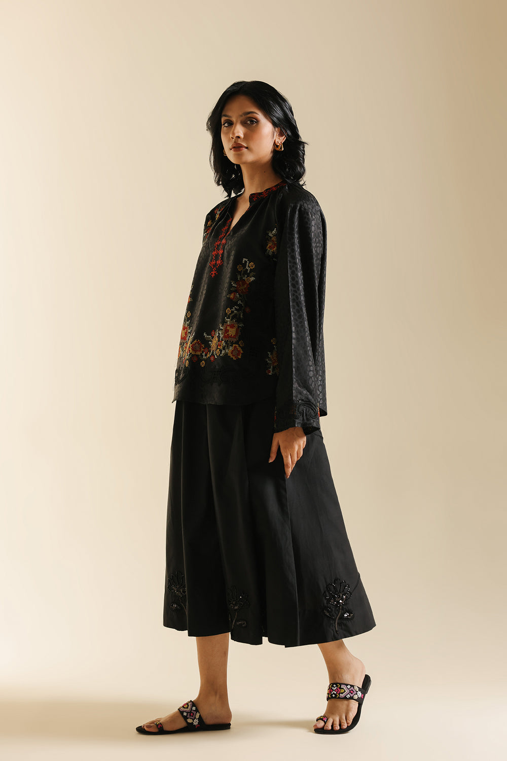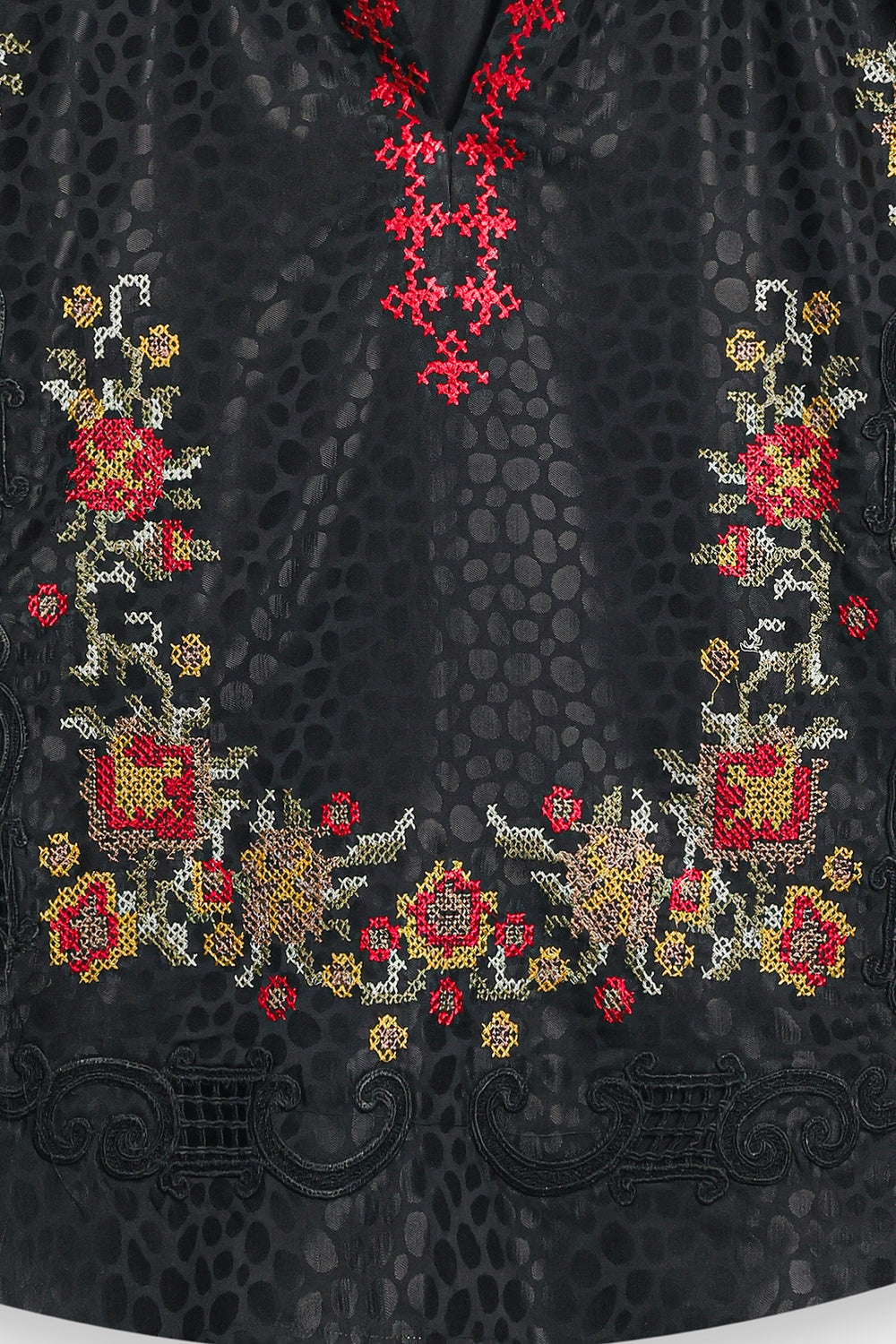 Embrace rich color and texture with this stunning black embroidered top. This sophisticated shirt is crafted from a refined black fabric that features a subtle, self-textured pattern, a small leopard design. The top is beautifully adorned with intricate multi-colored floral embroidery across the chest, featuring vibrant red and earthy tones that pop against the dark background. With its flowing, tunic-like fit, V-neckline, and comfortable full-length sleeves, this piece offers a perfect balance of comfort and traditional elegance.