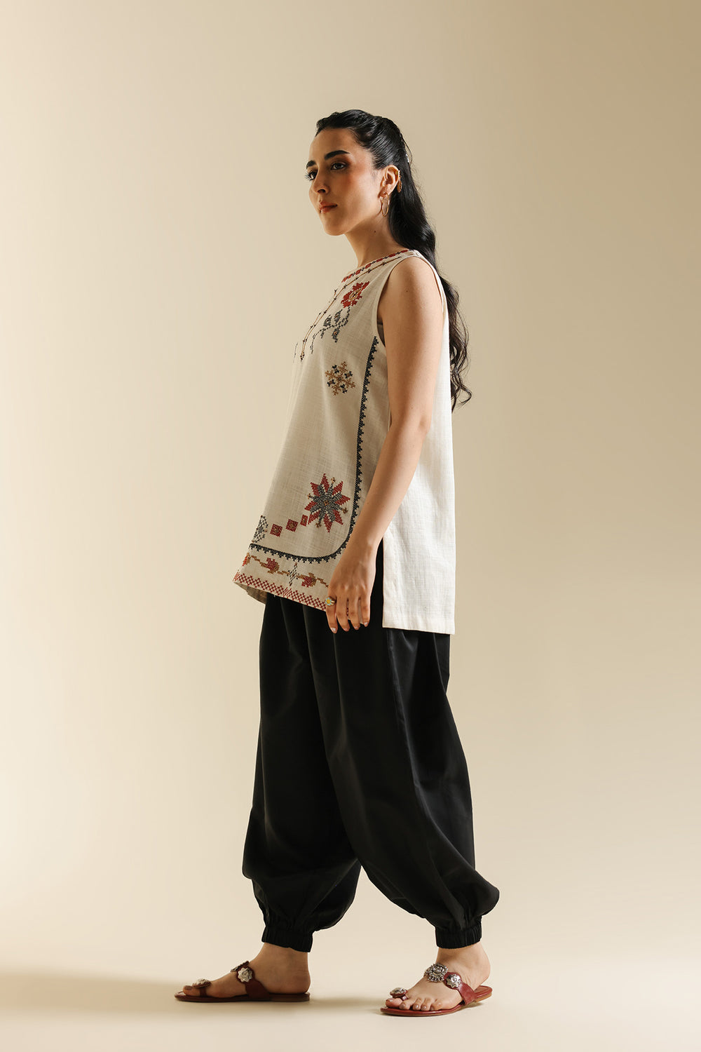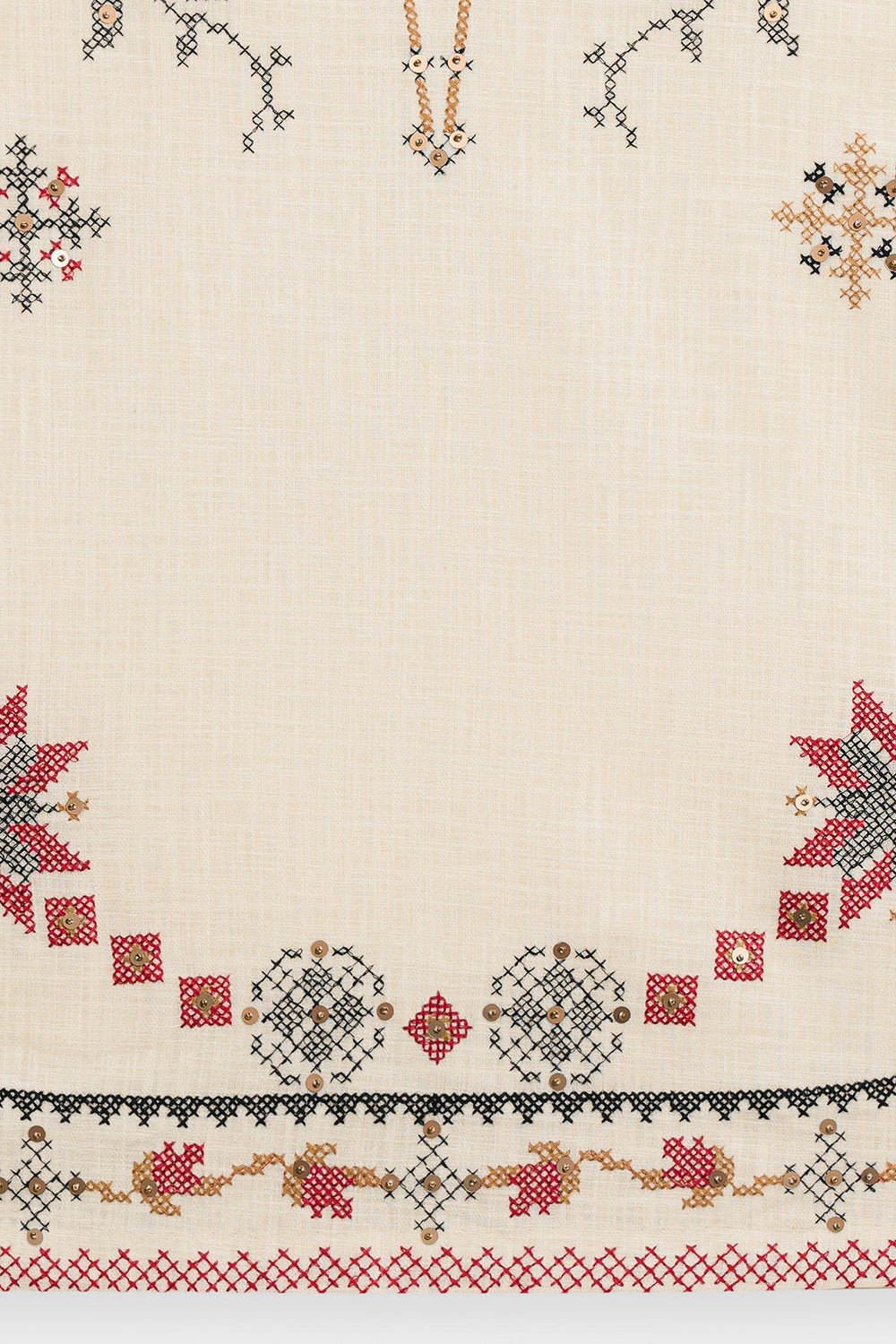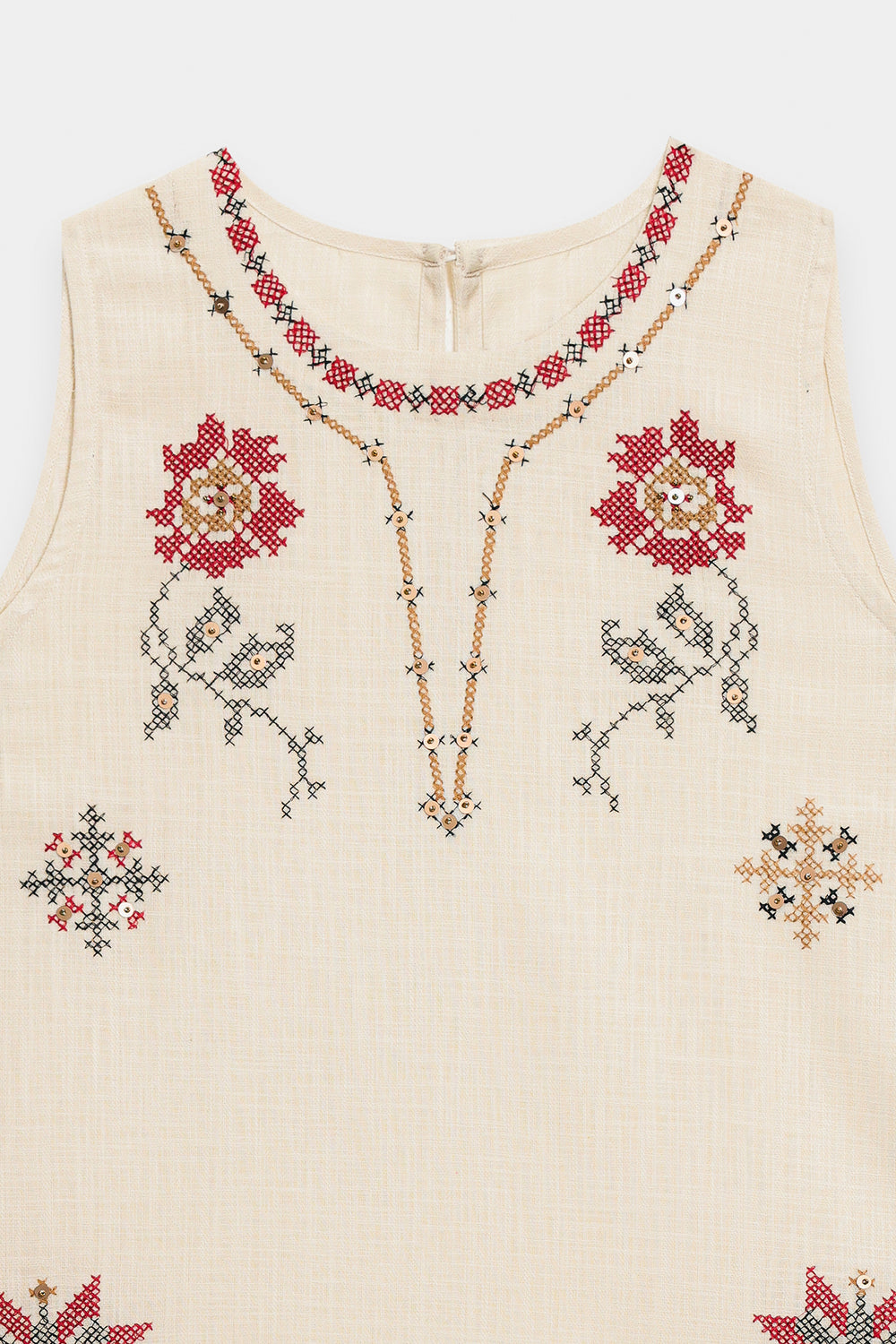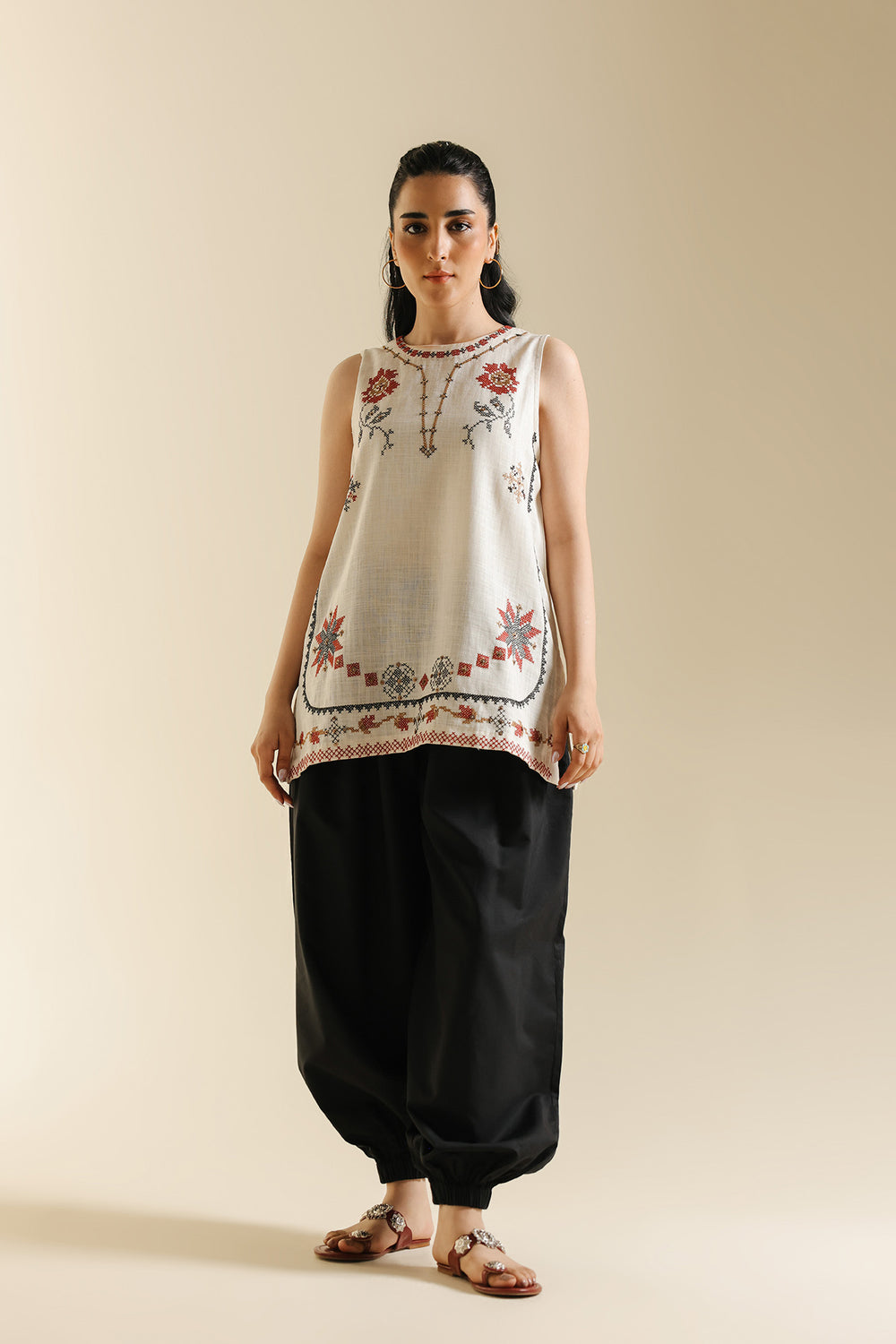 Project bohemian charm in this exquisitely detailed top. This comfortable, sleeveless top is crafted from a light, airy off-white fabric and is richly adorned with multicolored floral and geometric embroidery across the yoke and hemline. The embroidery, featuring shades of red, mustard yellow, and sage green, has a folk-art feel and is embellished with small beads for a touch of sparkle. Finished with a decorative neckline and a flattering relaxed drape, this top is effortlessly styled with black relaxed-fit trouser for a striking, artisanal look.