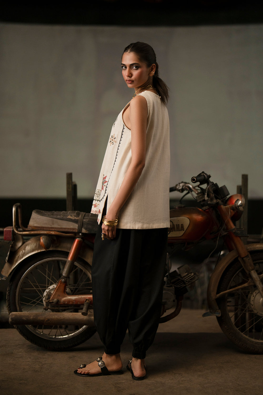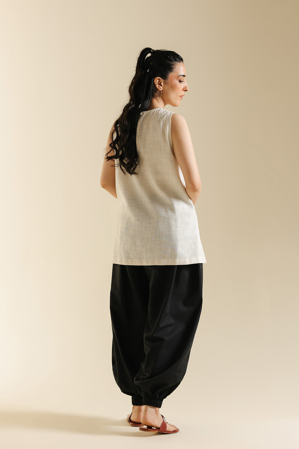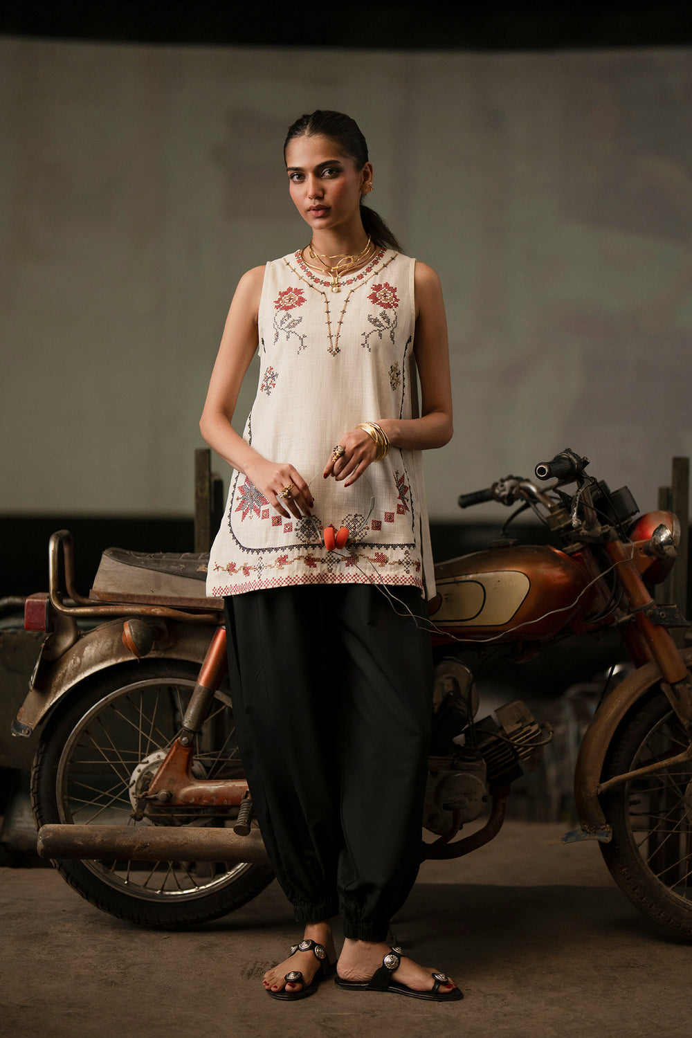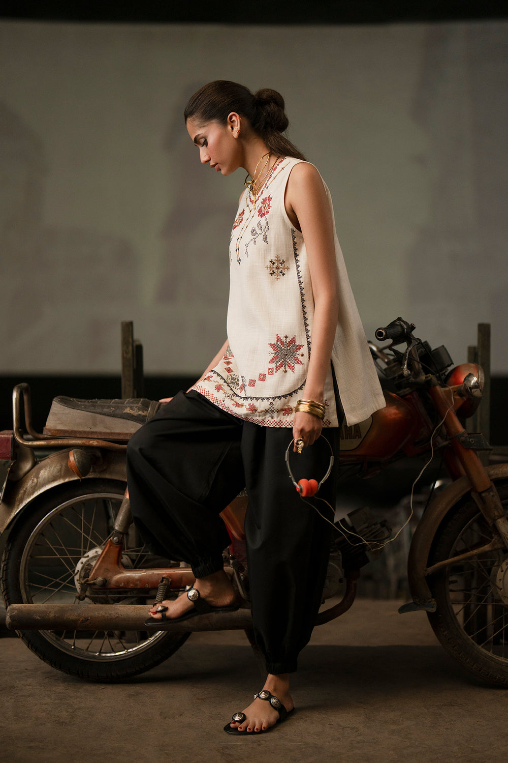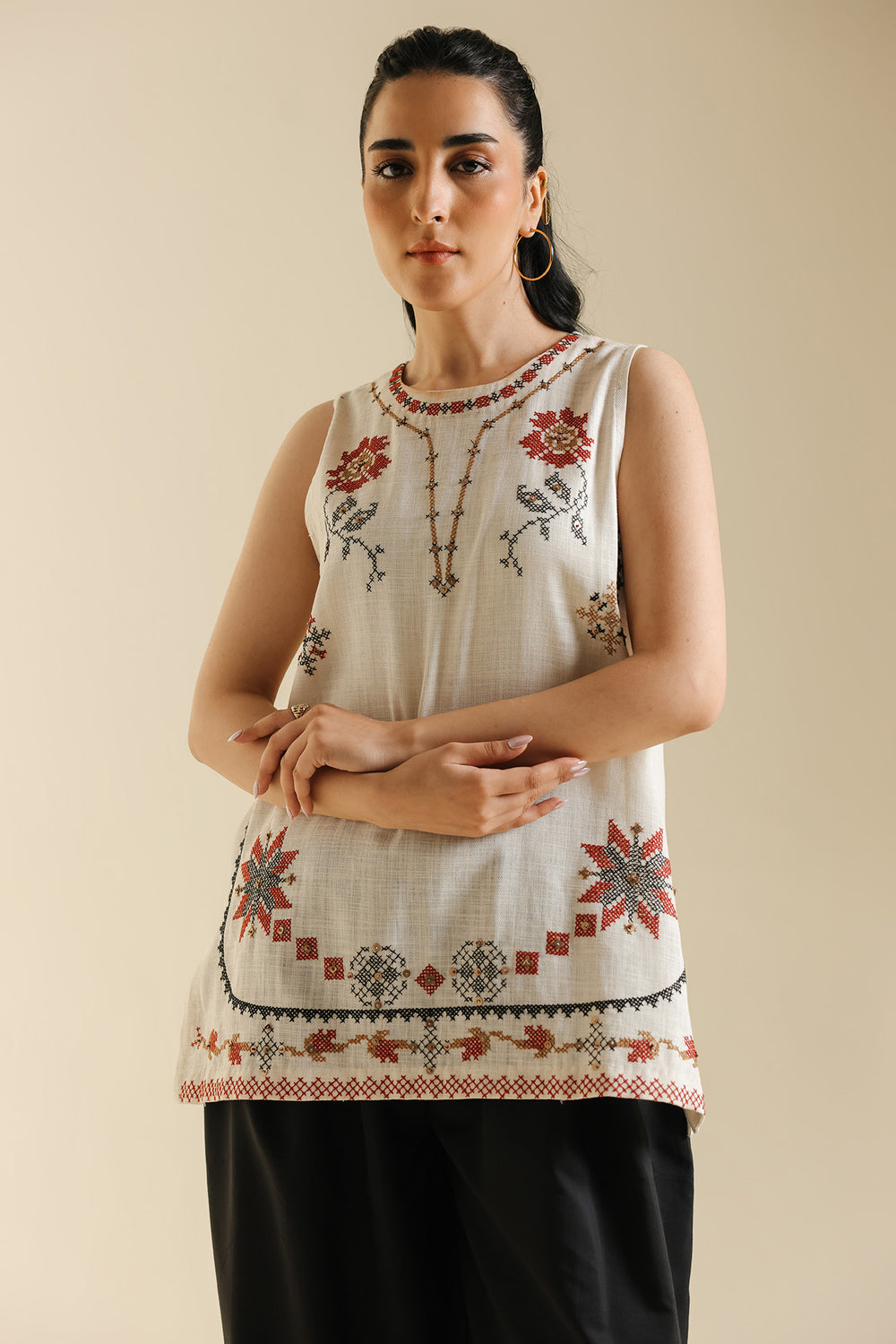 Project bohemian charm in this exquisitely detailed top. This comfortable, sleeveless top is crafted from a light, airy off-white fabric and is richly adorned with multicolored floral and geometric embroidery across the yoke and hemline. The embroidery, featuring shades of red, mustard yellow, and sage green, has a folk-art feel and is embellished with small beads for a touch of sparkle. Finished with a decorative neckline and a flattering relaxed drape, this top is effortlessly styled with black relaxed-fit trouser for a striking, artisanal look.