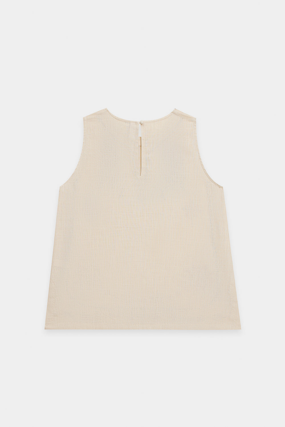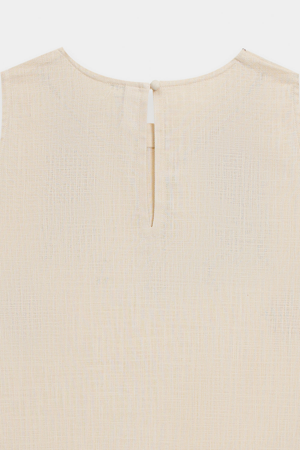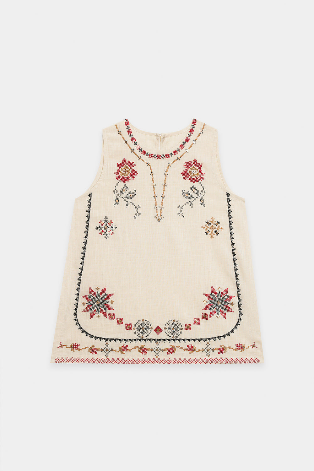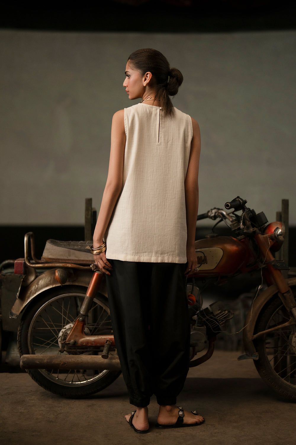 Project bohemian charm in this exquisitely detailed top. This comfortable, sleeveless top is crafted from a light, airy off-white fabric and is richly adorned with multicolored floral and geometric embroidery across the yoke and hemline. The embroidery, featuring shades of red, mustard yellow, and sage green, has a folk-art feel and is embellished with small beads for a touch of sparkle. Finished with a decorative neckline and a flattering relaxed drape, this top is effortlessly styled with black relaxed-fit trouser for a striking, artisanal look.