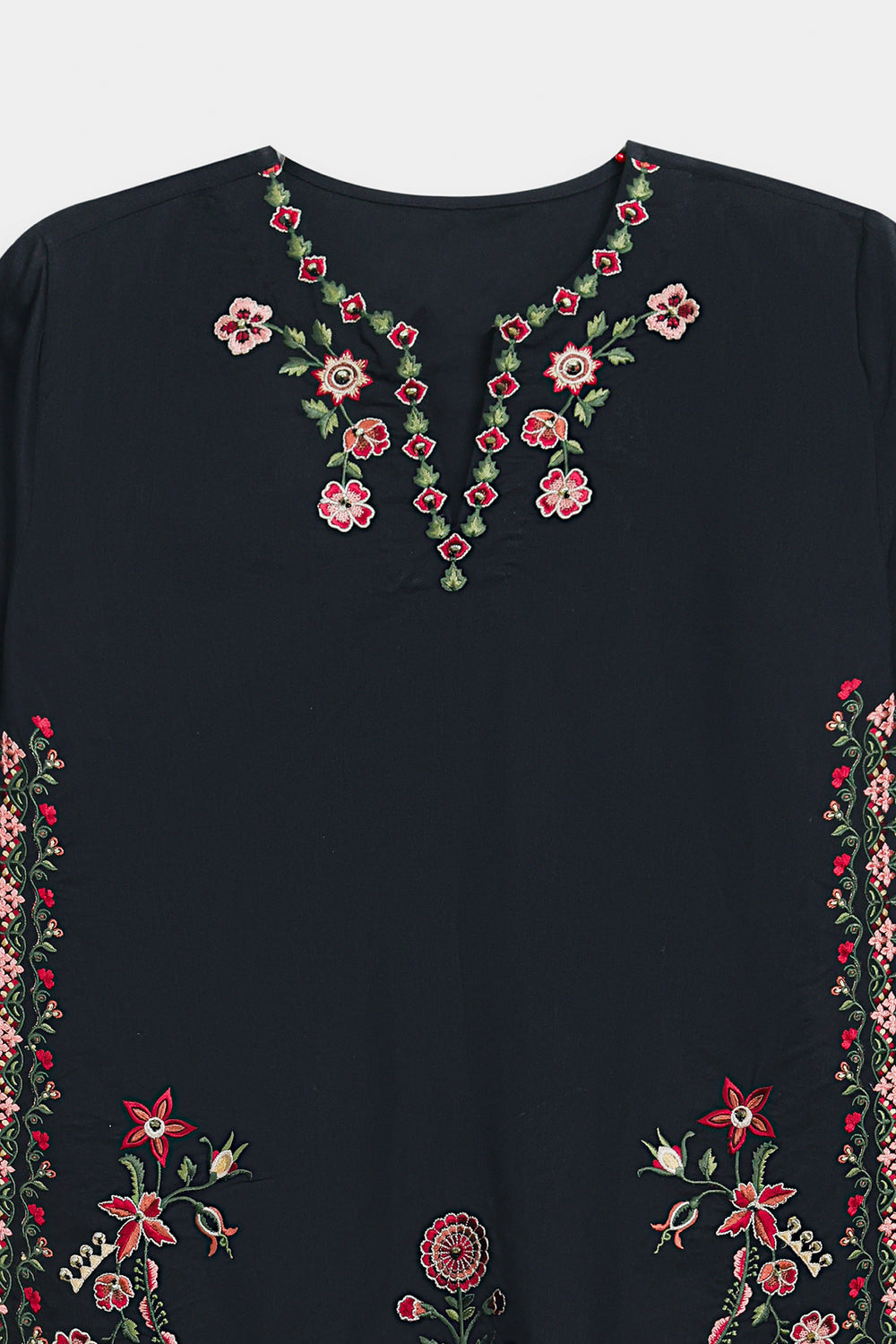 This elegant jet black kurti brings together quality craftsmanship and timeless style. Made from premium fabric with a soft sheen, it features a classic V-split neckline with detailed multi-embroidery work. Intricate floral and vine patterns decorate the bodice and hemline, adding a graceful shimmer to the piece. The straight-cut design and embellished border create a polished look that works for any formal occasion. Wear it on its own for a clean aesthetic or layer it for added dimension—a versatile choice that never goes out of style.
