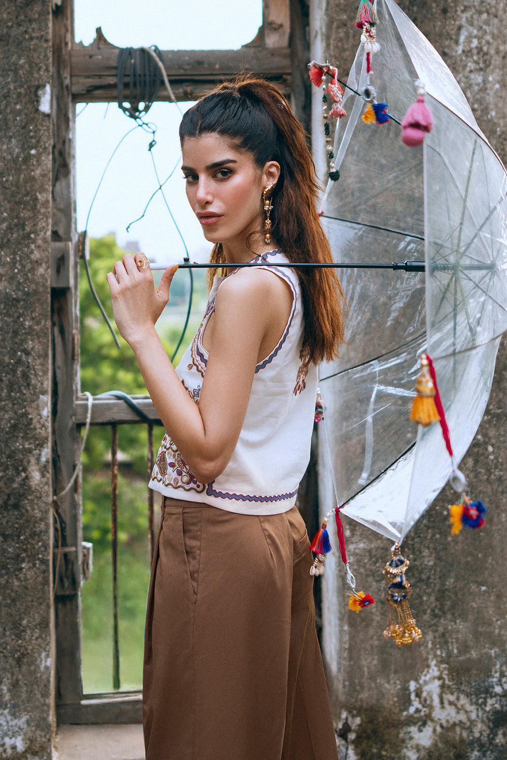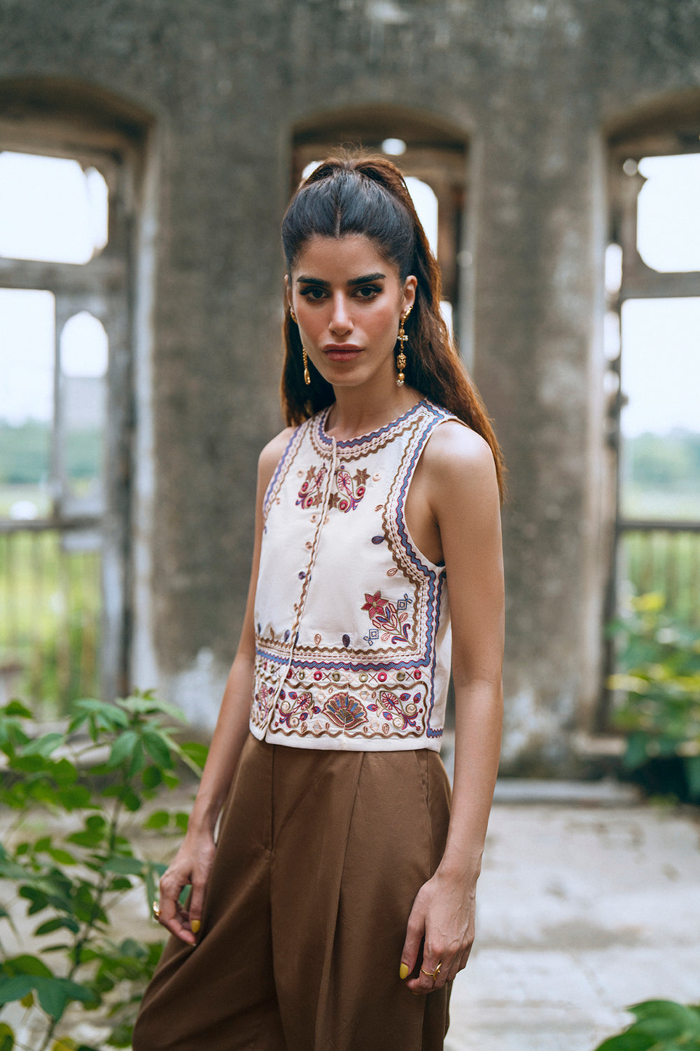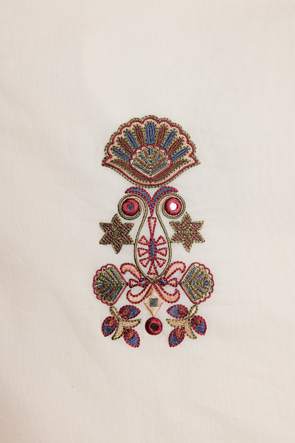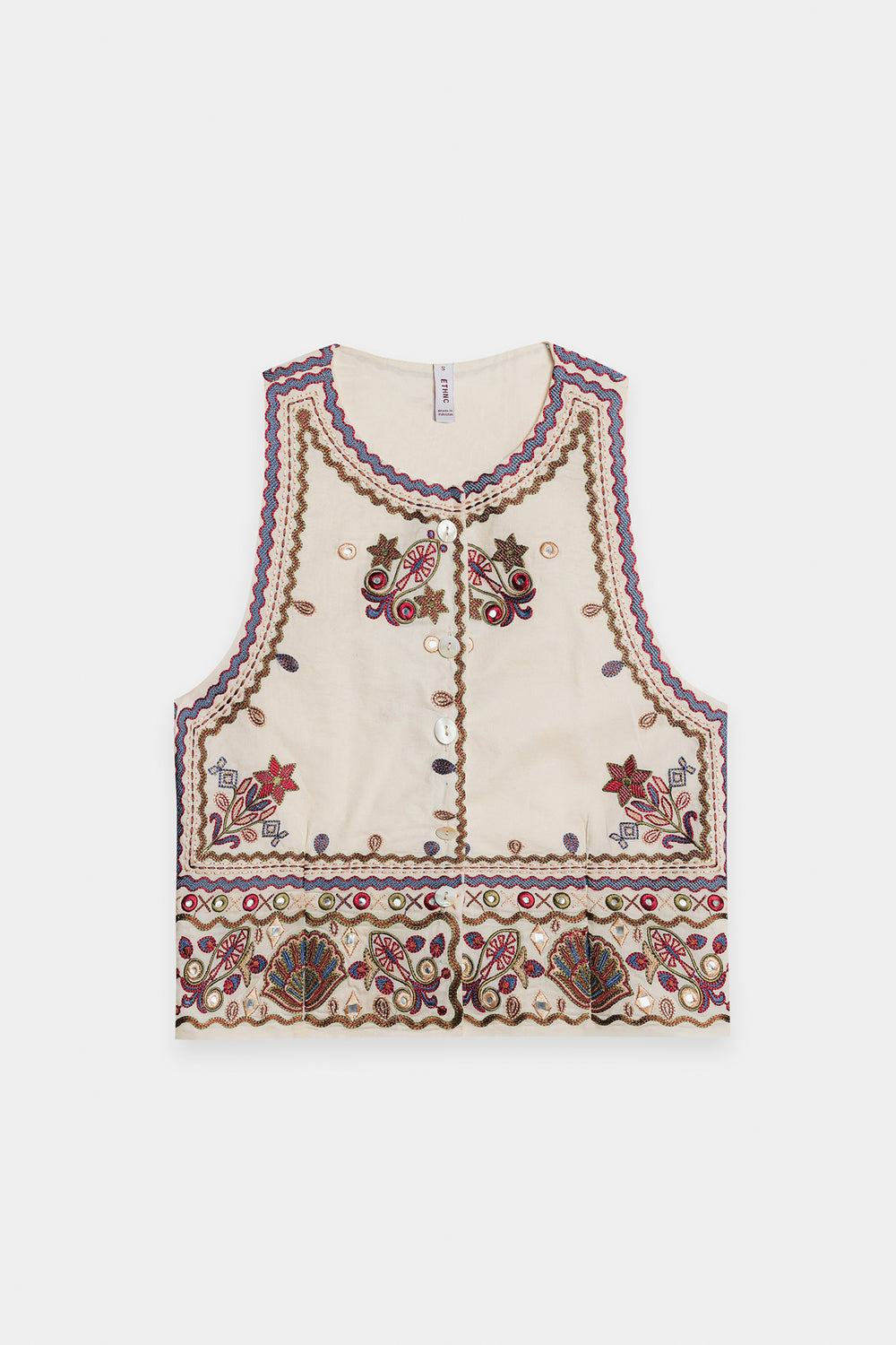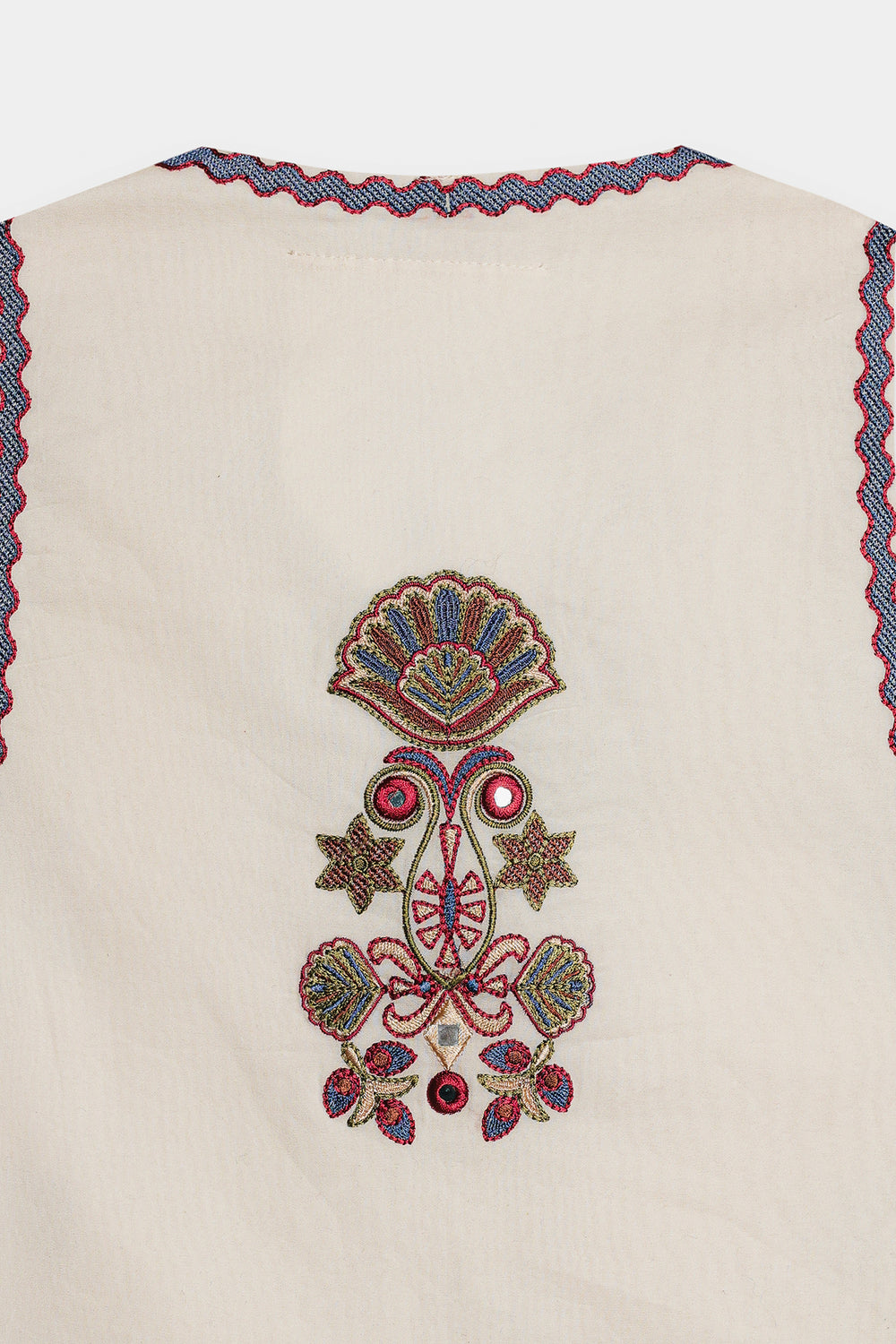 This beautiful off white waistcoat is a must-have for a stylish and elegant look. The sleeveless design is adorned with intricate floral and geometric embroidery in shades of red, white, and blue, creating a delicate and eye-catching pattern. With its button-down front, this waistcoat is perfect for layering over a simple top or dress, adding a touch of traditional charm to any outfit.