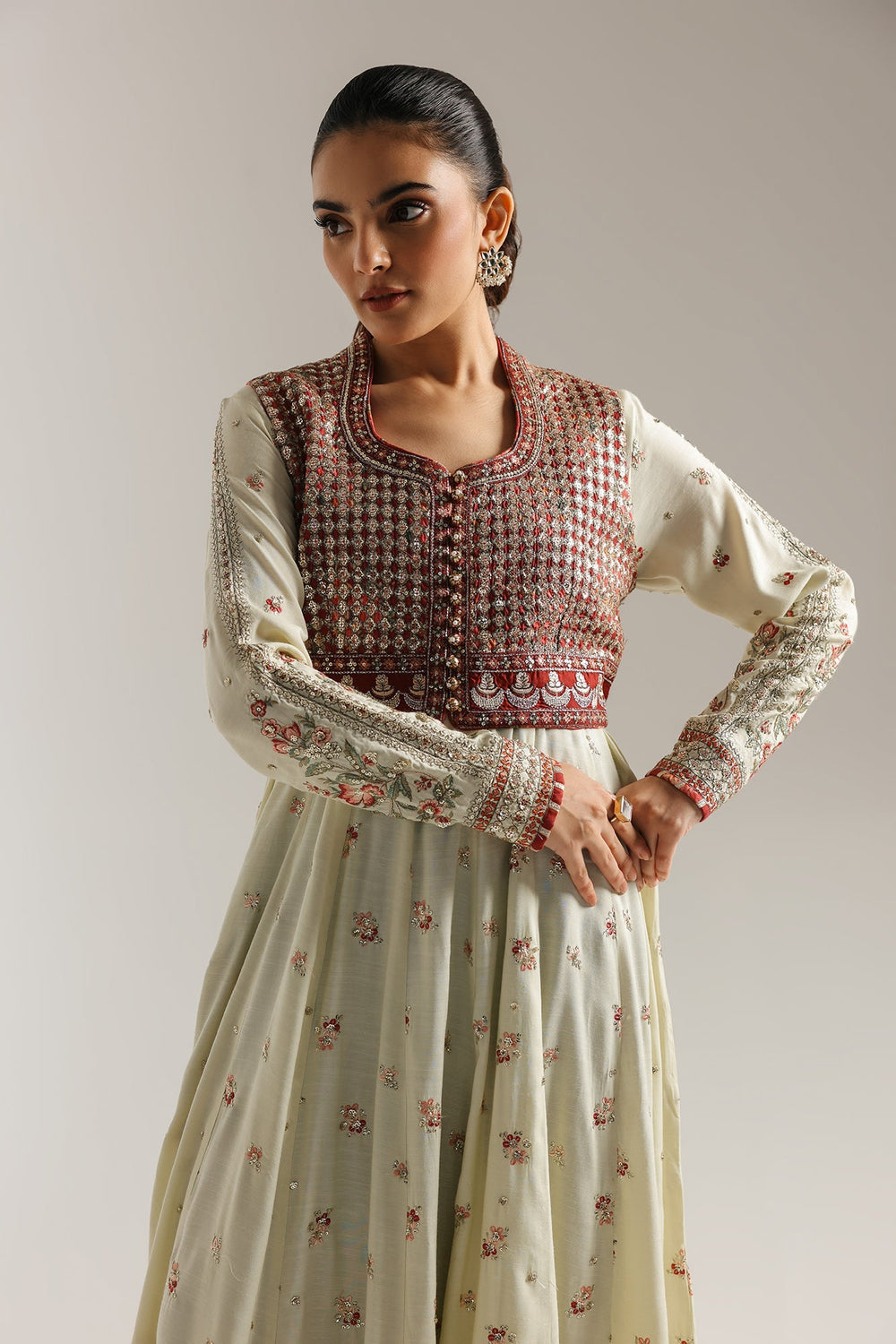 Make a regal statement with this enchanting pishwas and waistcoat set. The long, flowing pishwas in pale green fabric is beautifully adorned with delicate red floral embroidery. It is perfectly complemented by a separate, heavily embroidered waistcoat in a rich red and gold pattern that adds a layer of bold elegance. This ensemble is a celebration of vibrant color and captivating craftsmanship, perfect for a special event.