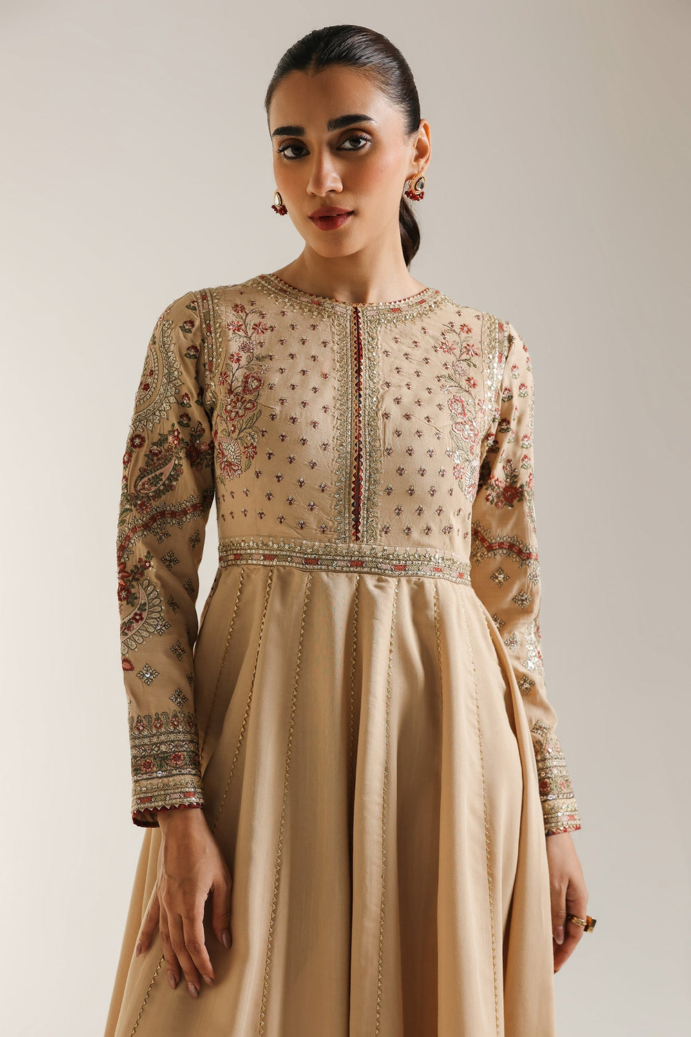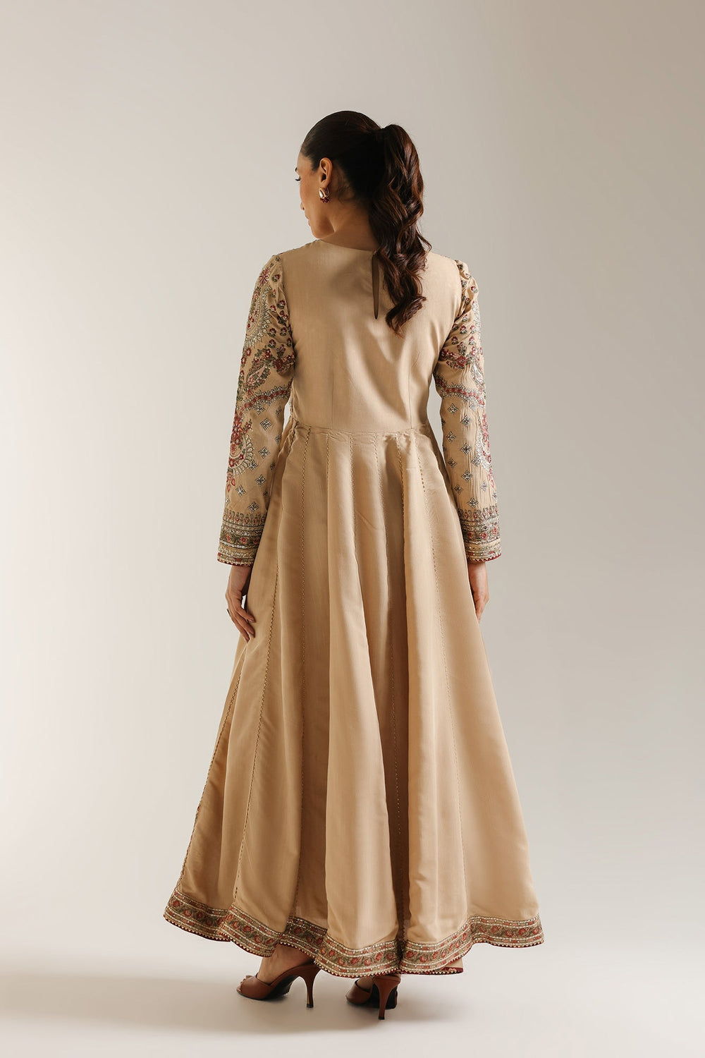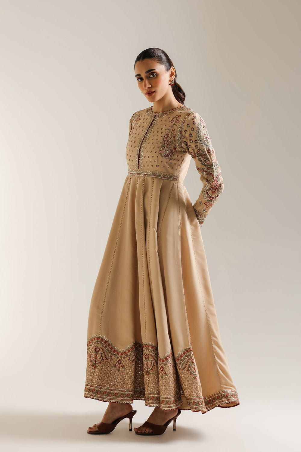 Step into timeless grandeur with this exquisite pishwas, a magnificent display of traditional artistry and intricate embellishments. This stunning full-length dress features a flattering long-sleeved silhouette, richly adorned with a medley of colorful embroidery and delicate beadwork. The intricate patterns gracefully flow across the bodice, sleeves, and form an opulent border around the flared hem, creating a truly majestic design. This pishwas is ideal for grand festive celebrations, formal dinners, or making an unforgettable and graceful statement at any special occasion.