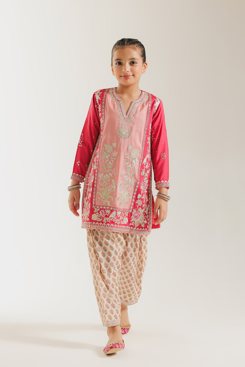 Illuminate any occasion with this vibrant pink and embroidered suit. The short, festive kurta features a bodice divided into panels of bright pink and rich fuchsia, connected by beautiful vertical embroidery. The front is densely embellished with sequin and thread work in delicate floral motifs. The V-slit neckline and long sleeves add a classic touch to this richly colored piece. The ensemble is completed by shalwar. The shalwar feature an all-over, small-scale floral print in shades of cream and pink, offering a lovely balance to the vibrant kurta. This suit is perfect for adding traditional splendor to a young one's wardrobe.