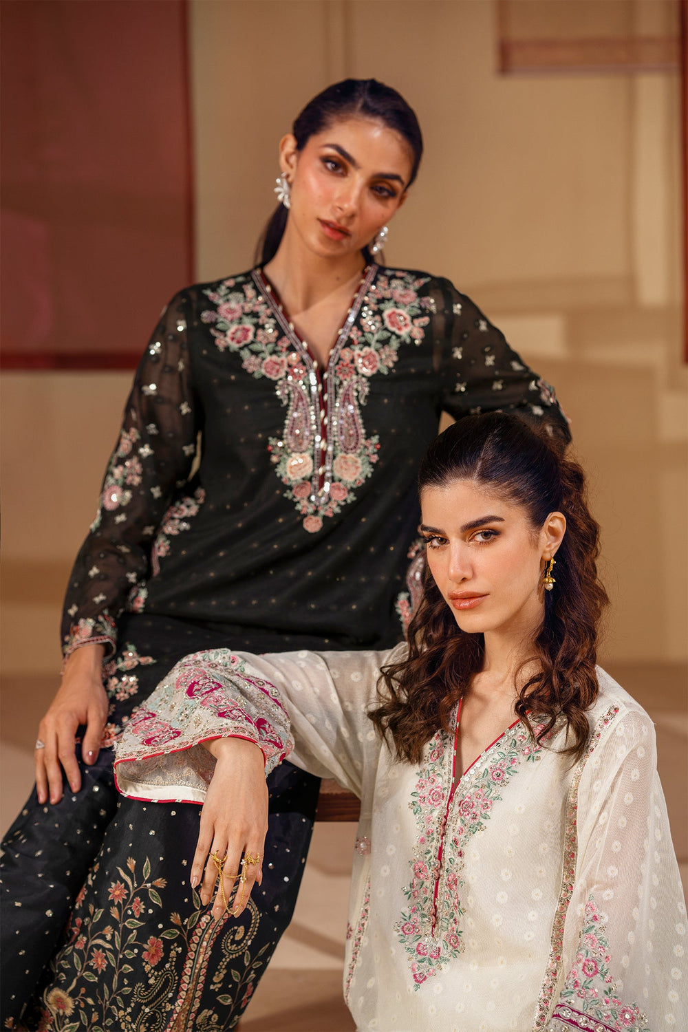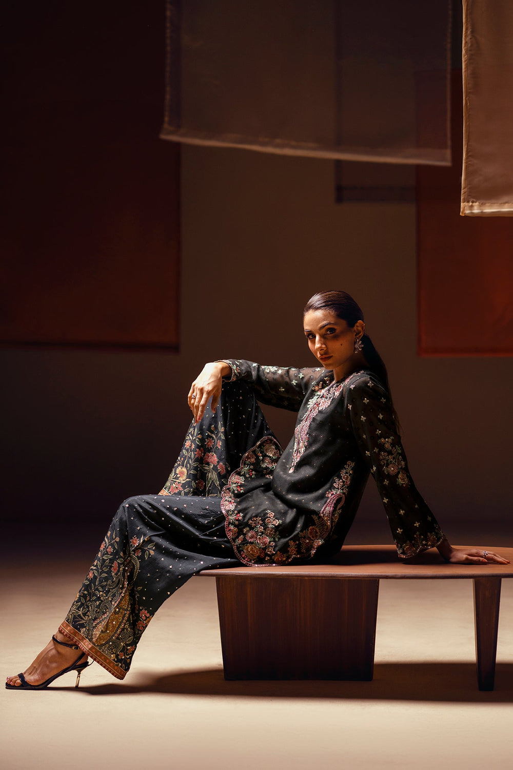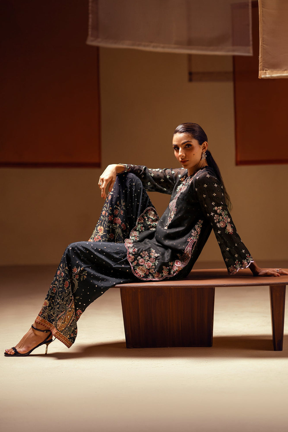 Explore the depths of elegant artistry. This stunning black 3-piece suit includes a shirt, slip, and shalwar. The shirt is beautifully adorned with intricate floral embroidery in vibrant shades of pink, green, and gold, while the shalwar features a matching embroidered border at the hem. This ensemble is a celebration of rich color and captivating craftsmanship, perfect for making a bold and elegant statement.