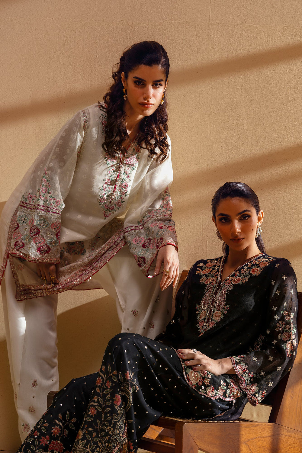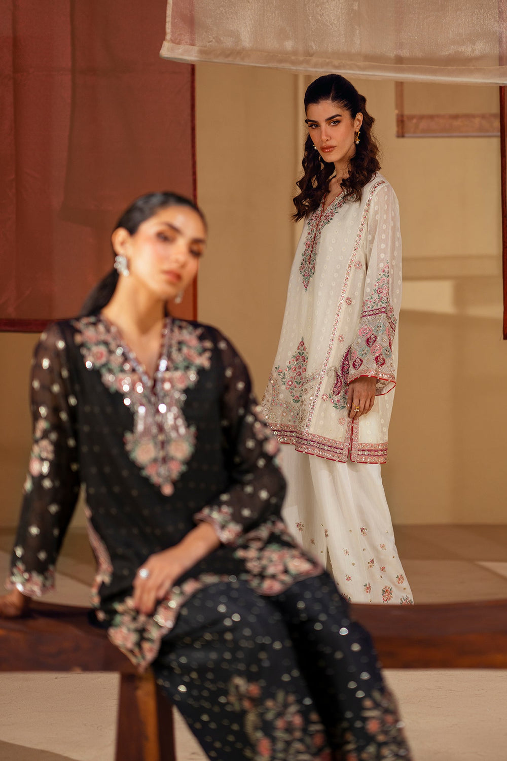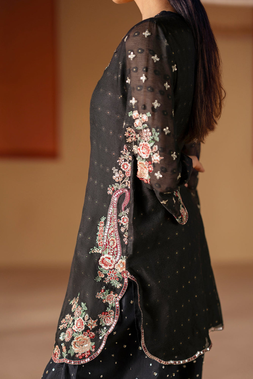 Explore the depths of elegant artistry. This stunning black 3-piece suit includes a shirt, slip, and shalwar. The shirt is beautifully adorned with intricate floral embroidery in vibrant shades of pink, green, and gold, while the shalwar features a matching embroidered border at the hem. This ensemble is a celebration of rich color and captivating craftsmanship, perfect for making a bold and elegant statement.