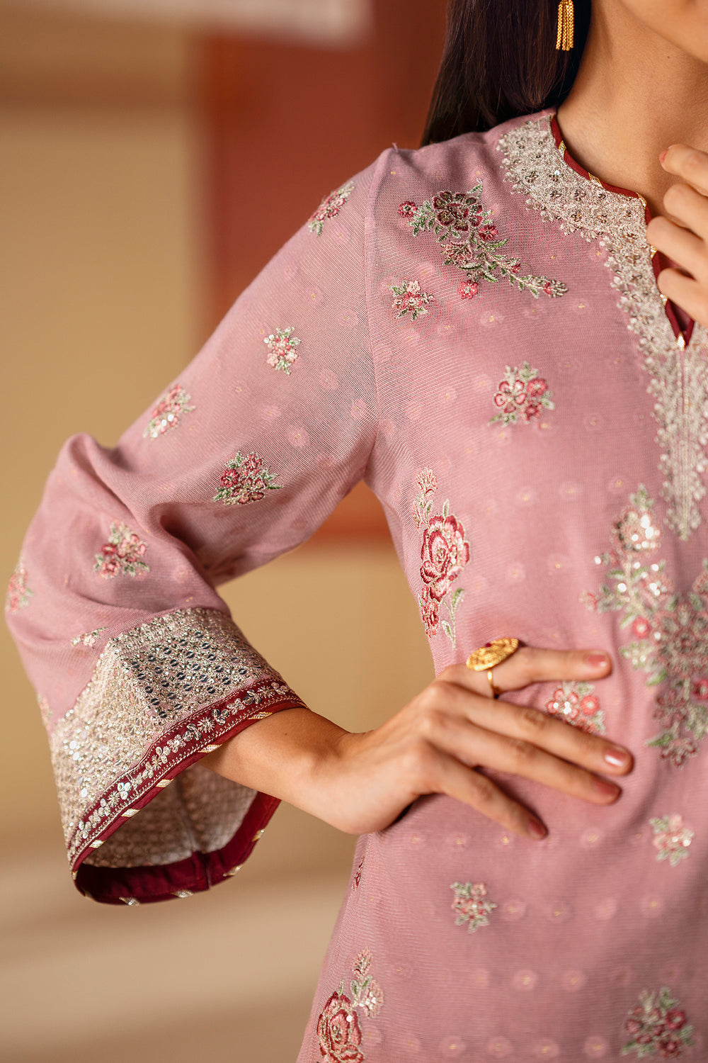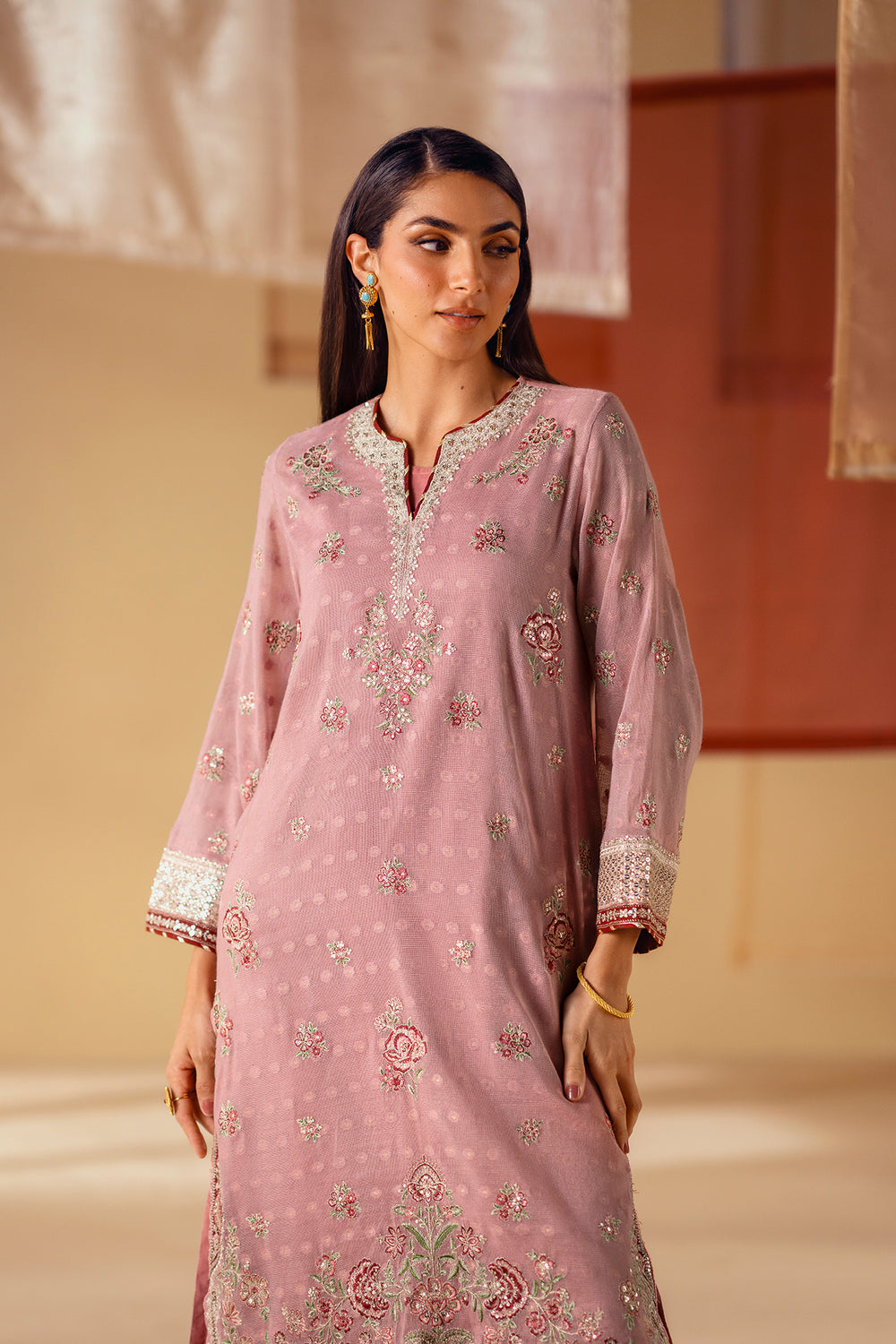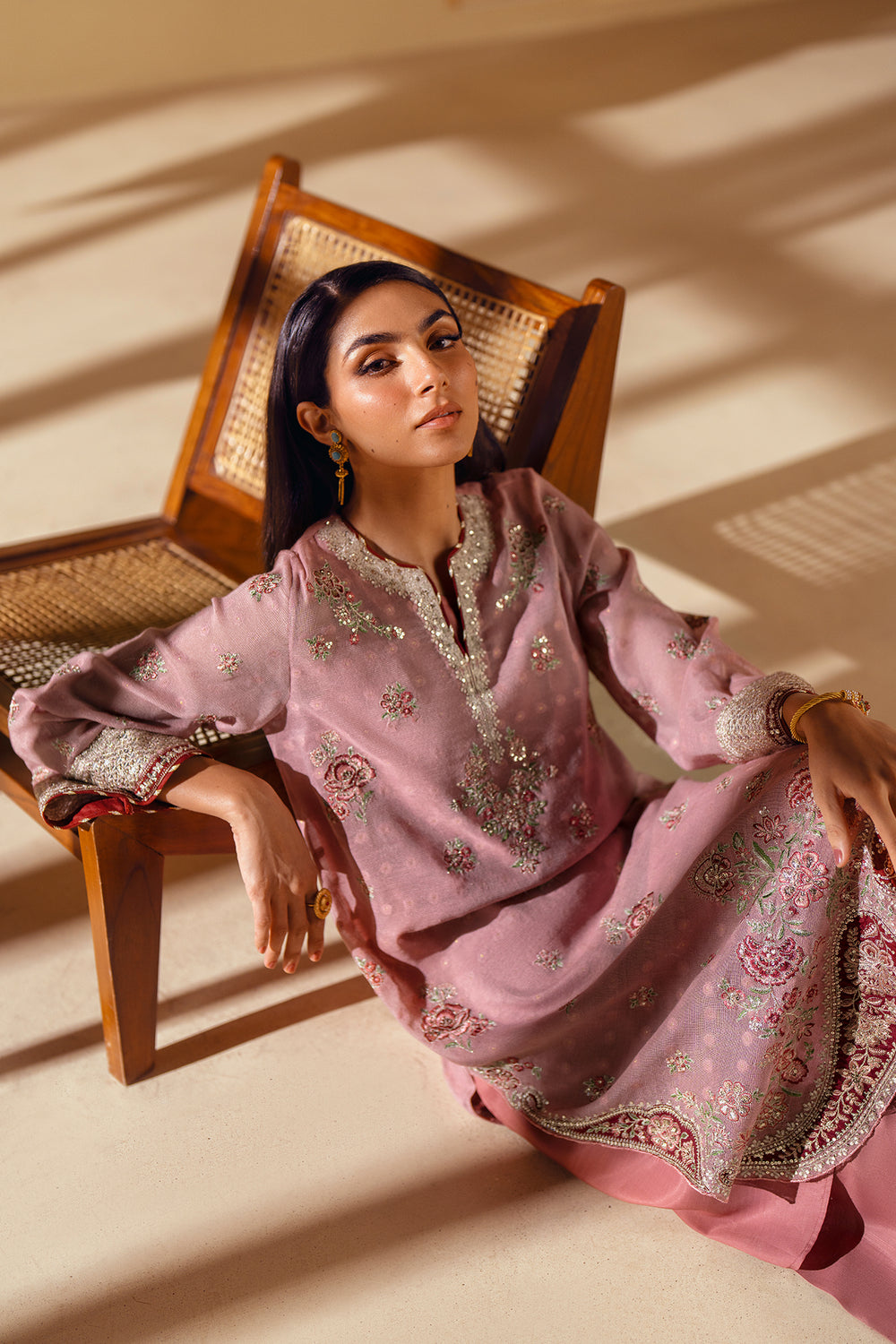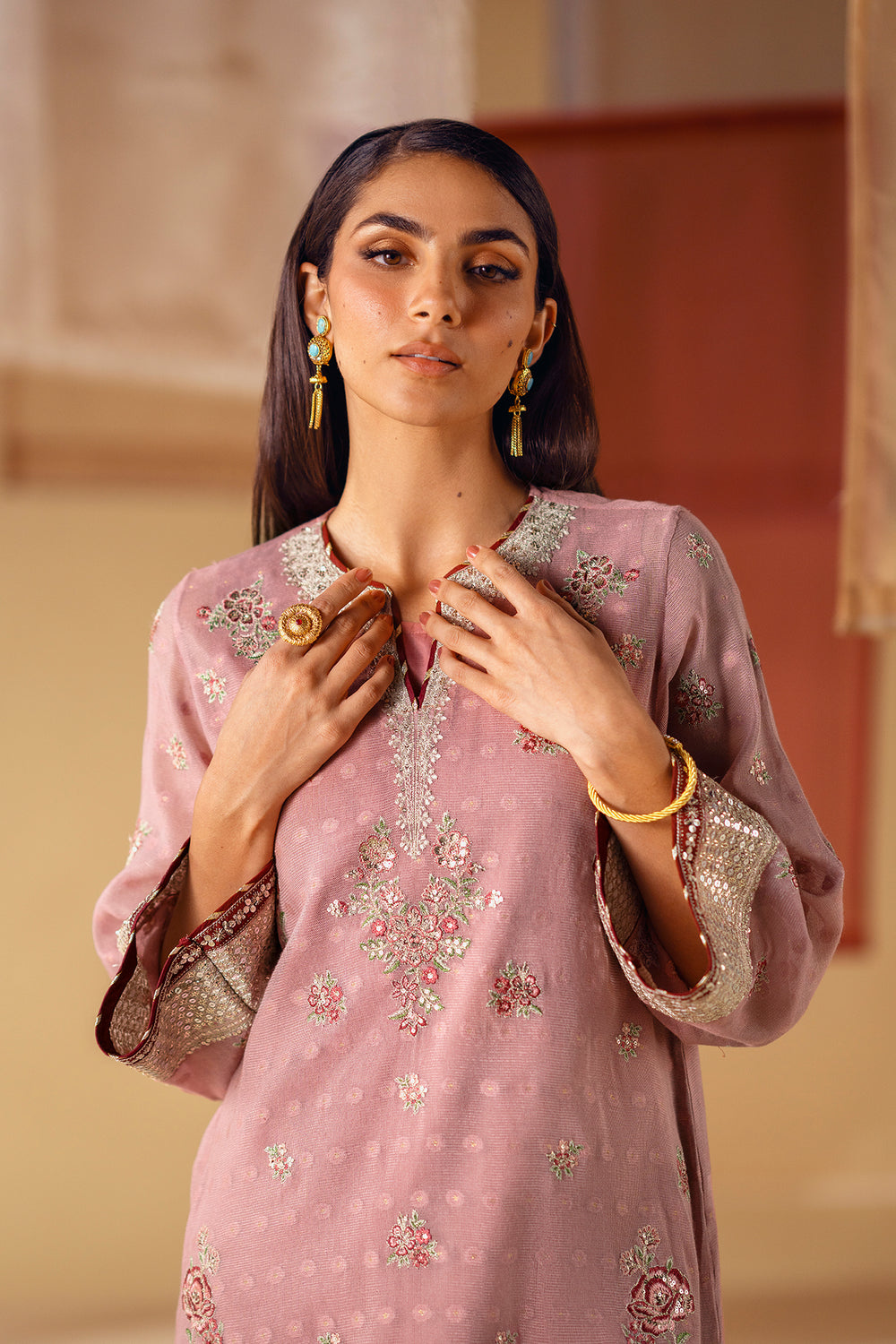 A vision of refined elegance and artistic charm. This beautiful 3-piece suit includes a long shirt, culotte fit trouser, and a separate inner slip. The shirt, in a soft hue, is beautifully adorned with intricate floral embroidery in silver and a deeper maroon. The trousers feature a matching embroidered border, creating a cohesive and sophisticated look. This ensemble is a celebration of graceful color and timeless artistry.