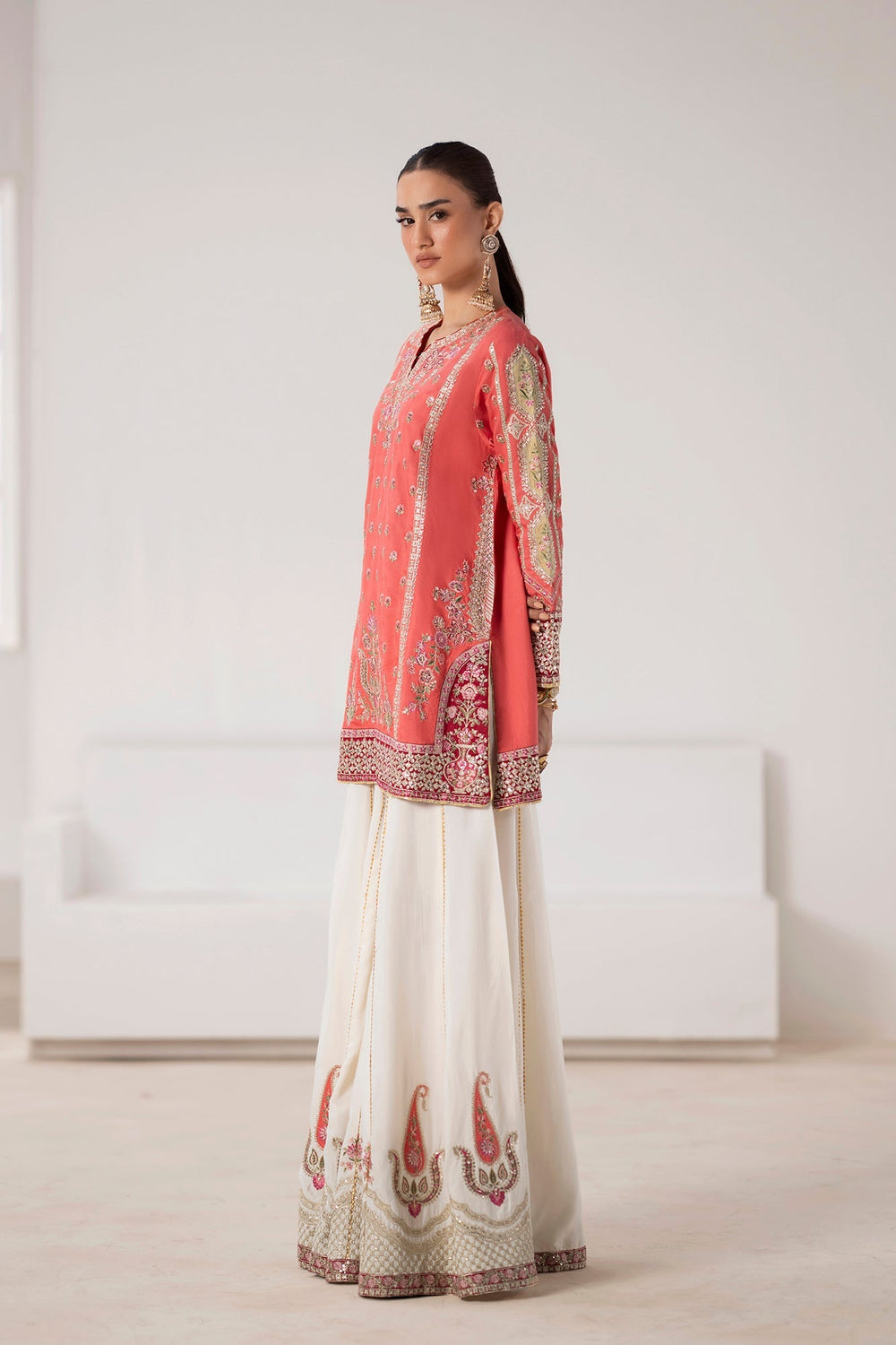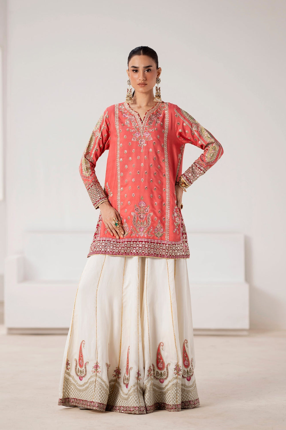 Emerge in festive splendor with this exquisite embroidered suit. The vibrant coral shirt is a canvas for intricate embroidery, featuring delicate floral and vine patterns in shimmering gold, silver, and soft pink. A beautifully detailed neckline and embellished sleeves add a touch of traditional elegance. The ensemble is completed with a stunning, wide-legged sharara in a crisp off-white. The sharara is a masterpiece in its own right, adorned with a bold, contrasting embroidered paisley border that elevates the entire look. This suit is the perfect choice for a grand celebration, blending festive colors with refined craftsmanship.