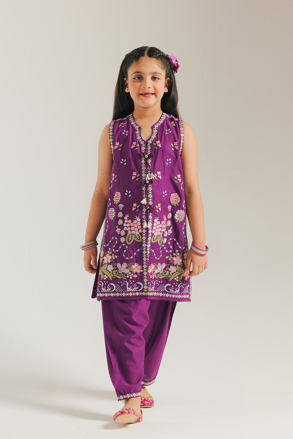 This enchanting suit is a celebration of vibrant color and beautiful detail. The rich purple tunic is a perfect backdrop for the stunning, multi-colored floral embroidery that cascades down the front. The intricate pink, white, and green patterns, along with delicate tasseled accents, give the sleeveless shirt a whimsical and elegant feel. The outfit is completed with matching purple shalwar that have a coordinated embroidered border at the hem. This lovely ensemble is a perfect choice for a young girl to wear to a special occasion or a festive gathering.