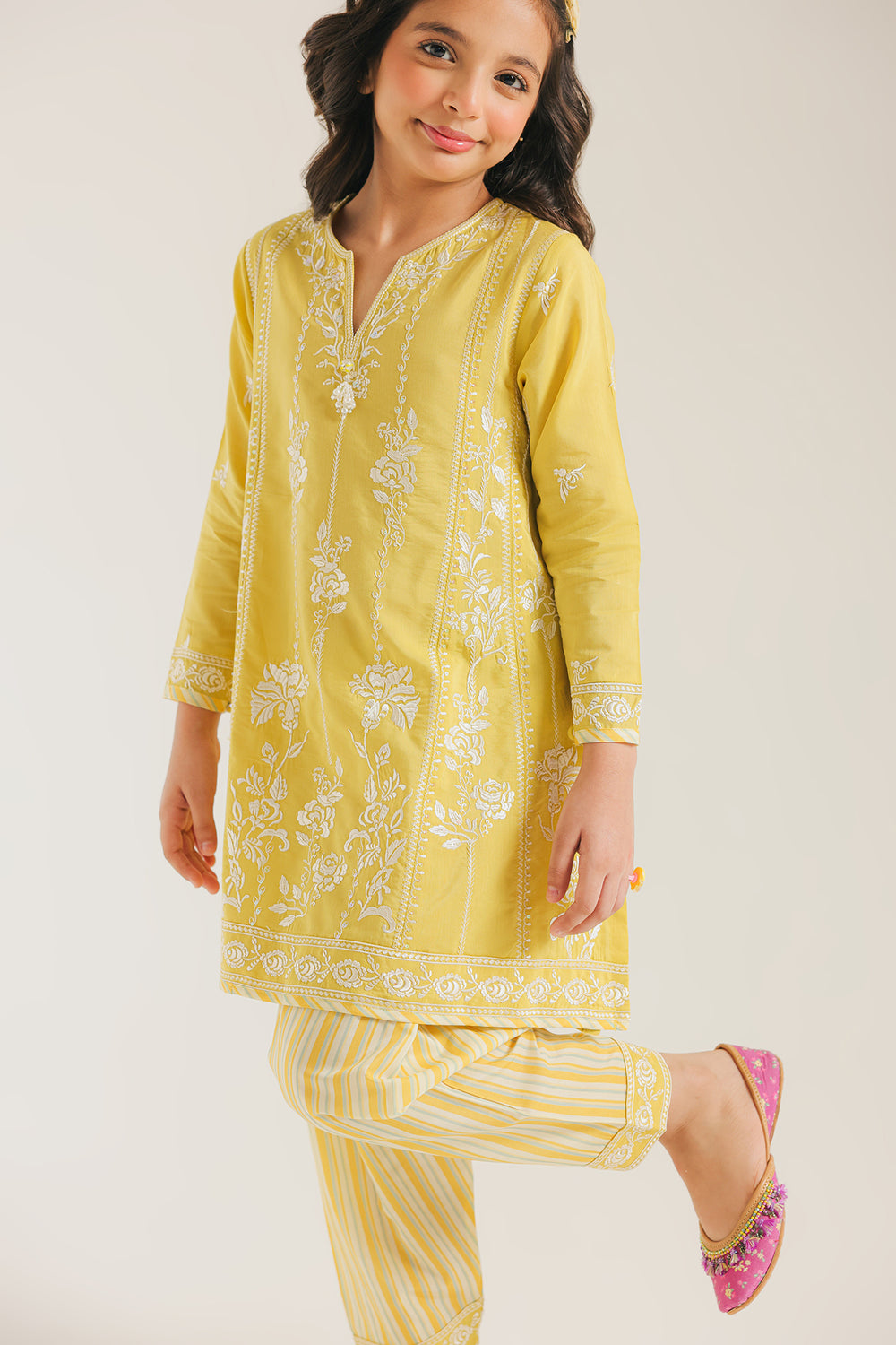 This cheerful embroidered suit is a ray of sunshine for any occasion. The vibrant yellow kurta is beautifully adorned with intricate white embroidery in a delicate floral pattern. It is perfectly paired with striped shalwar that adds a playful and modern touch to the traditional silhouette. This delightful two-piece set is a wonderful choice for a bright and sophisticated look.