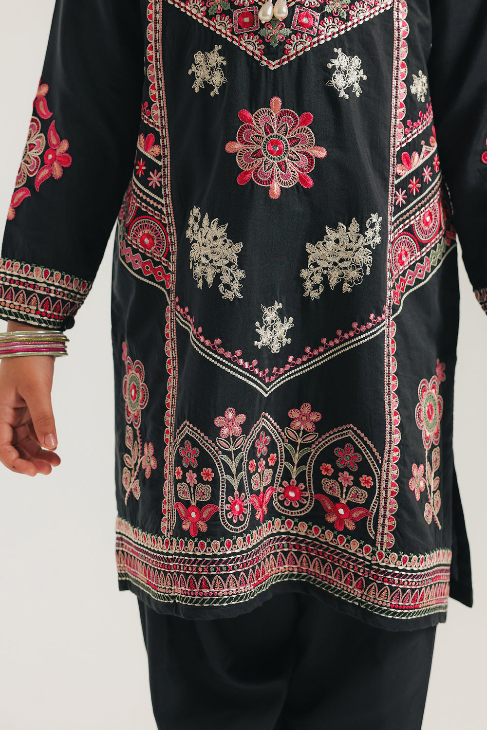 A celebration of bold contrasts, this beautiful suit is a masterpiece of design. The deep black fabric of the long-sleeved tunic is the perfect canvas for the stunning embroidery, which features elaborate floral and geometric patterns in vibrant shades of pink and white. The intricate design flows gracefully down the front and across the sleeves, creating a truly eye-catching look. The suit is completed with simple black shalwar, allowing the richly embroidered top to be the focal point of this elegant ensemble.