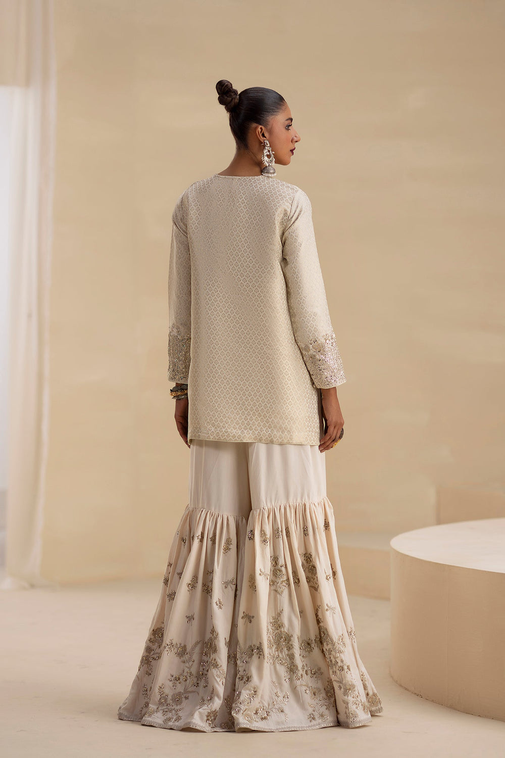 Illuminate the evening in this exquisitely detailed ivory embroidered suit, featuring a short shirt and a magnificent gharara. The straight-cut shirt is crafted from a luxurious off-white fabric with a subtle tonal woven pattern and features a deeply flattering V-neckline. The bodice and full sleeves are richly embellished with intricate gold and silver embroidery and sequin-work, giving it a luminous, festive appeal. The ensemble is completed by a voluminous gharara in a coordinating cream beige hue. The lower tier of the gharara is adorned with delicate, ornate gold thread embroidery and sequin work, creating a majestic, flared silhouette that is ideal for formal weddings or celebratory occasions.