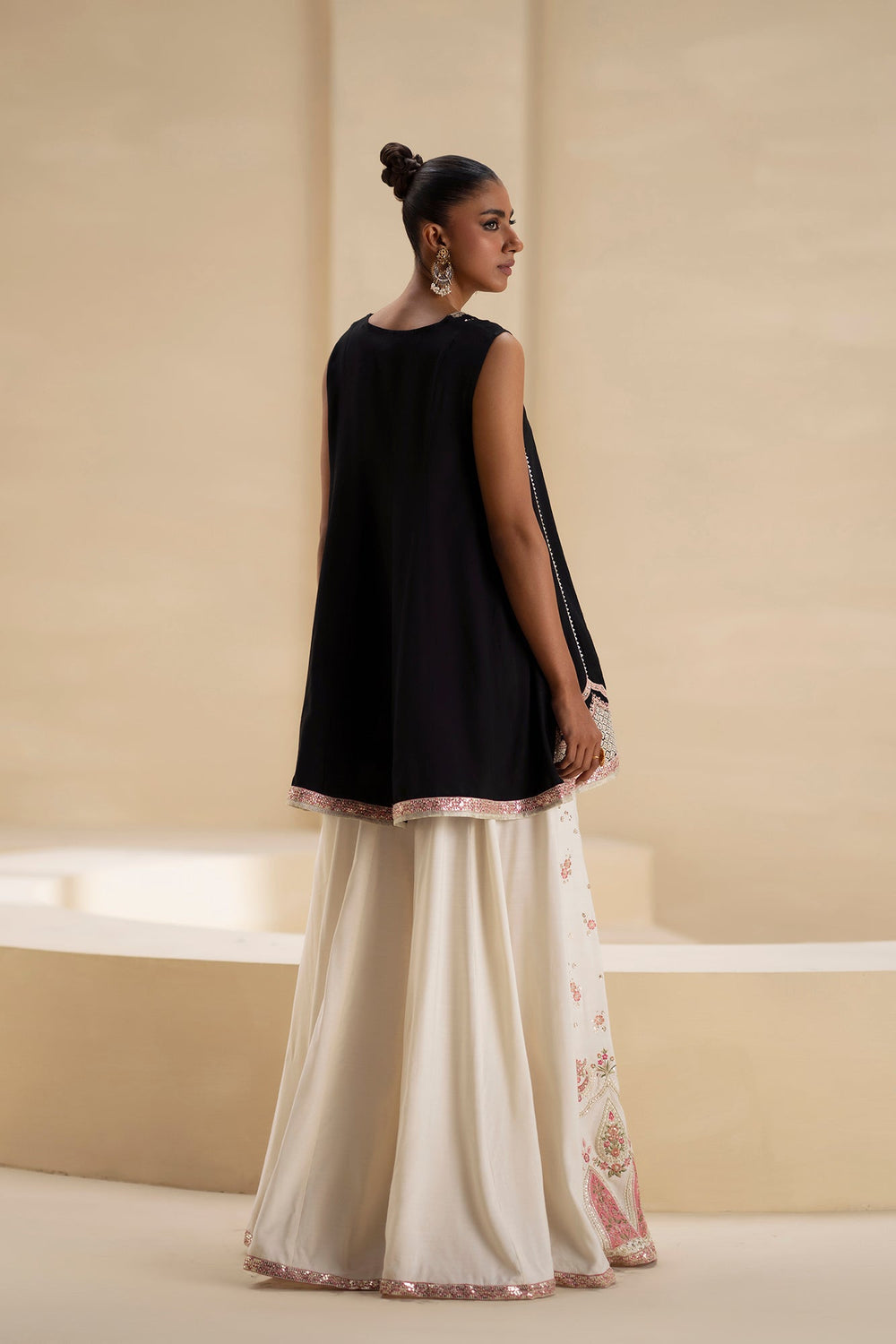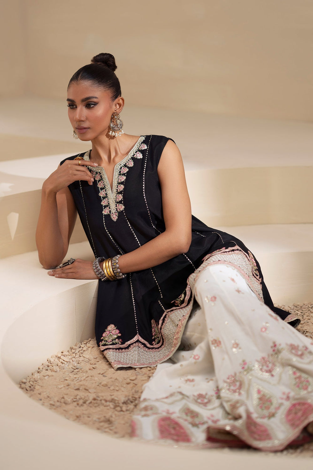 Create a spectacular vision in this striking black and white embroidered suit, featuring a short shirt and a voluminous sharara. The short, A-line shirt is crafted from black fabric and features a delicate V-neckline. The bodice is richly adorned with silver and pink thread embroidery and beadwork, with a stunning border featuring cascading motifs. The ensemble is completed by a magnificent, floor-sweeping sharara in a creamy off-white. The sharara boasts an incredible amount of heavy pink and gold embroidery, especially at the wide hem, which creates a dramatic, celebratory flare. This highly ornate suit offers a perfect blend of high contrast and festive opulence.
