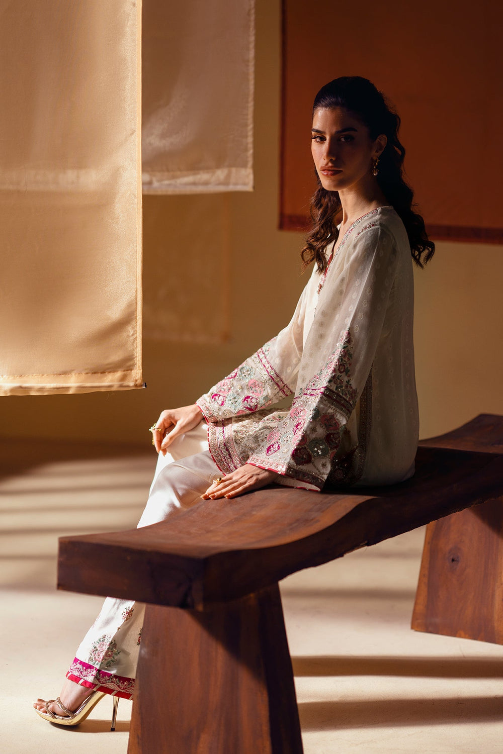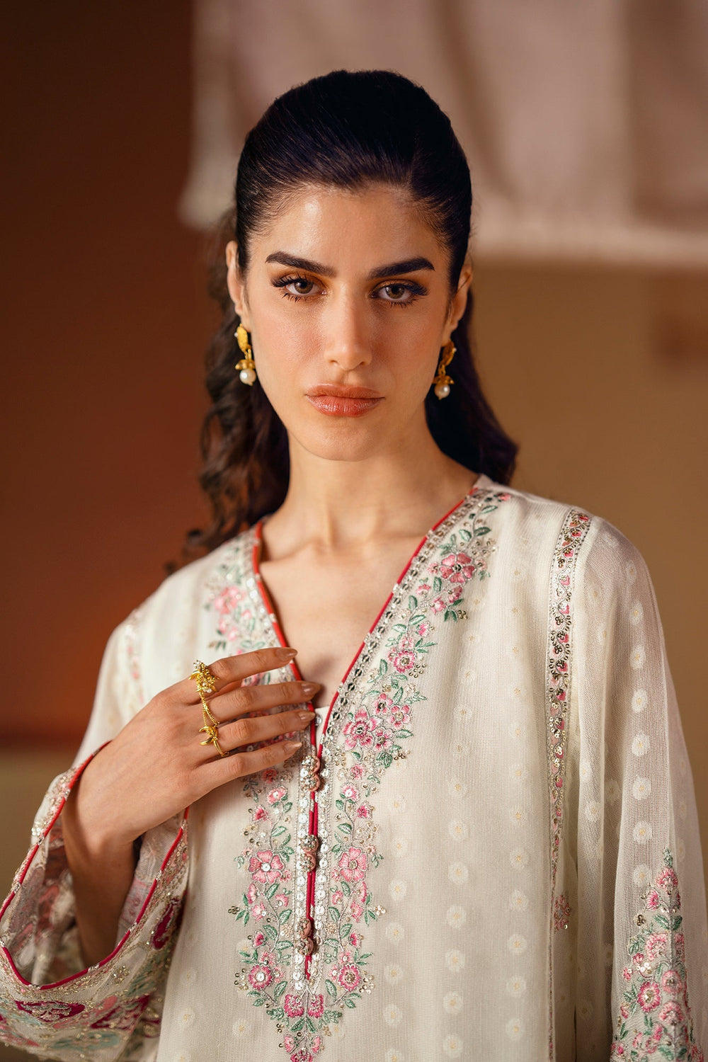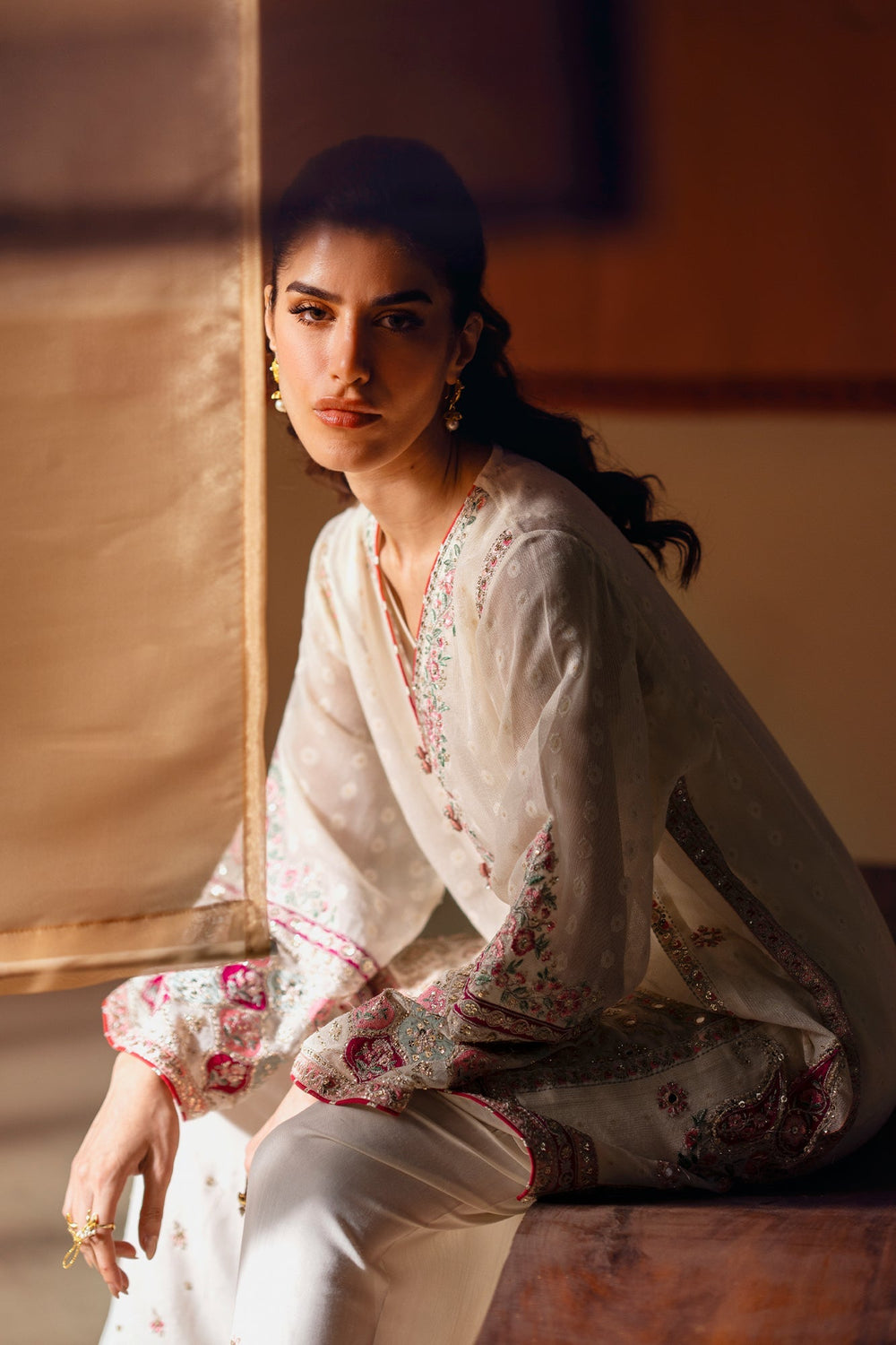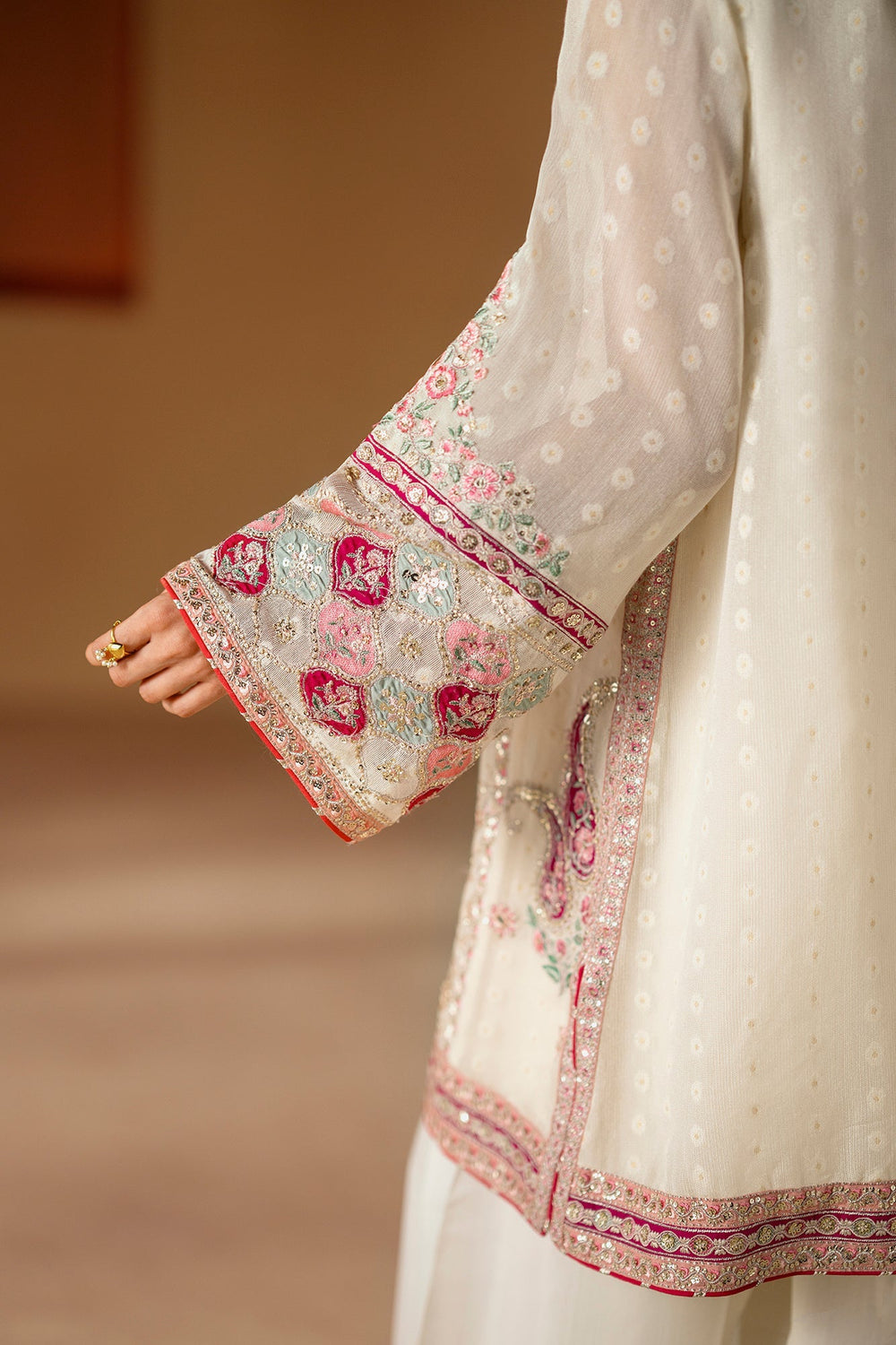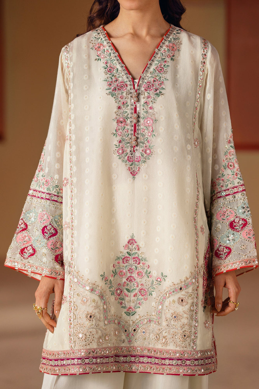 A masterpiece of sophisticated artistry. This stunning 3-piece suit includes an A- line shirt, a shalwar, and a separate inner slip. The shirt, in a soft cream hue, is beautifully adorned with intricate floral embroidery in vibrant shades of pink and green. The farshi shalwar features a matching embroidered border, creating a cohesive and elegant look. This ensemble is a celebration of rich color and captivating craftsmanship, perfect for making a memorable statement.