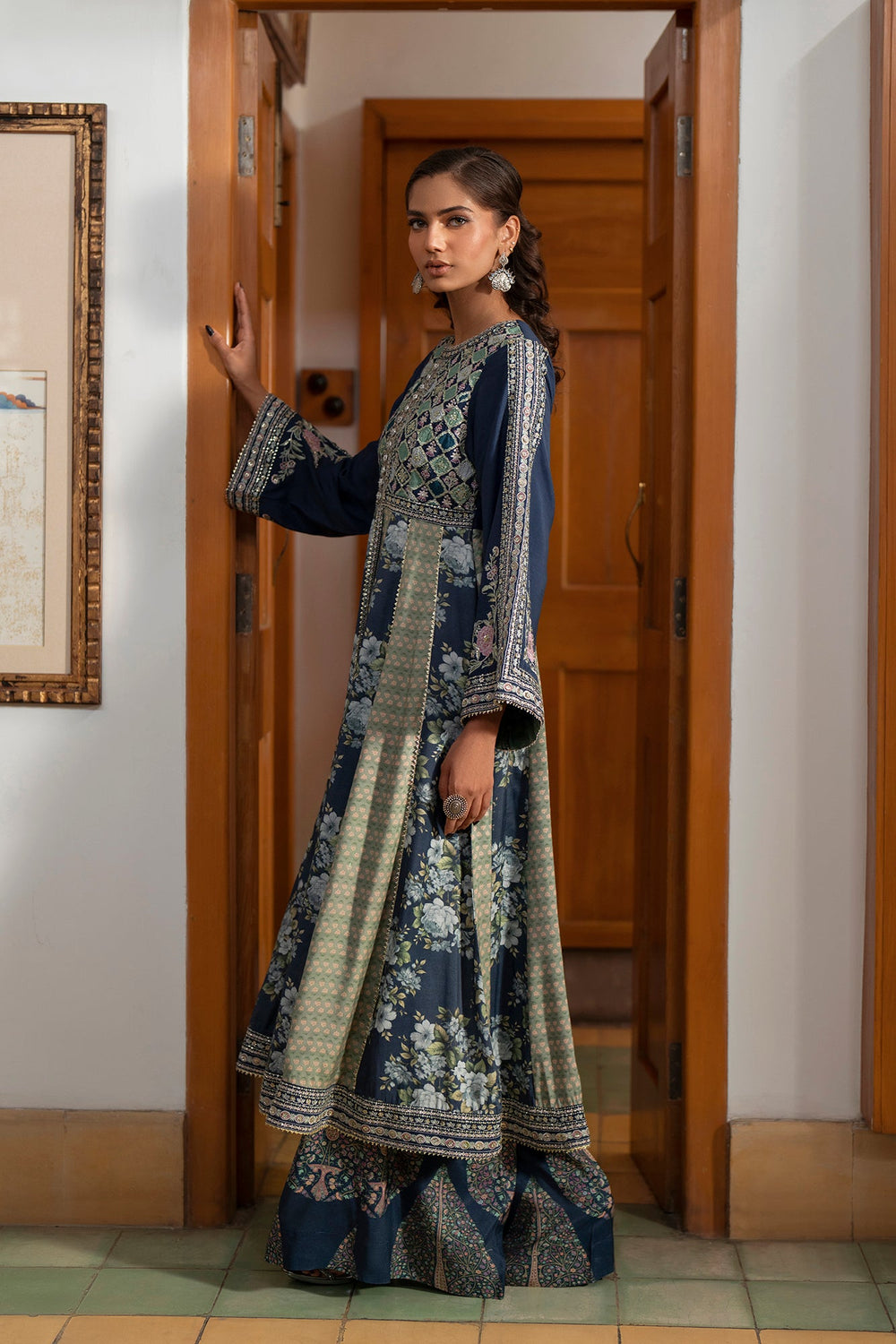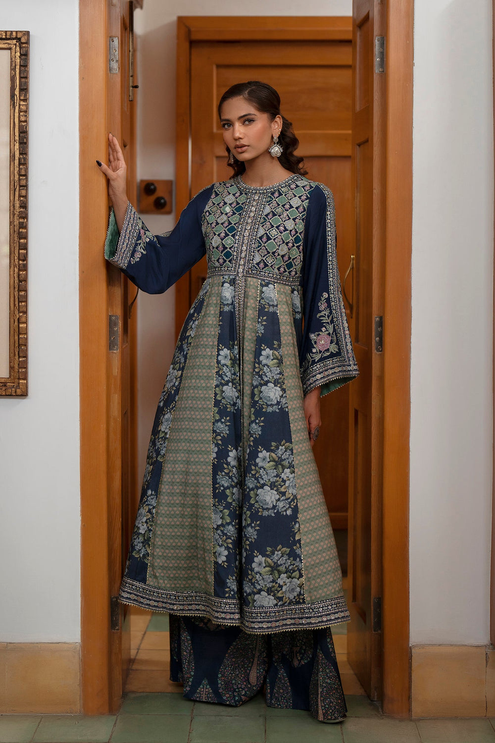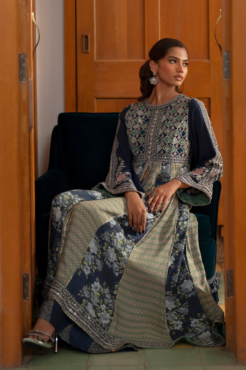 Step into a world of intricate detail with our Artisan Mosaic pishwas. This captivating two-piece ensemble features a long pishwas beautifully adorned with a blend of rich prints and delicate embroidery. Above the waist yoke with button detailing, the upper bodice showcases a stunning mosaic-like pattern, incorporating geometric and floral elements with subtle threadwork and embellishments. The full-length sleeves also feature complementary printed and embroidered details, adding to the outfit's cohesive artistry. Paired with coordinating printed trousers, this set offers a sophisticated and unique look, perfect for festive occasions, cultural events, or when you desire to showcase a refined sense of style with a touch of handcrafted charm.