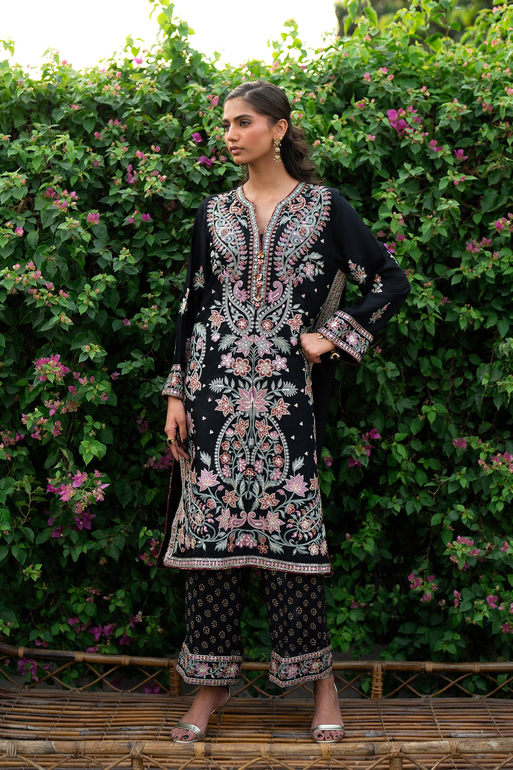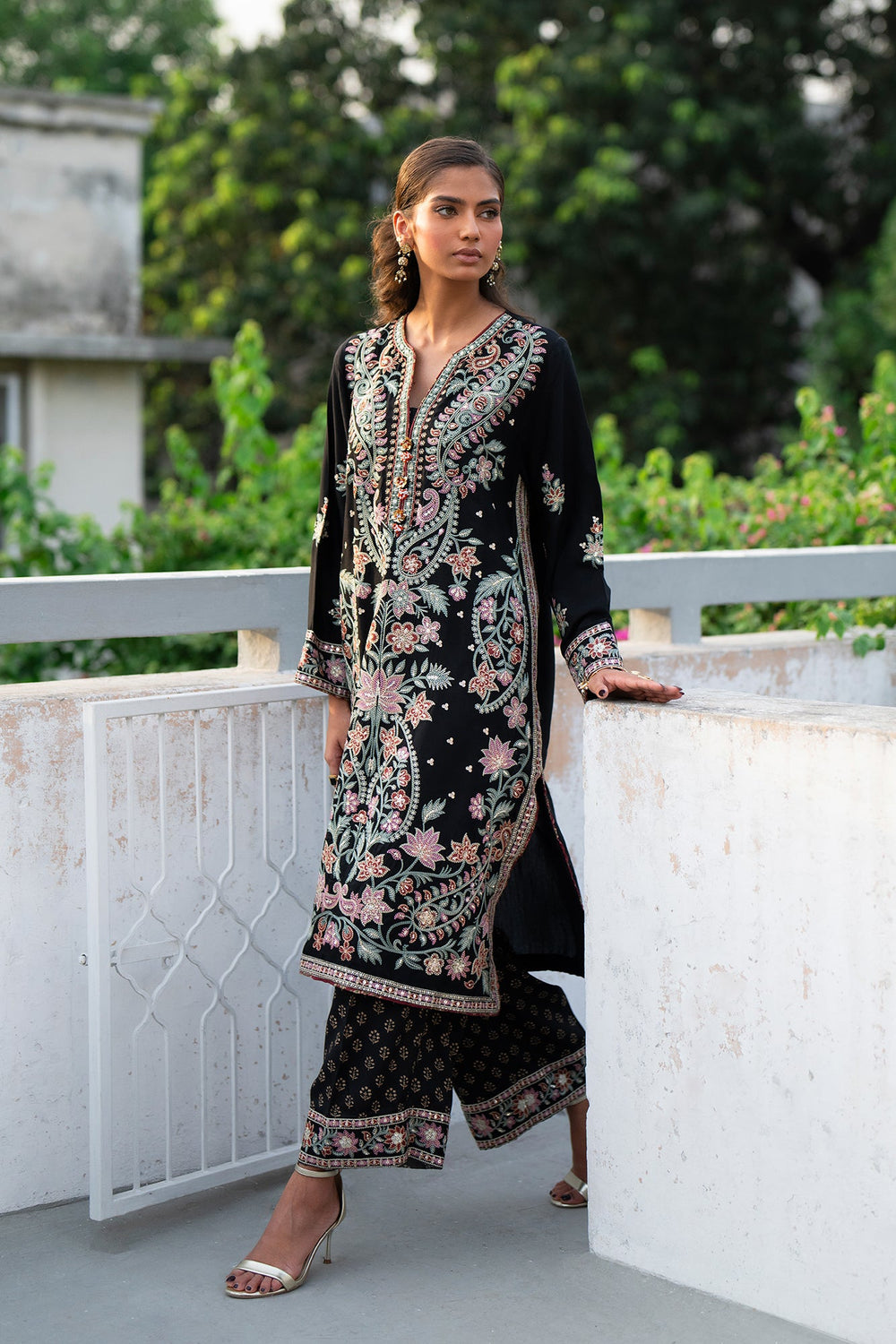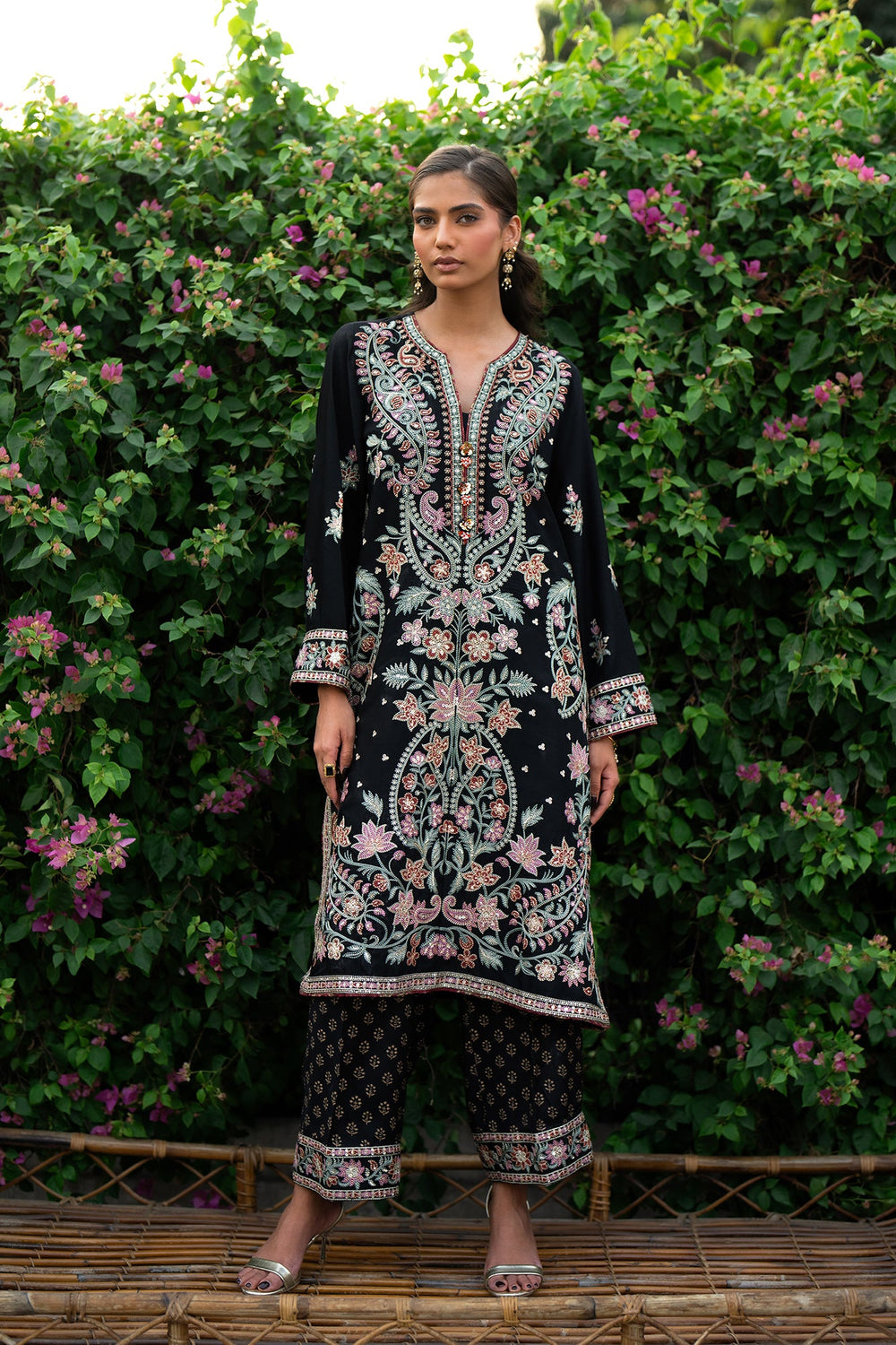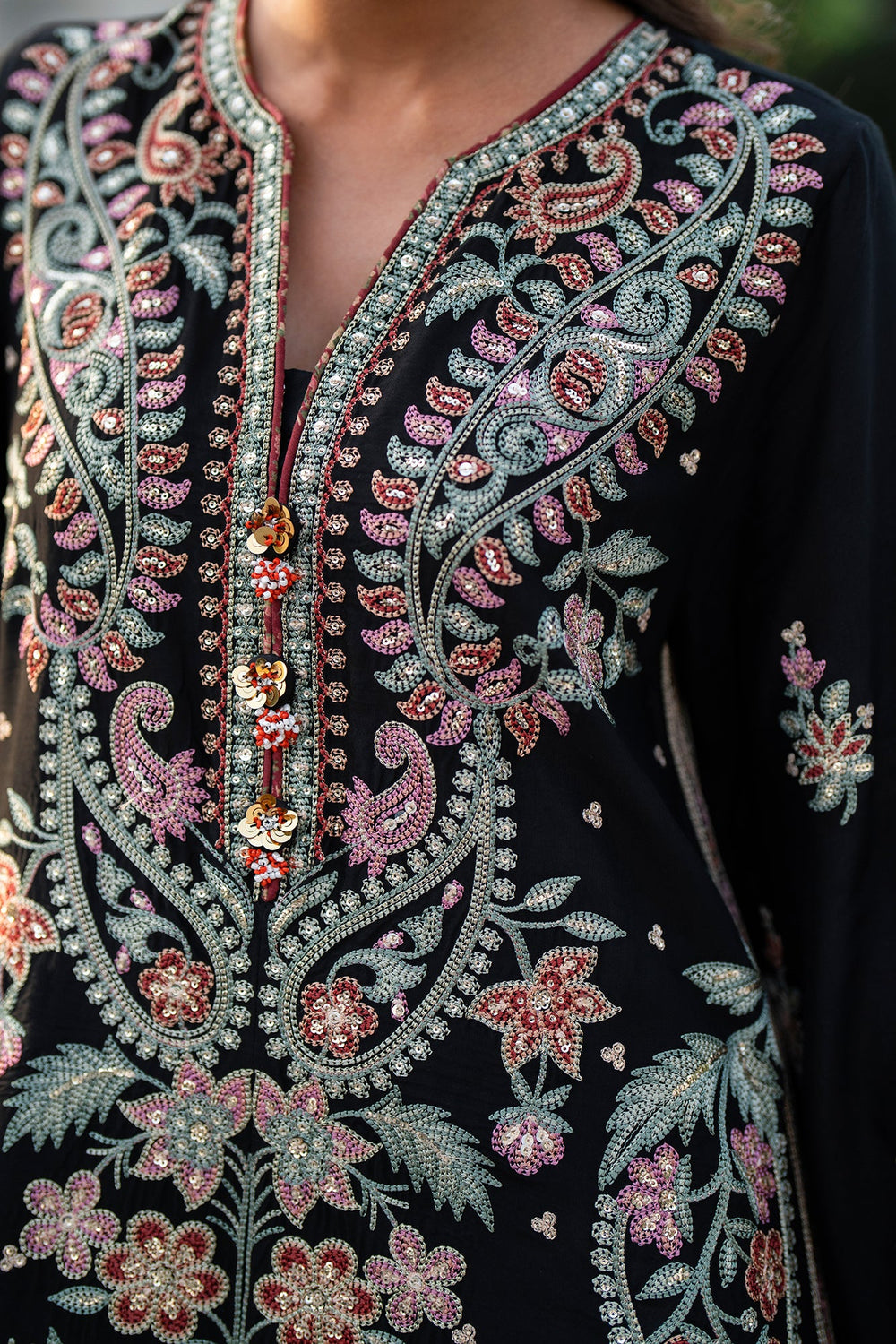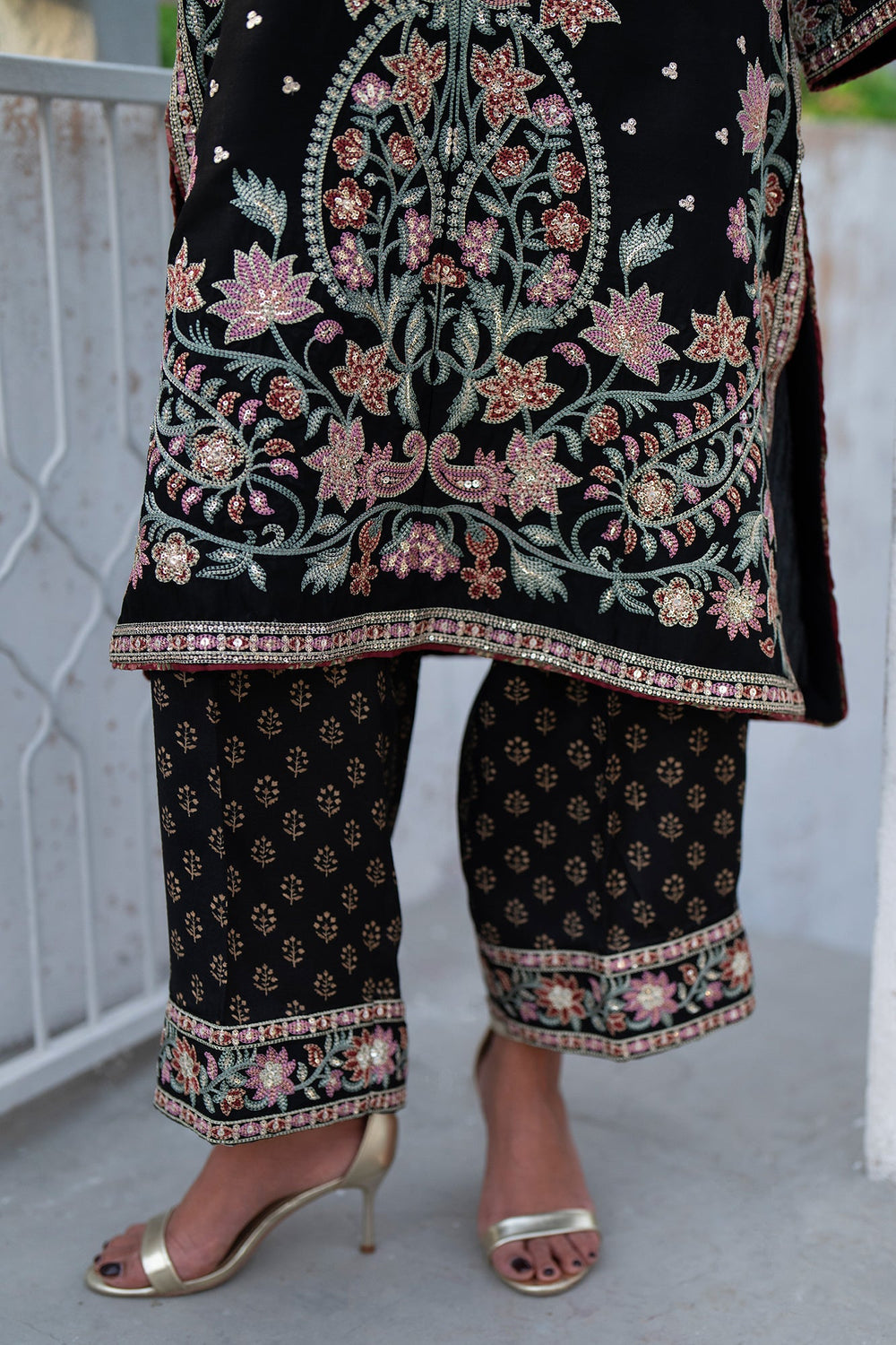 Step into an enchanting garden under the moonlight with our Midnight Meadow raw silk Suit. This two-piece ensemble is a canvas for exquisite floral embroidery in a vibrant palette of pinks, greens, and creams. The intricate threadwork blooms across the shirt, adorning the neckline, sleeves, and hem with a rich tapestry of botanical beauty. The kurta features a flattering silhouette and comfortable full-length sleeves, perfect for warmer climates. Paired with coordinating black trousers, also embellished with delicate embroidery along the cuffs, this suit offers a sophisticated and cohesive look.