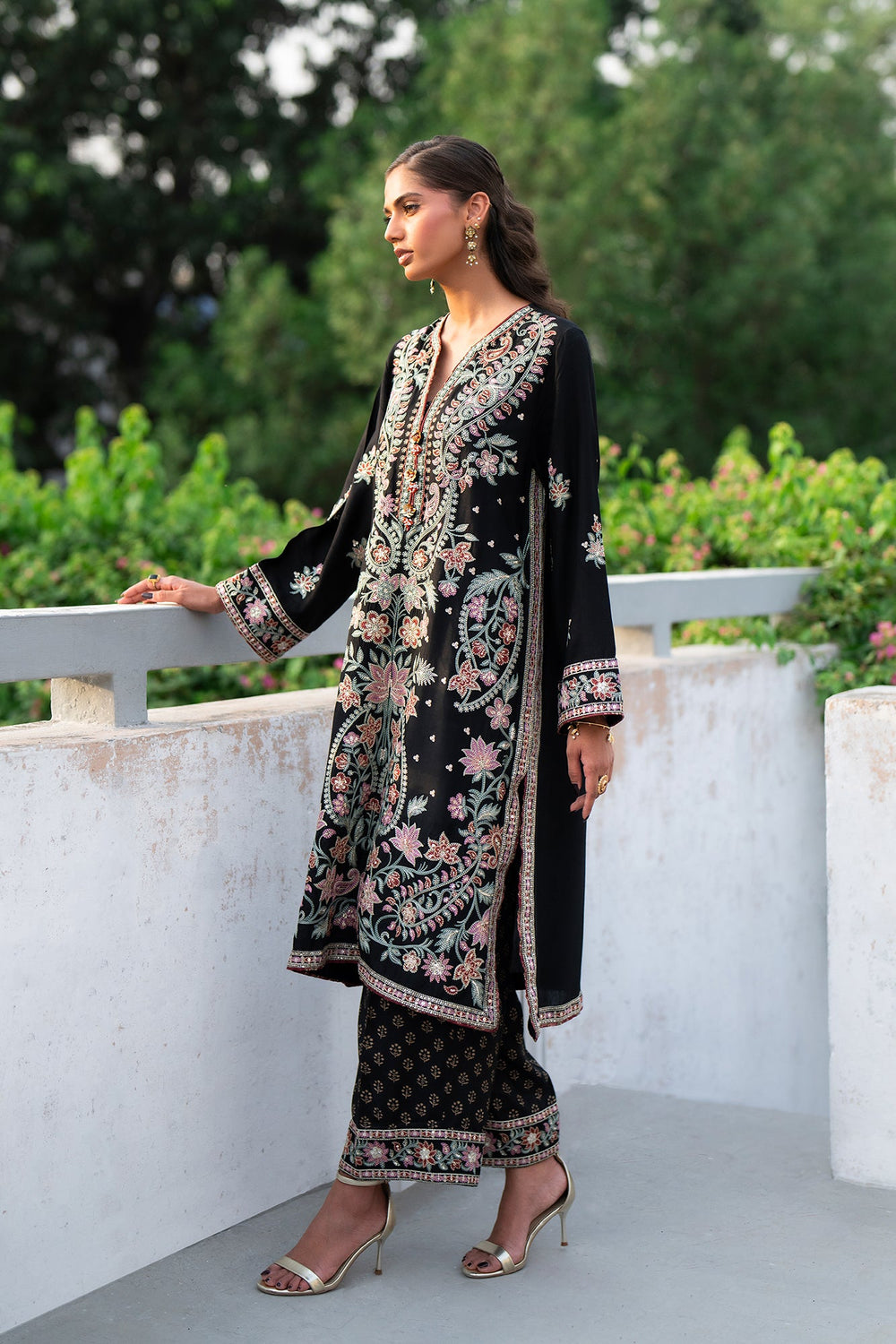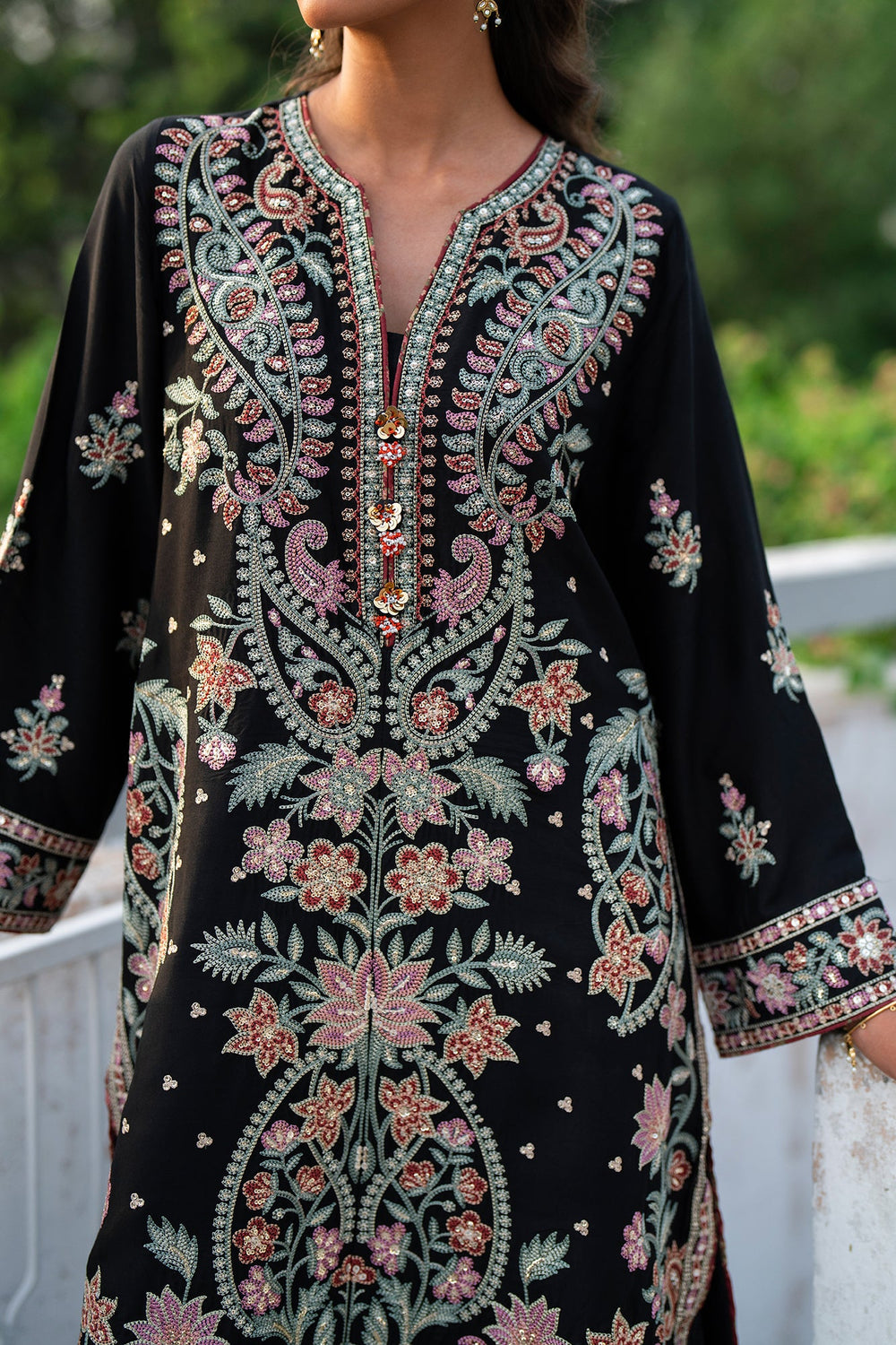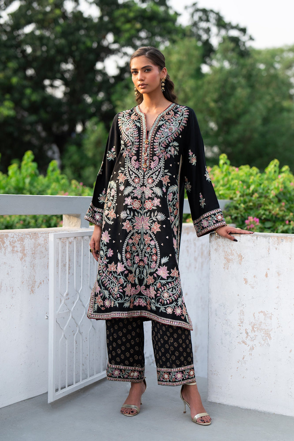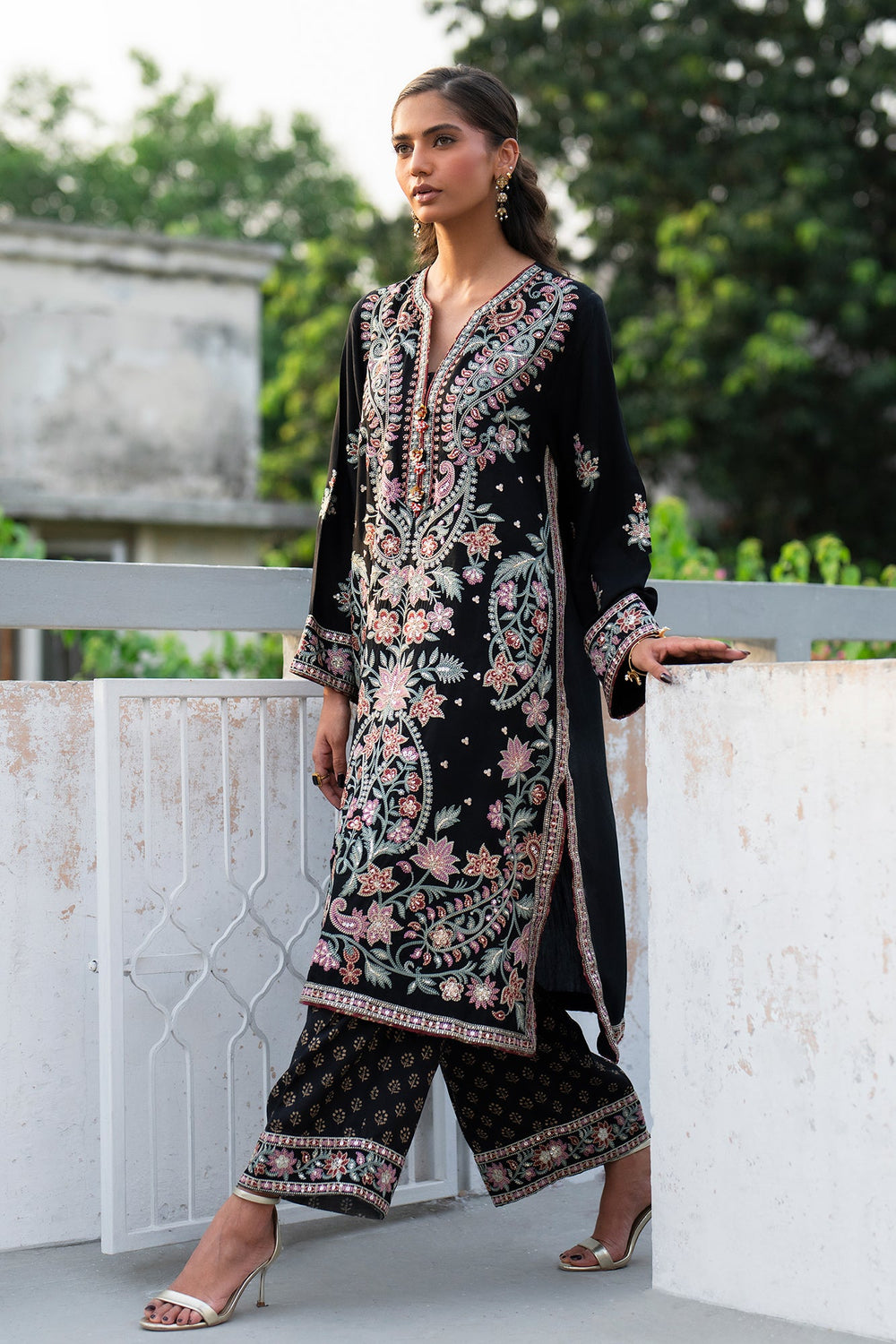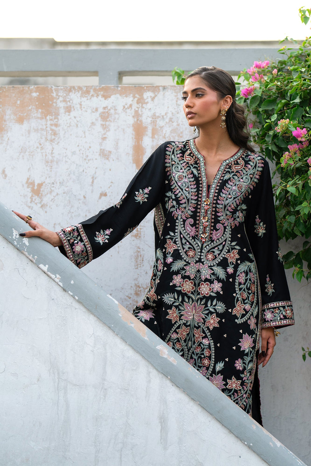 Step into an enchanting garden under the moonlight with our Midnight Meadow raw silk Suit. This two-piece ensemble is a canvas for exquisite floral embroidery in a vibrant palette of pinks, greens, and creams. The intricate threadwork blooms across the shirt, adorning the neckline, sleeves, and hem with a rich tapestry of botanical beauty. The kurta features a flattering silhouette and comfortable full-length sleeves, perfect for warmer climates. Paired with coordinating black trousers, also embellished with delicate embroidery along the cuffs, this suit offers a sophisticated and cohesive look.