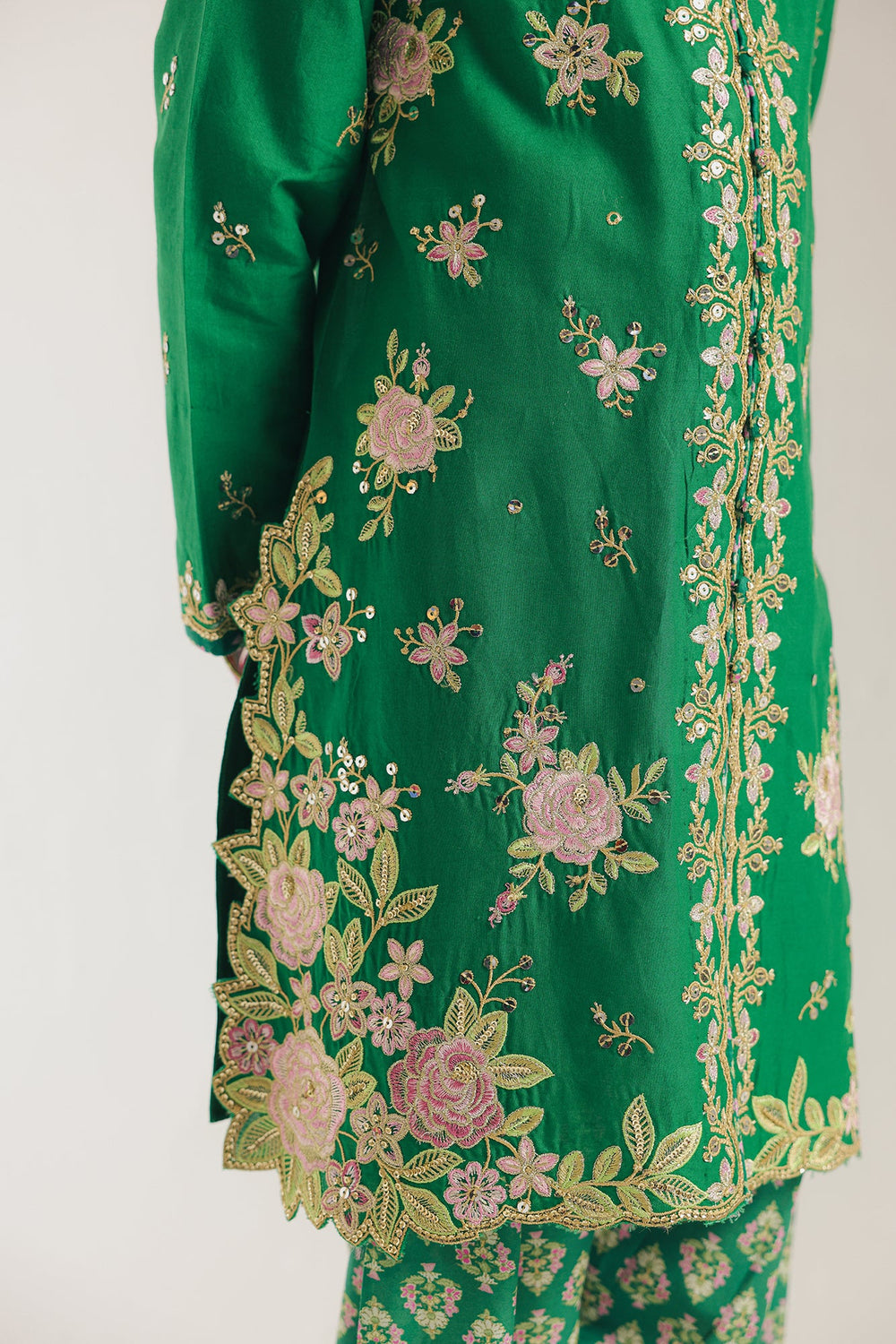 Adorn her in this vibrant green embroidered suit. This beautiful two-piece set features a kurti with intricate floral embroidery and shimmering embellishments around the neckline, creating a sophisticated and festive look. The suit is completed with matching printed shalwar with embroidered hem, making it a perfect ensemble for a special occasion or a celebration.