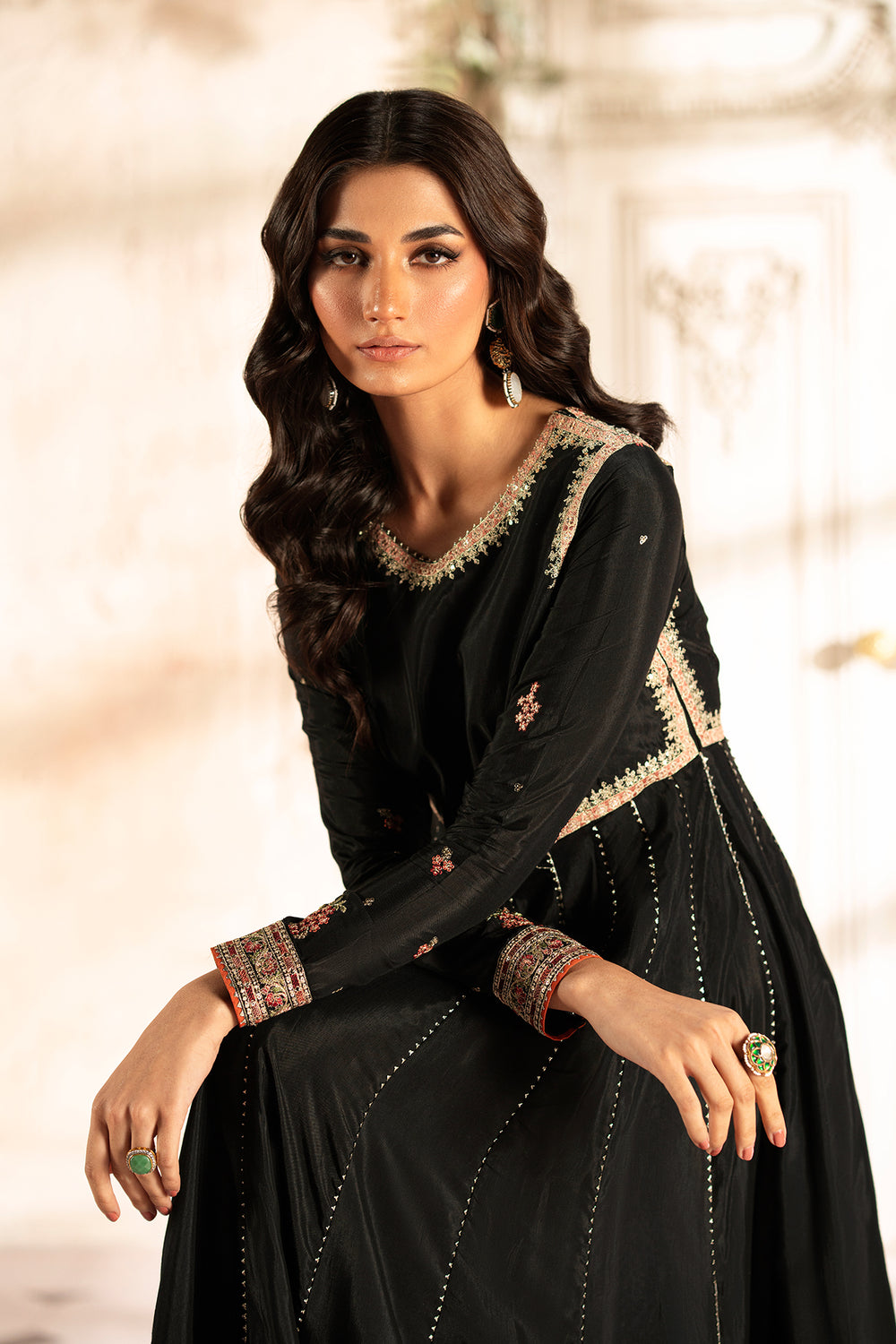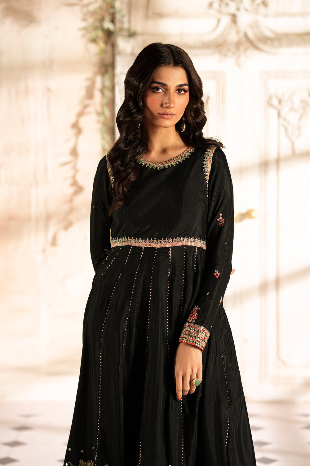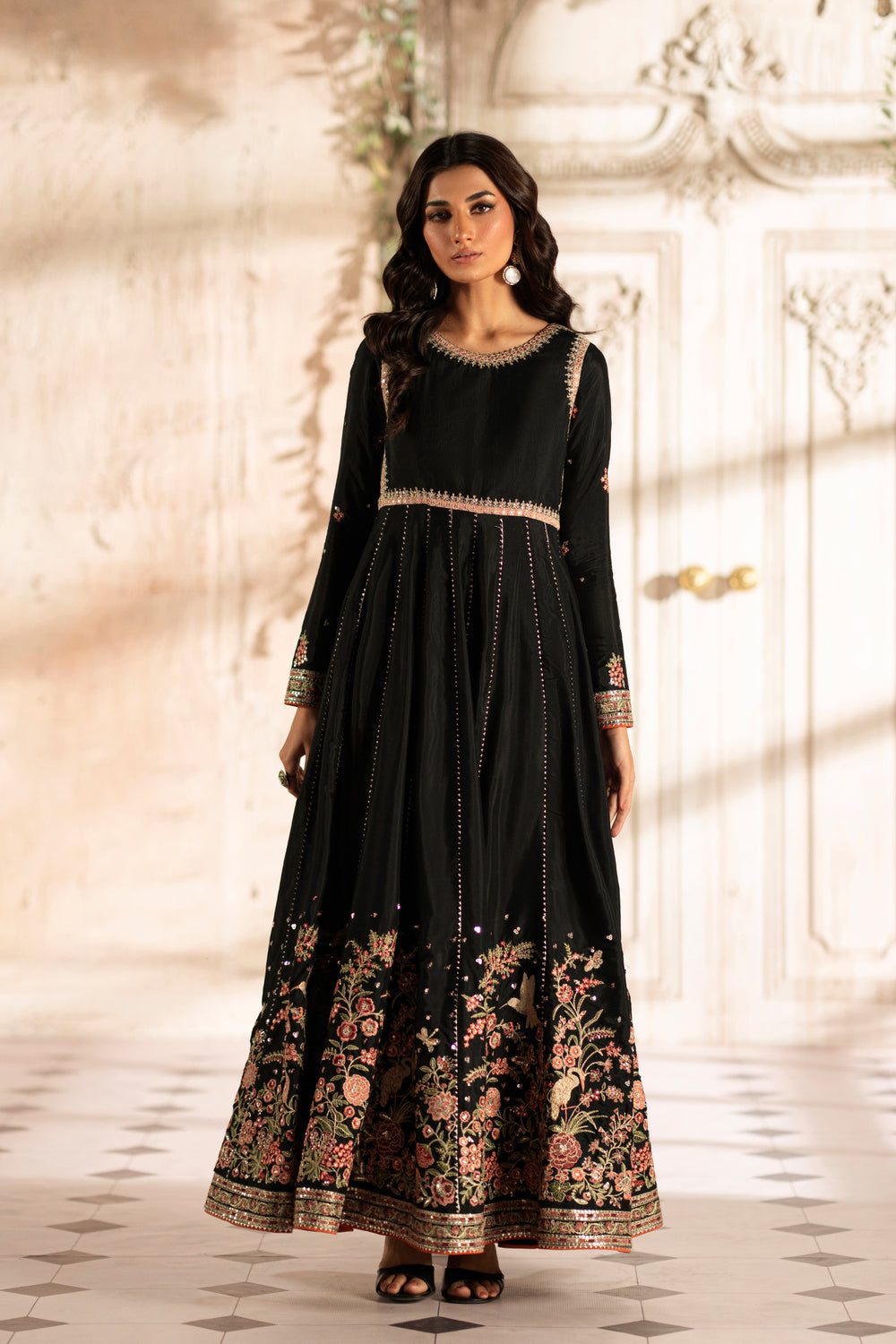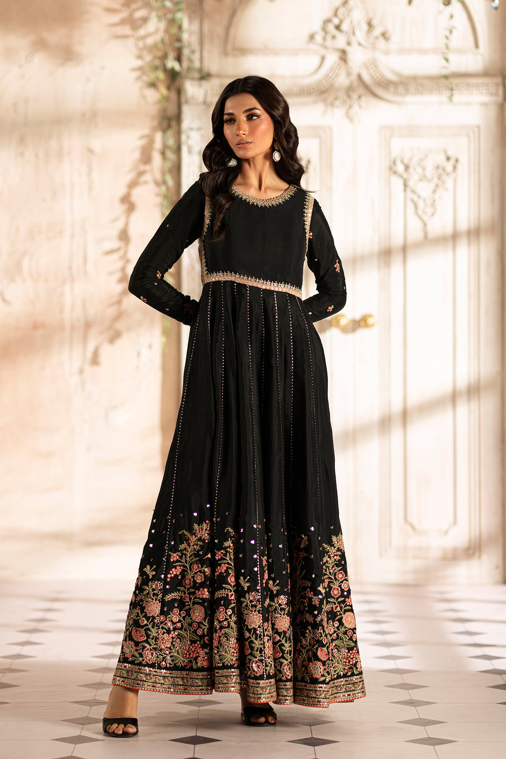 This exquisite pishwas is designed with panels below yoke and features an elongated silhouette, adding a touch of modernity to its timeless elegance. The garment boasts a striking black color and is delicately decorated with intricate floral embroidery, creating a luxurious appearance that is accentuated by dazzling embellishments. Ideal for any festive occasion, this outfit truly makes a statement.