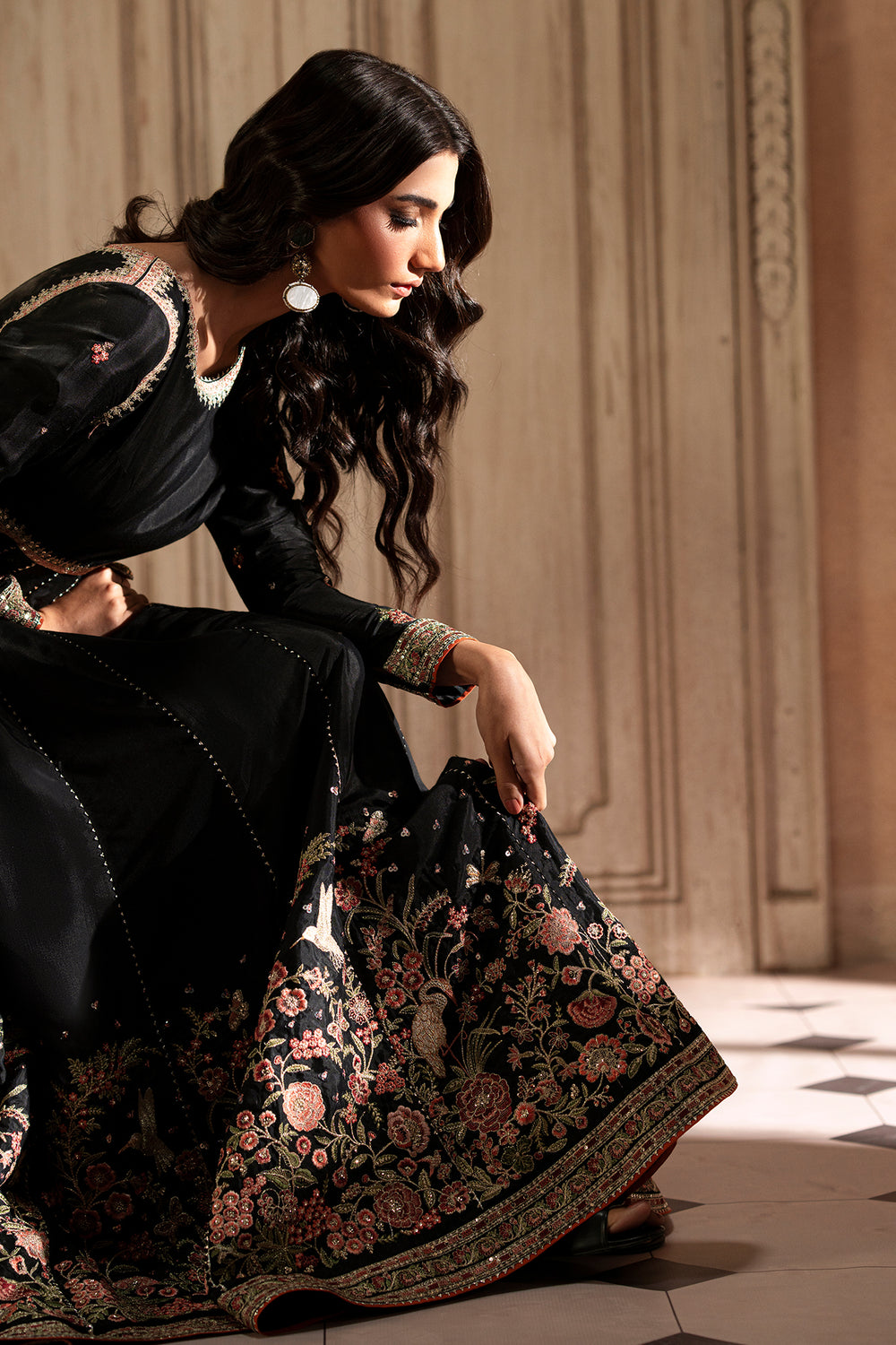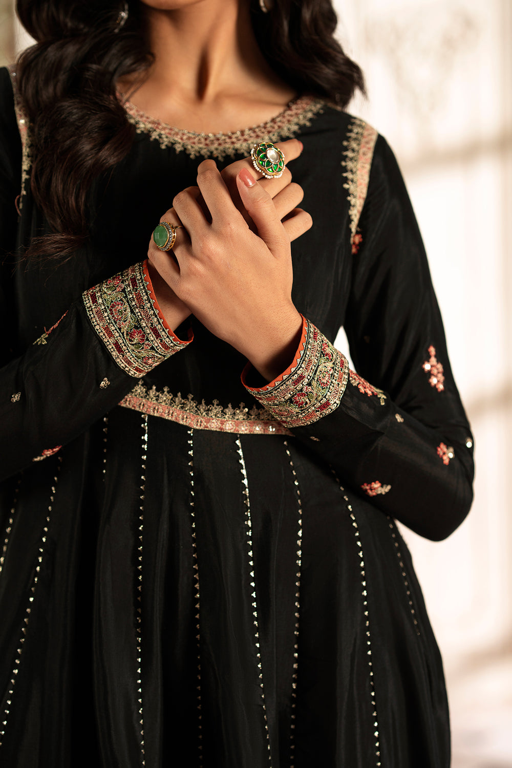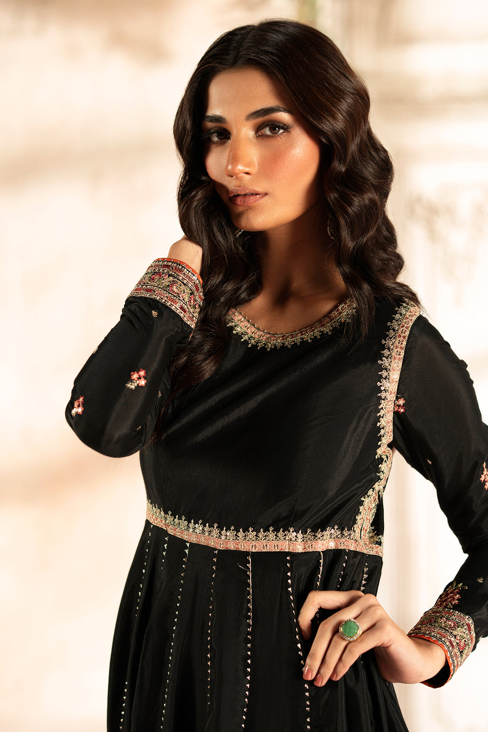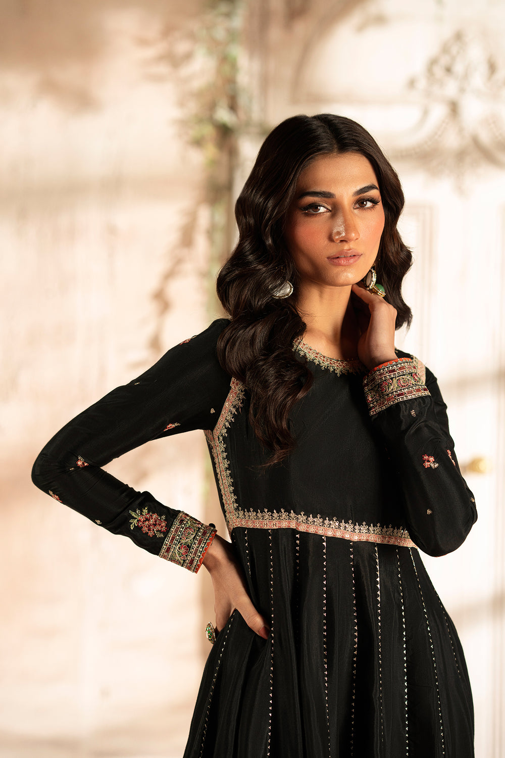 This exquisite pishwas is designed with panels below yoke and features an elongated silhouette, adding a touch of modernity to its timeless elegance. The garment boasts a striking black color and is delicately decorated with intricate floral embroidery, creating a luxurious appearance that is accentuated by dazzling embellishments. Ideal for any festive occasion, this outfit truly makes a statement.