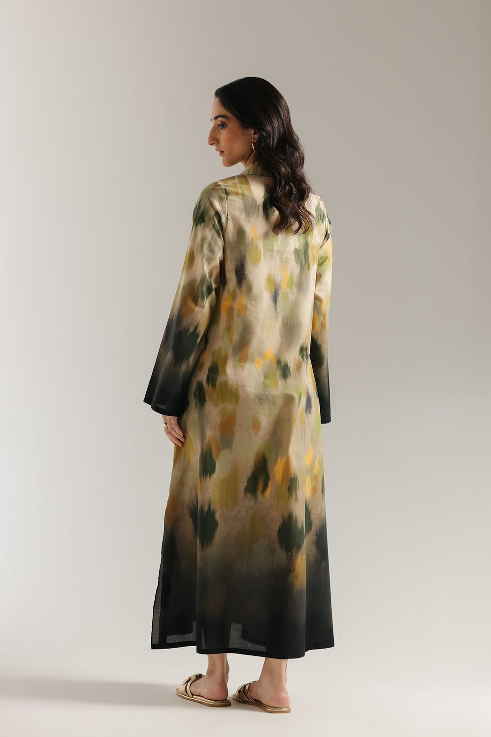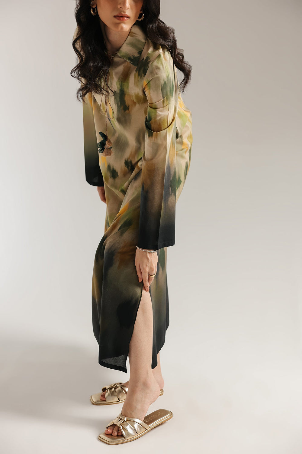 A masterpiece of abstract artistry. This stunning long dress features a beautiful print in a captivating blend of earthy tones, including beige, brown, and hints of green and yellow. The unique, flowing silhouette is complemented by contrasting black cuffs at the sleeves and tassels at the neckline. This ensemble is a celebration of modern design and bohemian elegance.