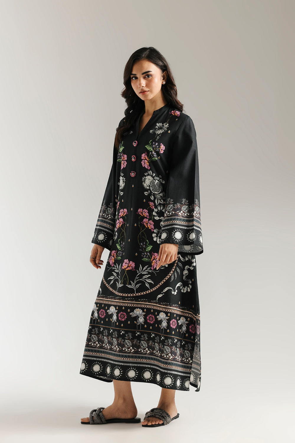 This beautiful long dress features a striking print against a classic black background. The design showcases an elegant mix of floral and geometric motifs in a harmonious palette of soft pinks, white, and earthy tones. The ban neckline with slit is enhanced with delicate accents, adding a touch of sophistication. With its flowing silhouette and comfortable fit, this versatile dress is perfect for making a statement at any evening event or special occasion.