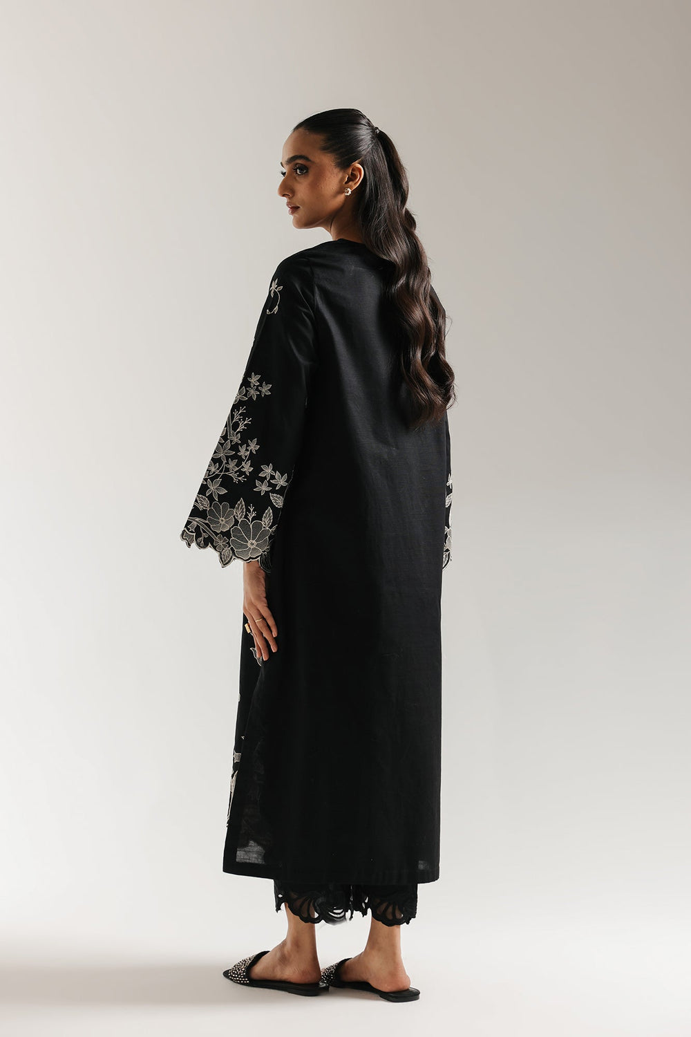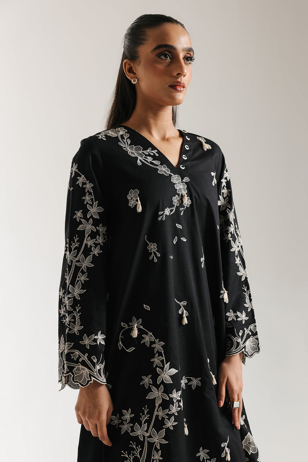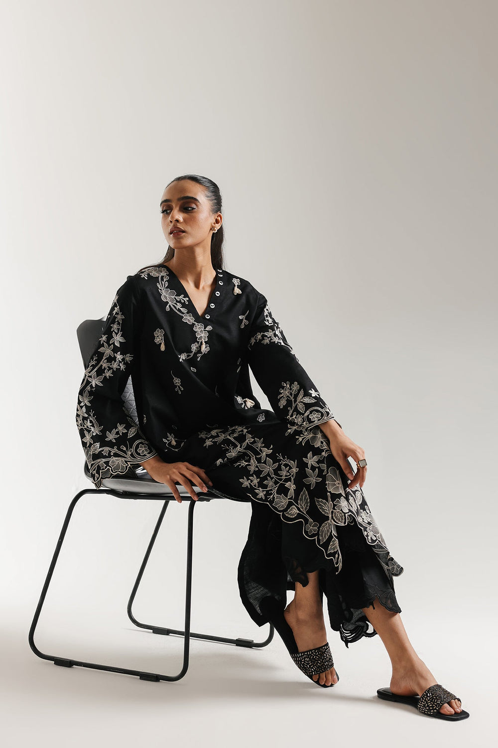 Step into captivating elegance with this long, black embroidered shirt. This flowy, long-sleeved shirt is crafted from a black fabric and features exquisite white thread embroidery in a detailed floral vine motif that trails gracefully from the yoke down to the scalloped hem. The V-slit neckline is accented with small white accents, and the wide sleeves are finished with coordinating embroidered detail, making this a stunning statement piece for any sophisticated occasion.