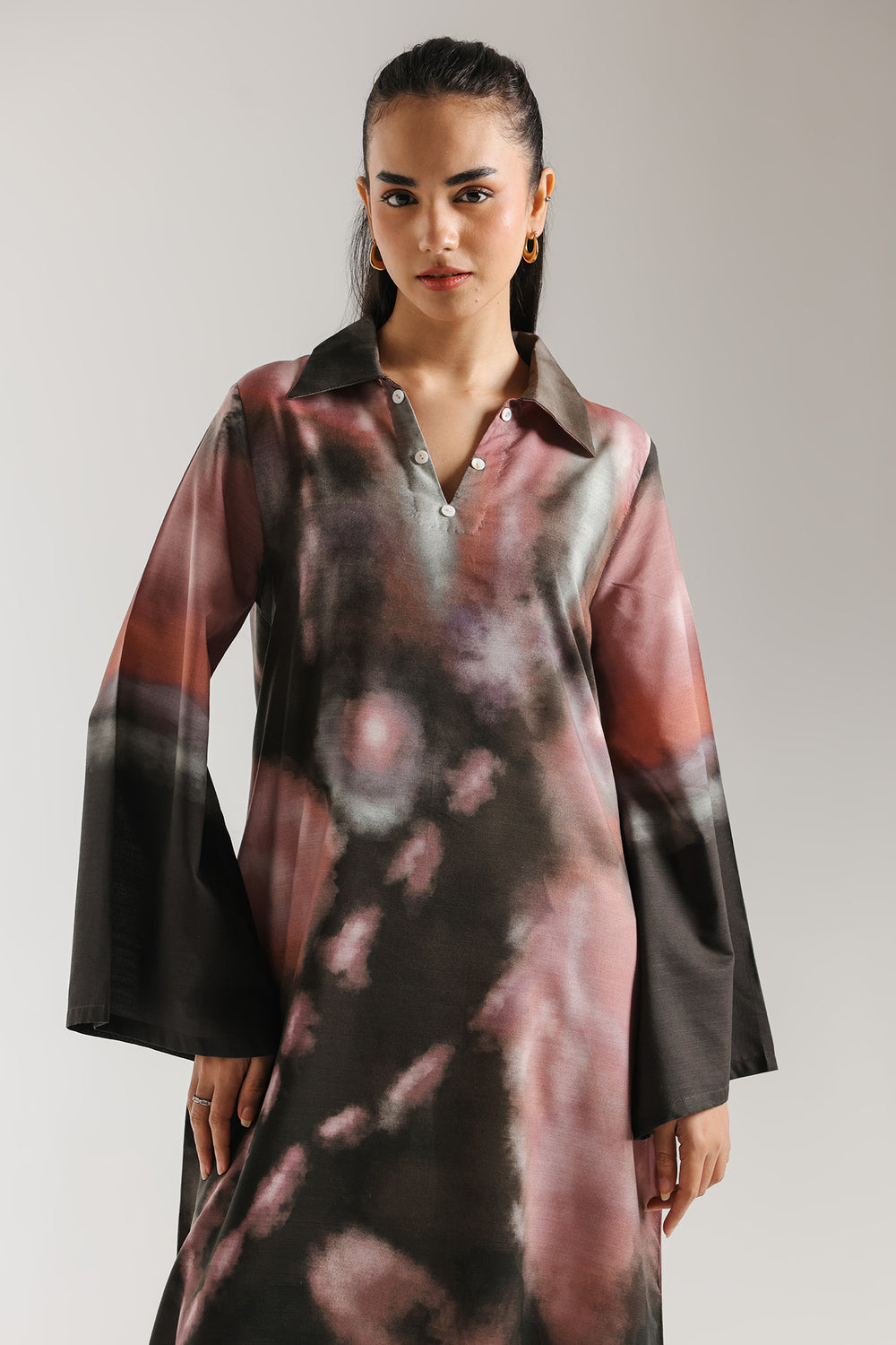 Embrace a look of avant-garde etherealism with this stunning floor-length kaftan, featuring a dramatic, large-scale abstract print that mimics the beauty of a celestial garden in bloom. The garment serves as a dark, fluid canvas for sprawling washes of dusty rose, charcoal, and soft lilac, creating a dreamlike watercolor effect that is both bold and sophisticated. Designed with a structured collar and a sharp V-neckline, the silhouette balances tailored precision with the airy freedom of voluminous bell sleeves and a sweeping straight-cut frame. Whether worn for an upscale evening social or an elegant creative gathering, this kaftan offers a presence that is undeniably artistic and effortlessly chic.
