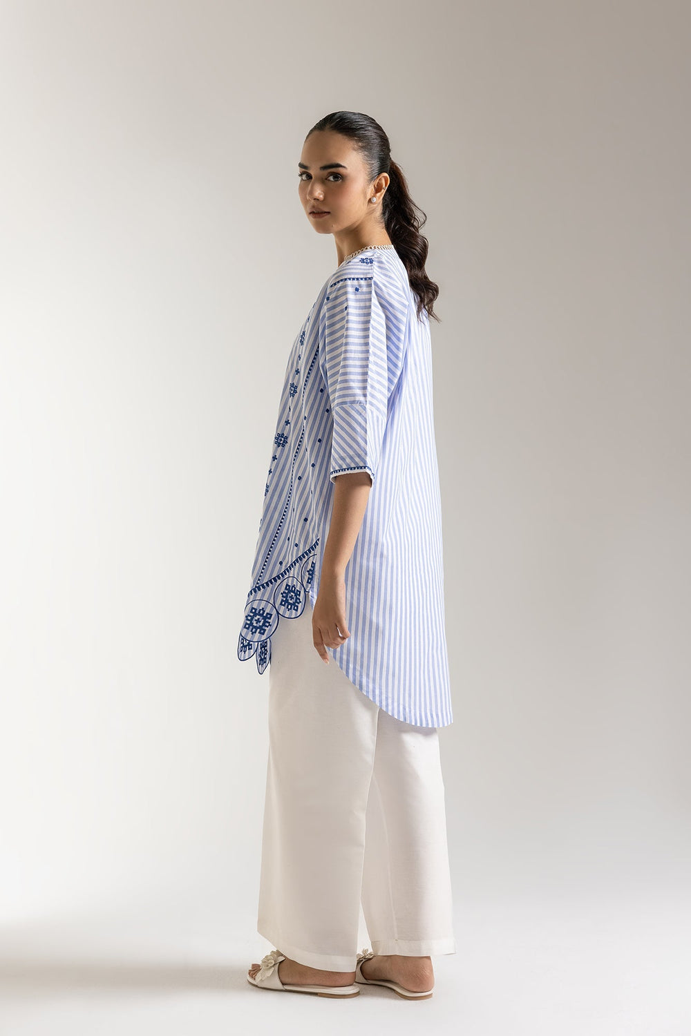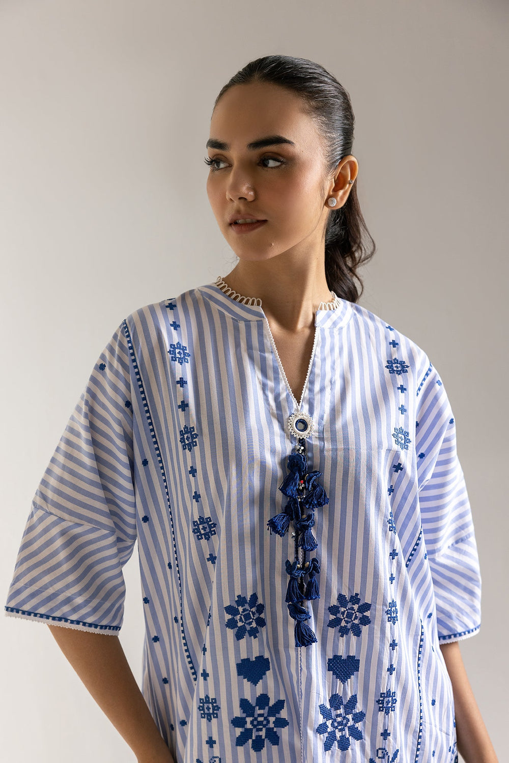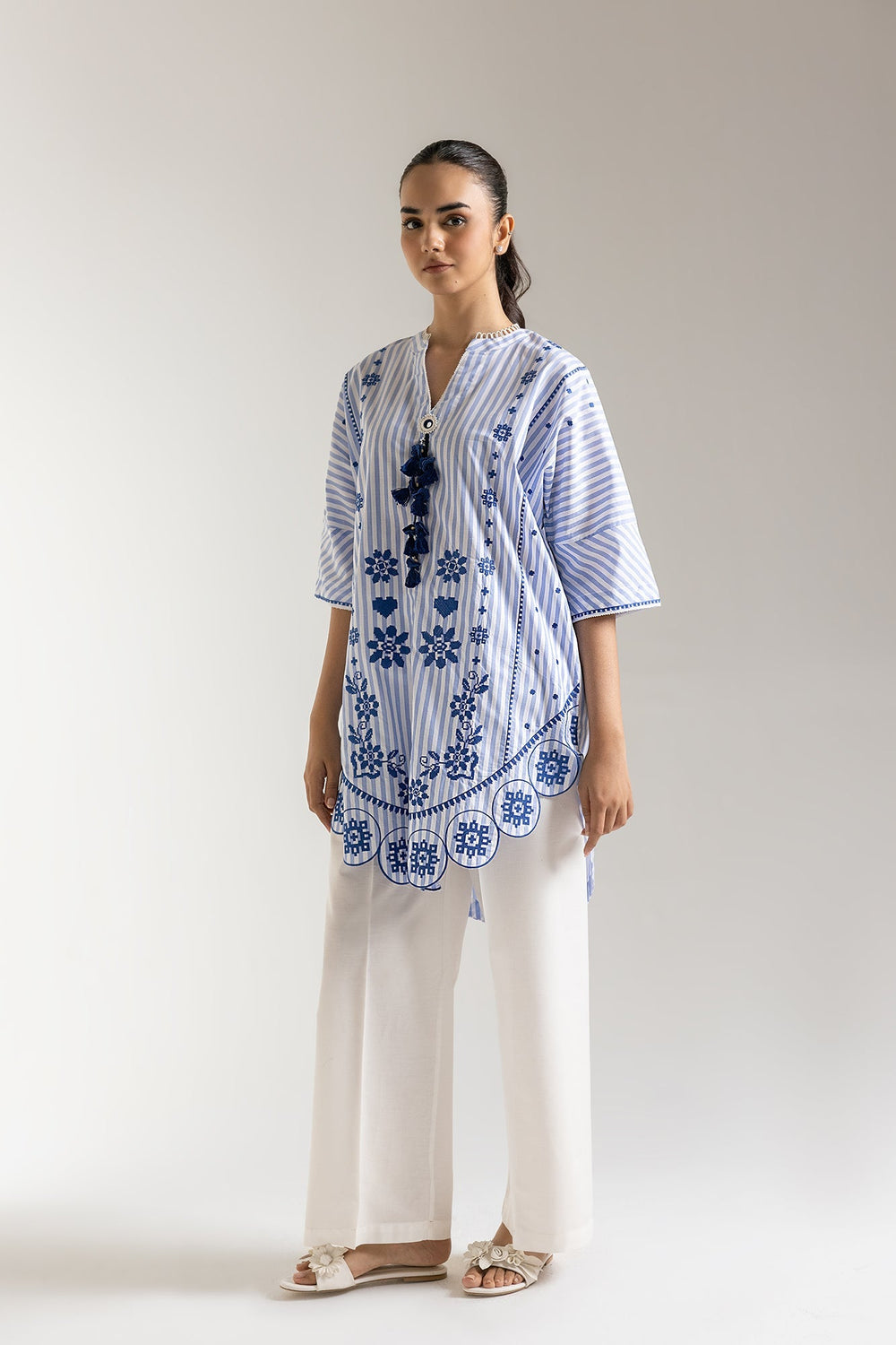 Embrace the refreshing charm of our azure horizon tunic, a perfect blend of classic stripes and intricate artistry. This captivating piece features crisp white and serene blue stripes, beautifully contrasted by detailed blue floral and geometric embroidery that gracefully adorns the front and hem. The comfortable, relaxed fit and stylish silhouette make it an ideal choice for navigating the warm days, offering both breathable comfort and sophisticated flair. Complete with playful tassel details at the neckline, this tunic pairs seamlessly with white trousers for a look that's effortlessly chic and perfectly suited for any occasion this summer.