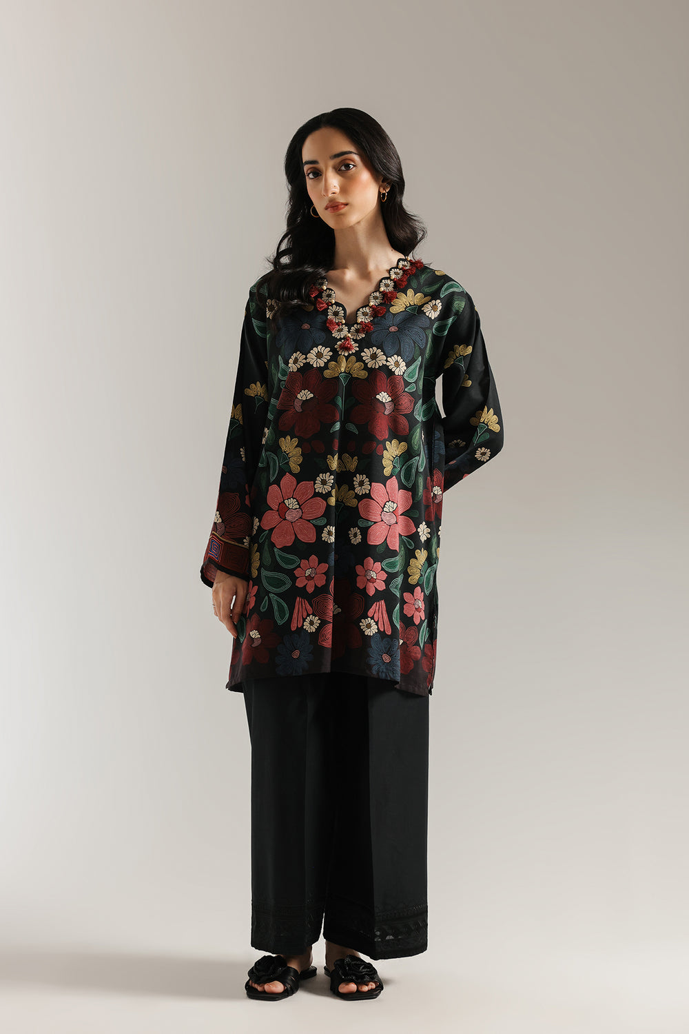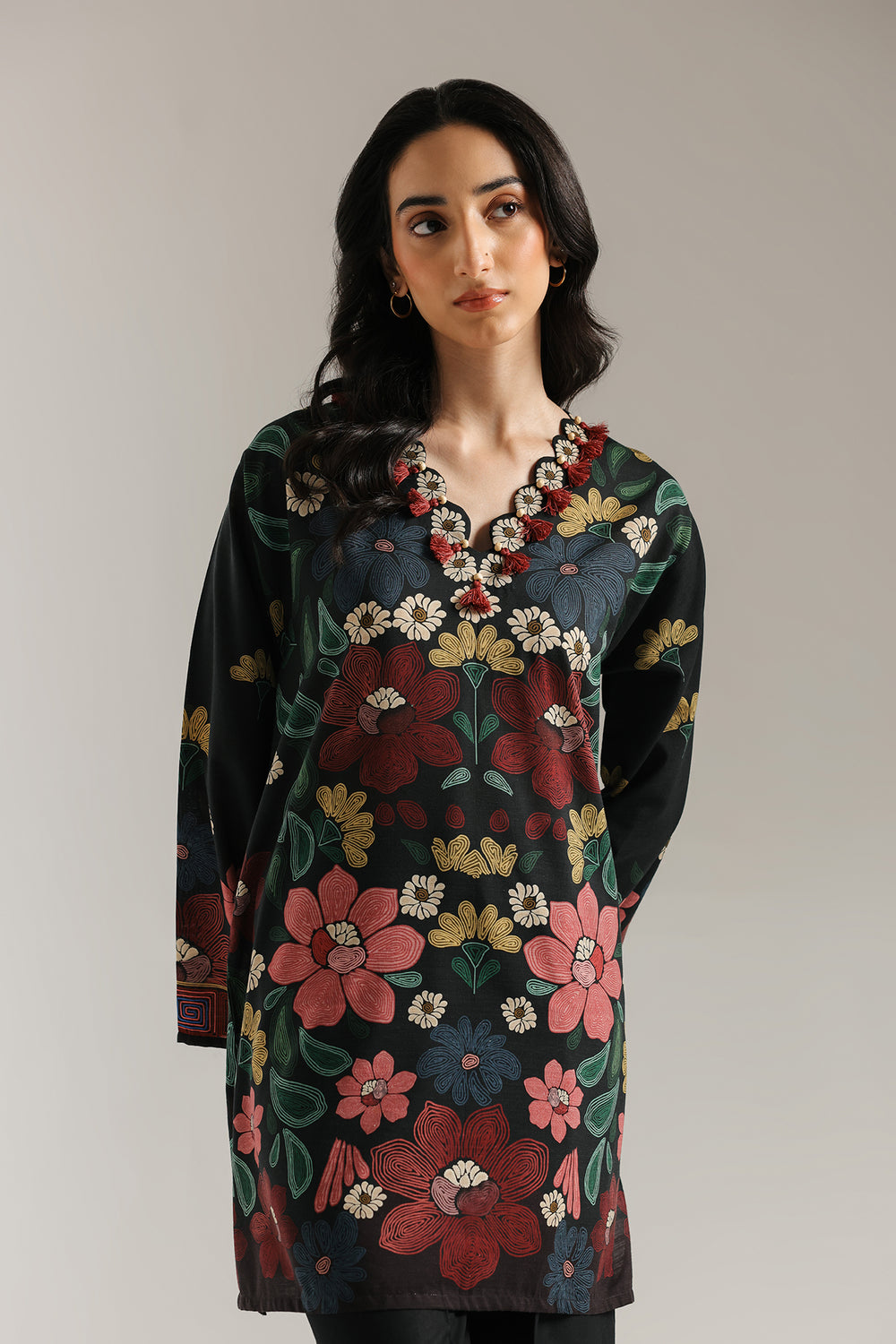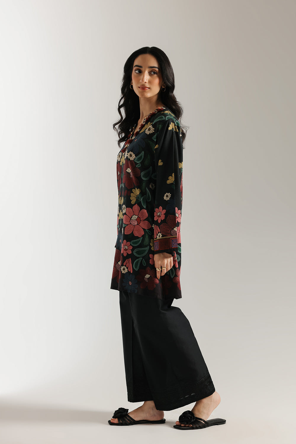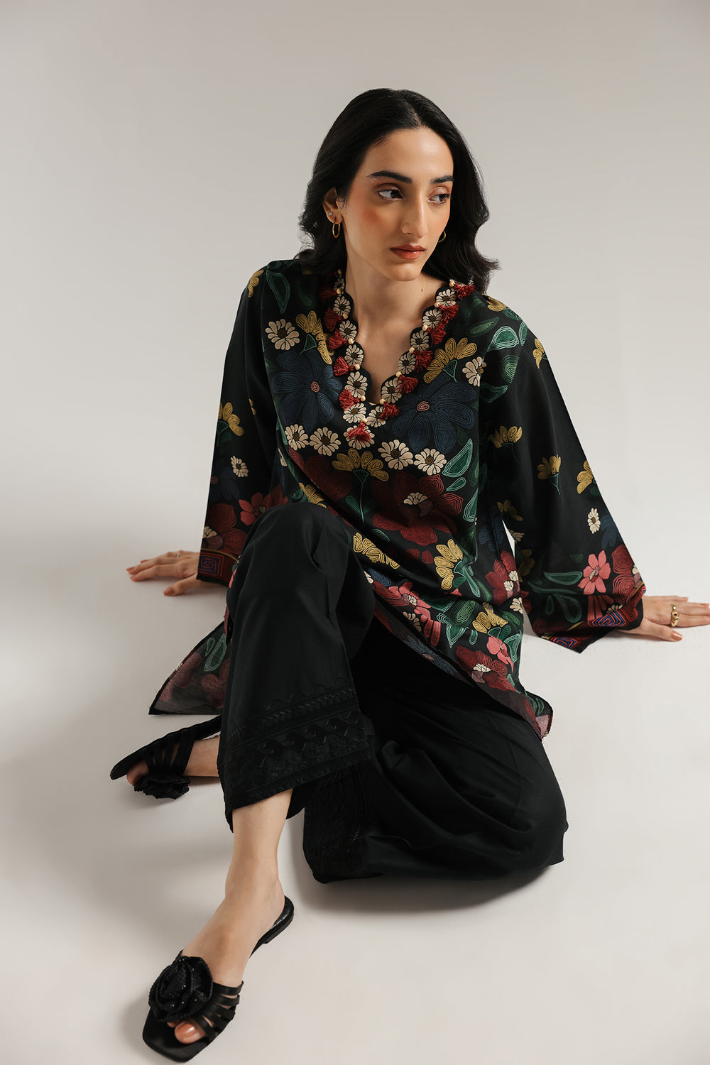 A masterpiece of sophisticated artistry. This stunning black printed kurti is adorned with a beautiful, large-scale floral print in vibrant shades of pink, blue, and yellow. The relaxed-fit kurti can be paired with matching black culotte trousers to create a cohesive and elegant look.