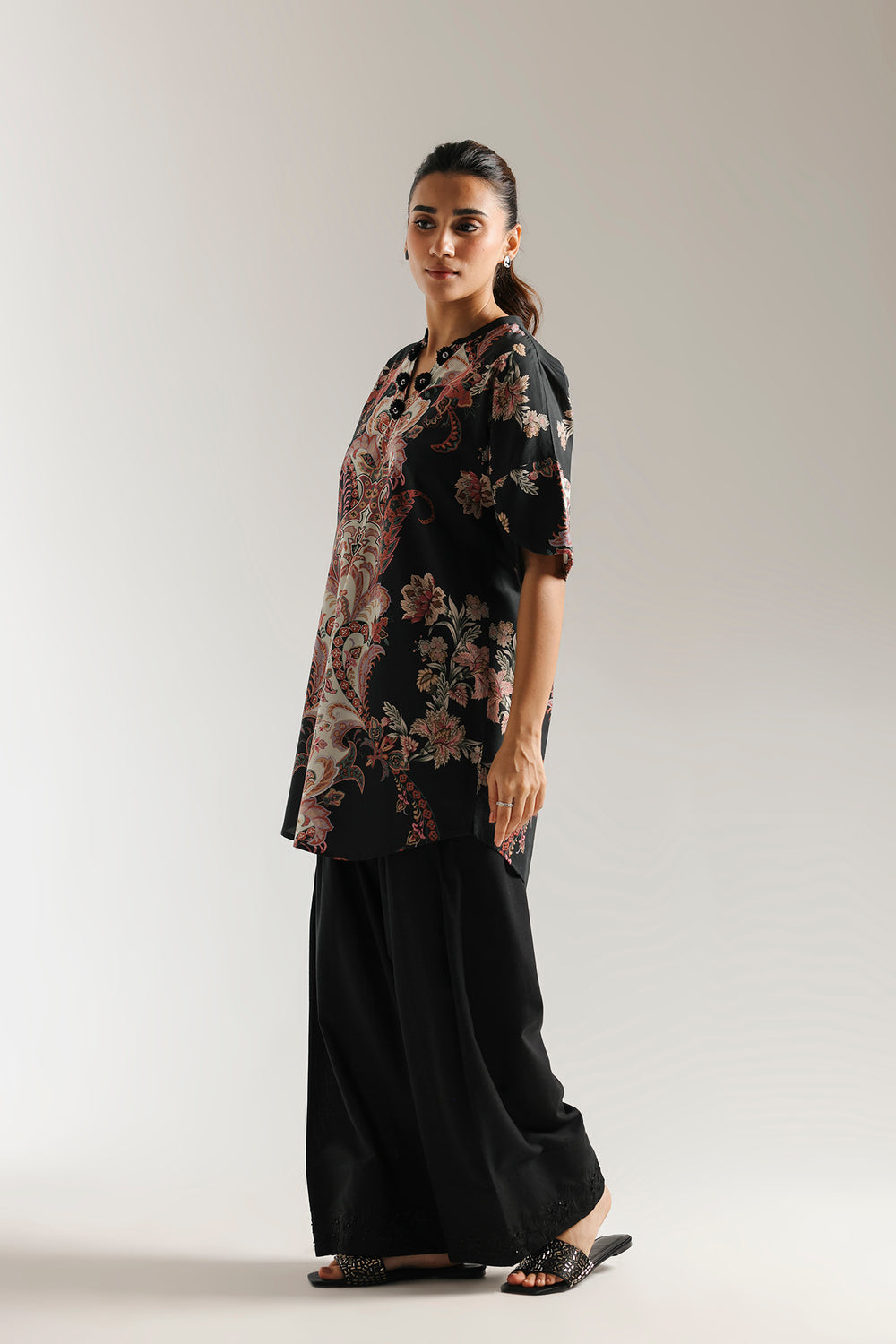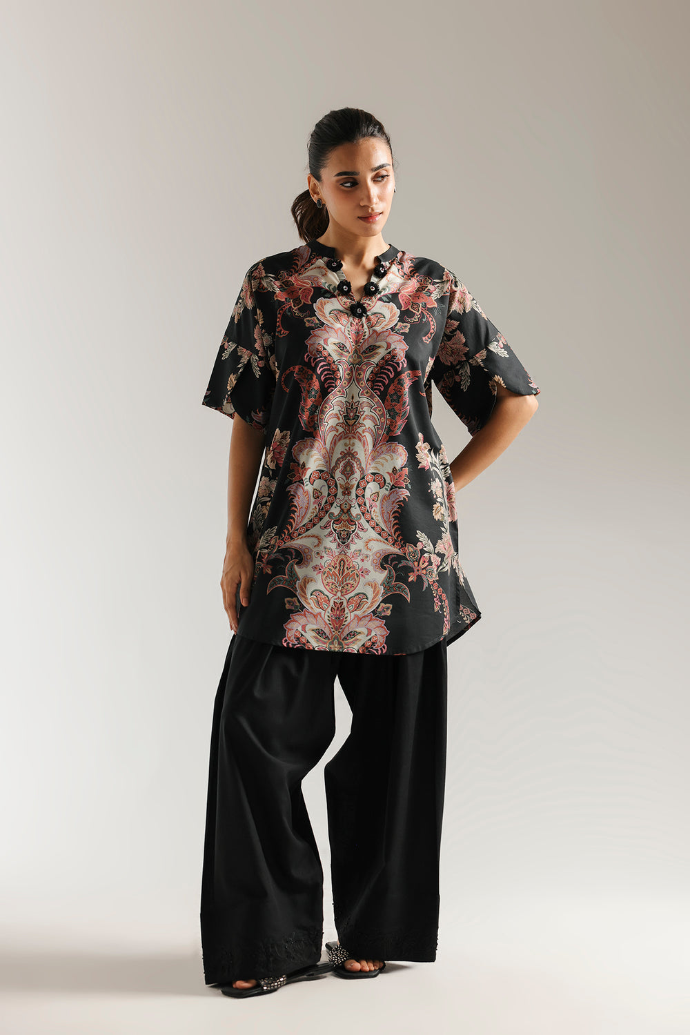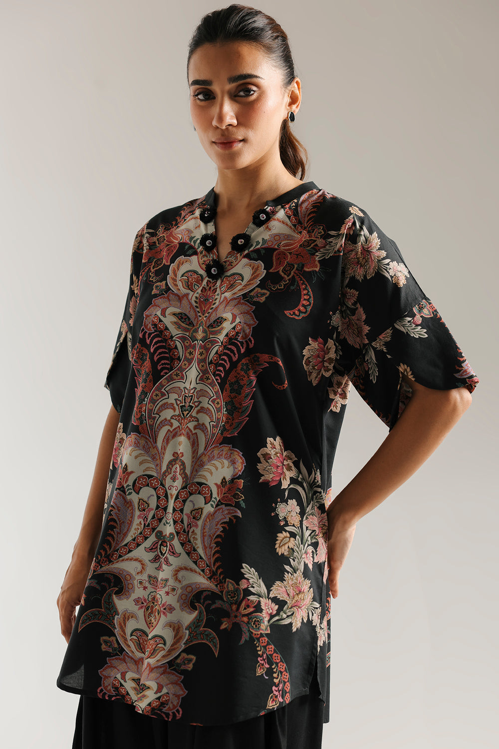 A wearable work of art, this captivating printed kurti is a true statement piece. The deep black fabric is adorned with an intricate and vibrant paisley and floral print, reminiscent of a rich tapestry. The elegant silhouette and sophisticated neckline make this a standout piece for any occasion.