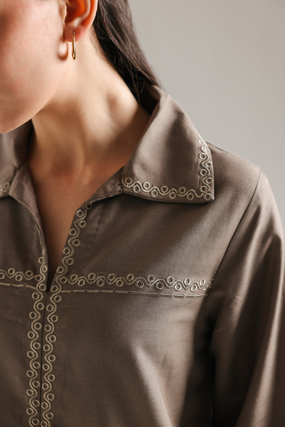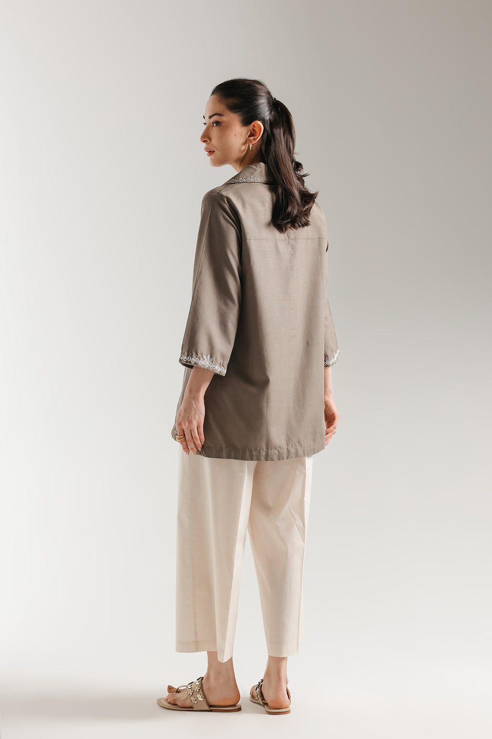 Radiate a serene and tropical charm with this earth-toned embroidered kurti, featuring a detailed beachscape-inspired design. The shirt is artfully adorned with white needlework depicting swaying palm trees, fluttering birds, and soft waves along the hemline. A structured wide collar leads into a central vertical embroidery line that provides a polished and elongated look to the relaxed silhouette. Finished with three-quarter length sleeves featuring delicate embroidered cuffs and a straight hem, this piece offers a modern and breezy aesthetic for sophisticated daytime wear.