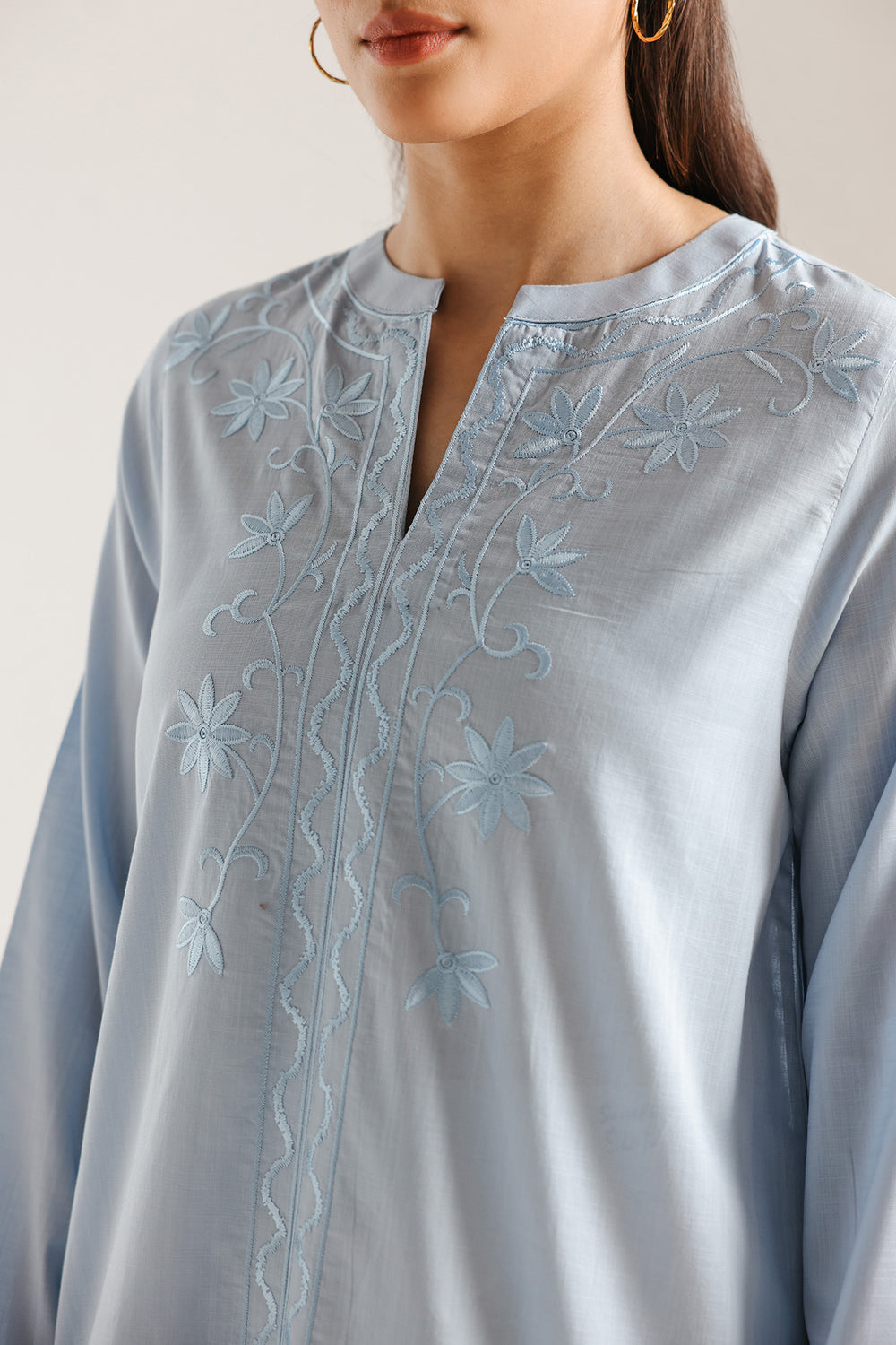 Radiate breezy elegance in this sky-blue embroidered kurti, featuring a soft, pastel palette and a relaxed, contemporary silhouette. The design showcases a sophisticated split neckline and is adorned with intricate, tone-on-tone floral embroidery that gracefully cascades down the bodice and finishes at the hem and cuffs.