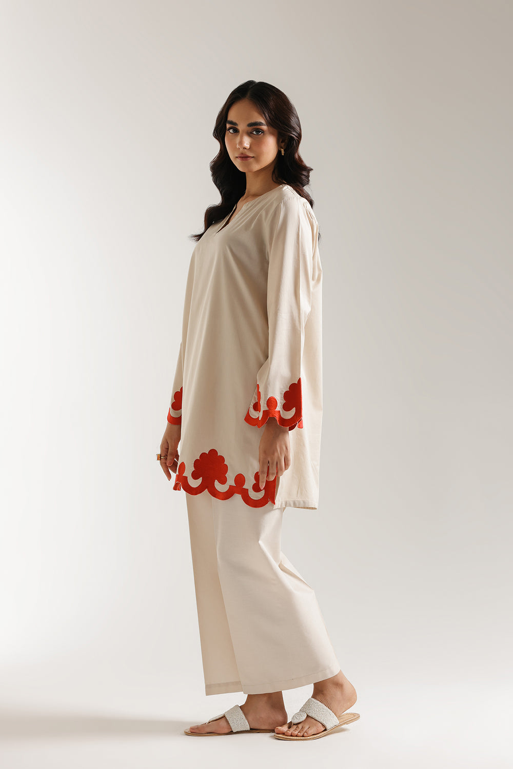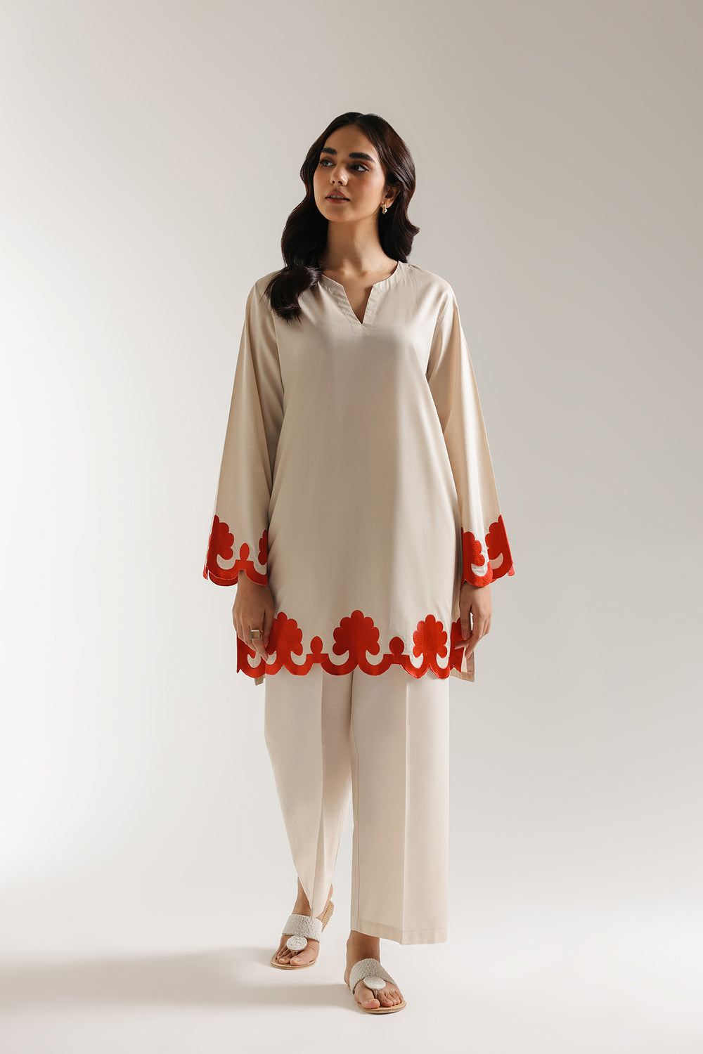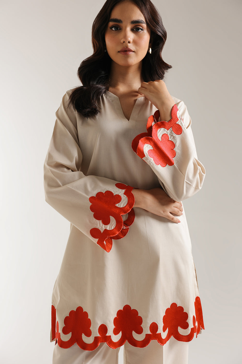 Elevate your summer wardrobe with this beautifully designed shirt. The elegant shirt features a clean, neutral color palette, accented by a striking rust maroon scalloped embroidery along the cuffs and hem. The relaxed fit and V-neckline offer a comfortable and flattering silhouette, giving it a more contemporary appeal perfect for both casual and semi-formal occasions.
