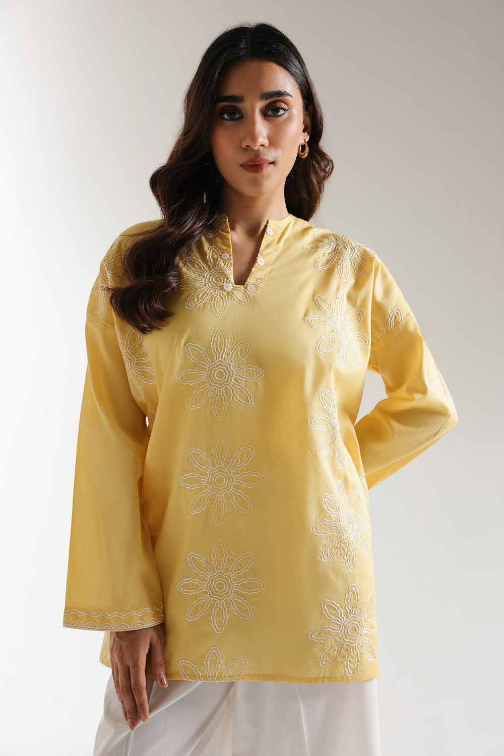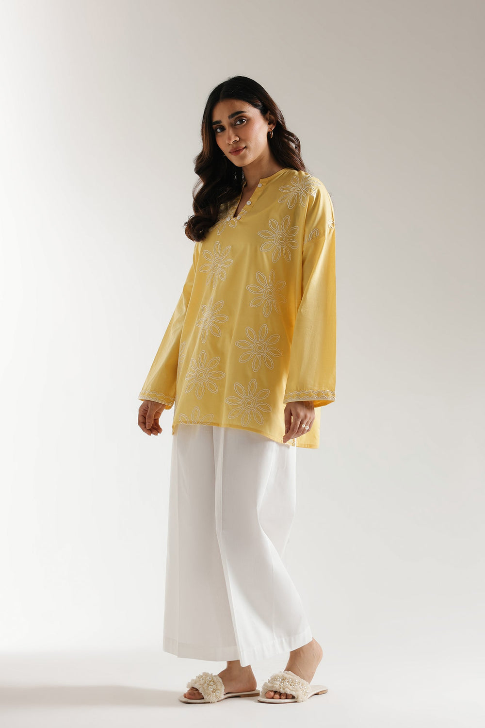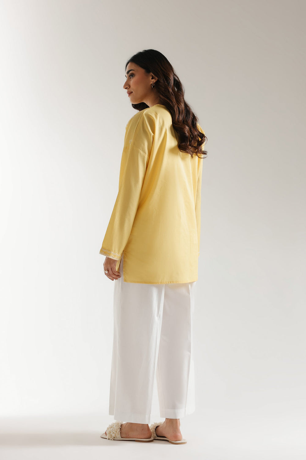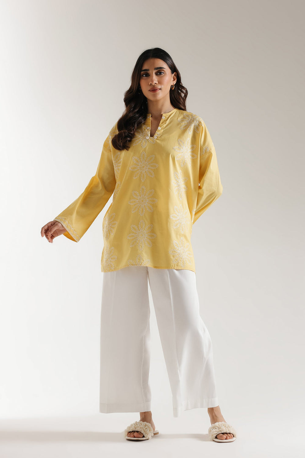 A classy shirt crafted in a contemporary silhouette. Illustrating a beautiful gleaming yellow color and intricately adorned with delicate embroidery illustrating floral designs. A graceful option to style at everyday gatherings this summer season.