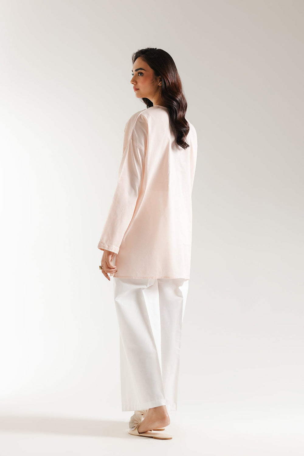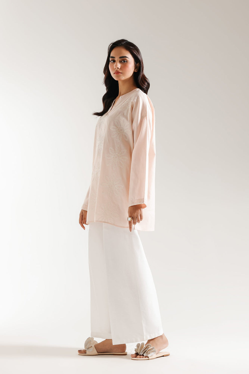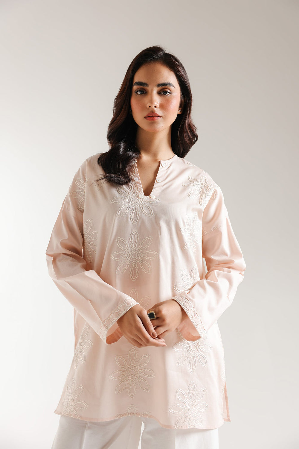 A classy shirt crafted in a contemporary silhouette. Illustrating a beautiful light pink color and intricately adorned with delicate embroidery illustrating floral designs. A graceful option to style at everyday gatherings this summer season.
