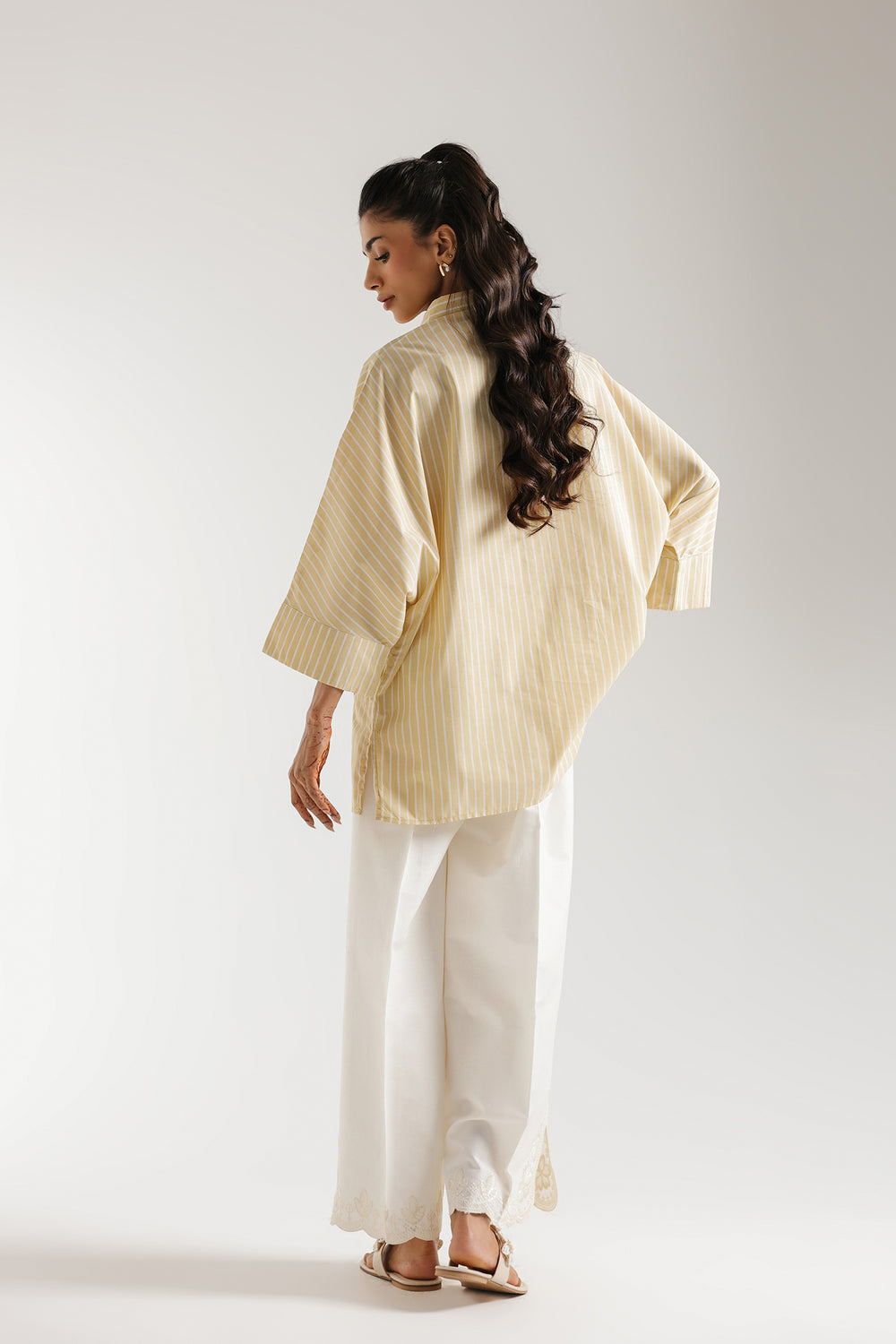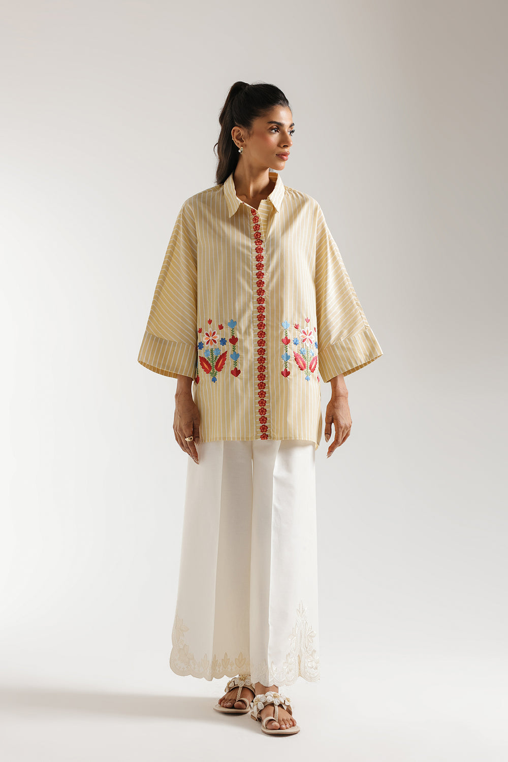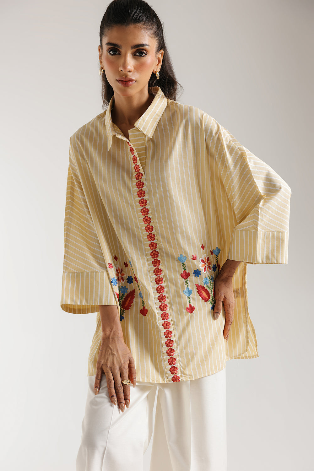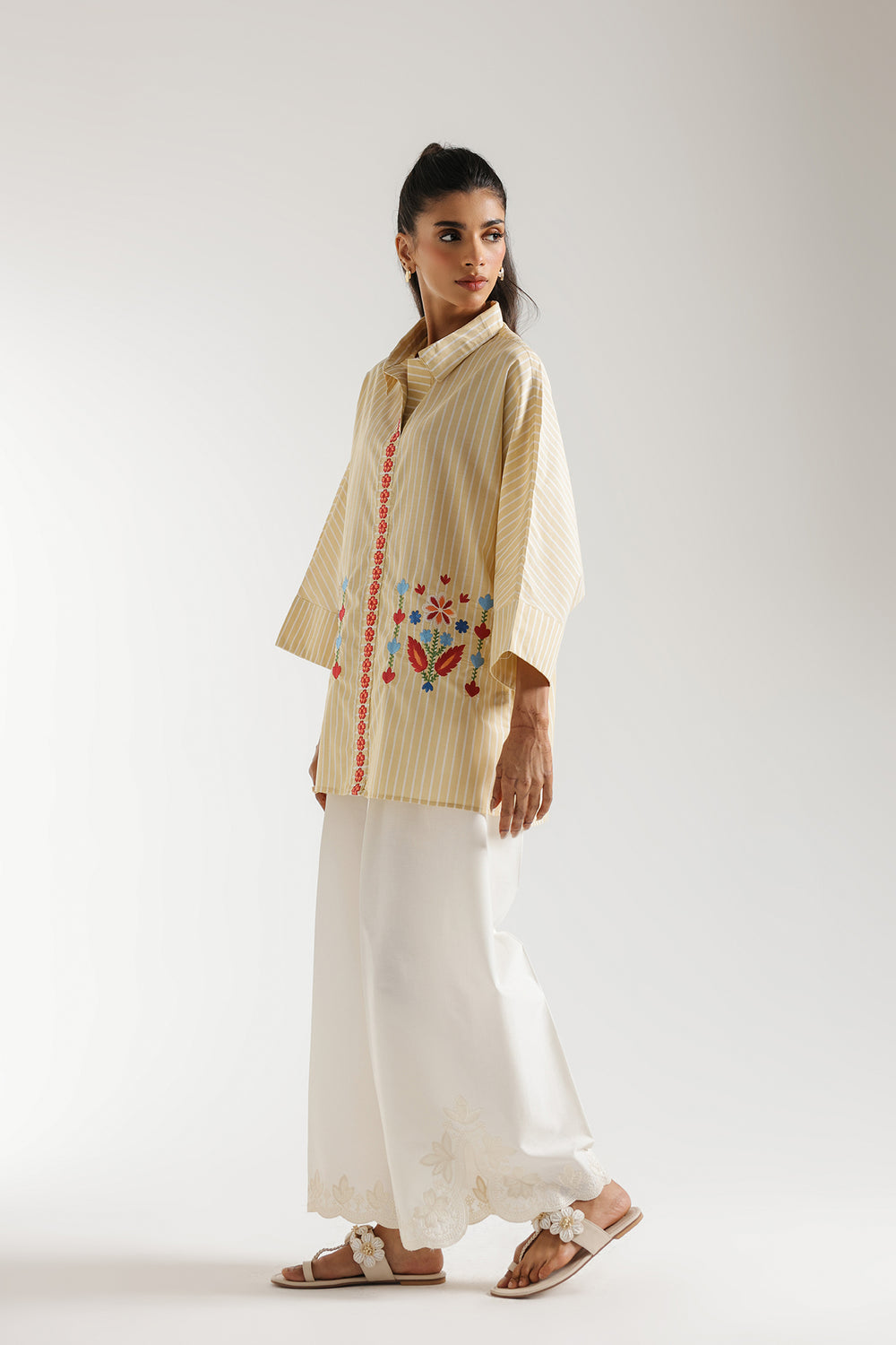 A classy shirt crafted in a contemporary silhouette. Illustrating a vibrant lime color adorned with stripes and intricately enriched with captivating floral embroidery at front with vibrant hues. A graceful option to style at everyday gatherings this summer season.