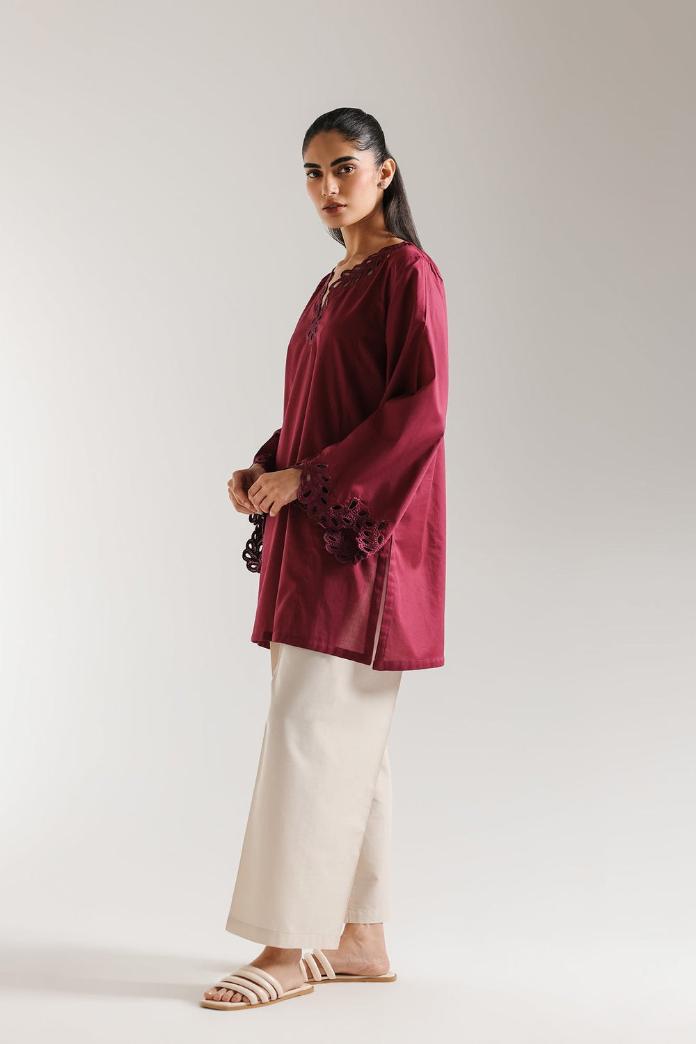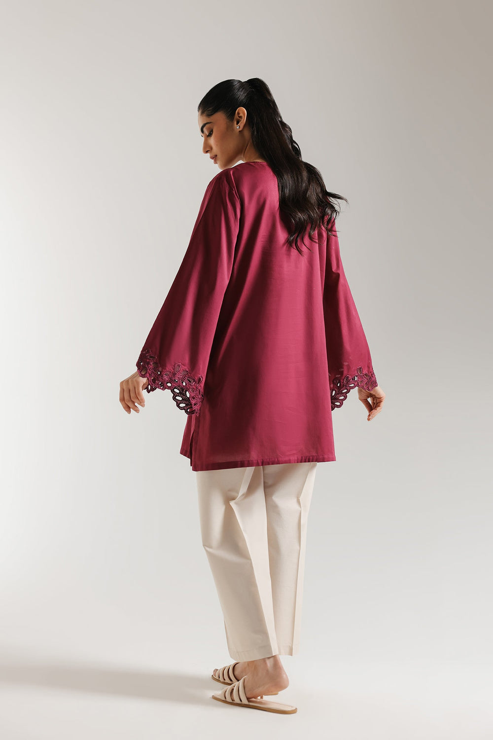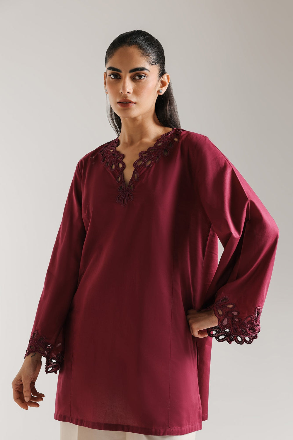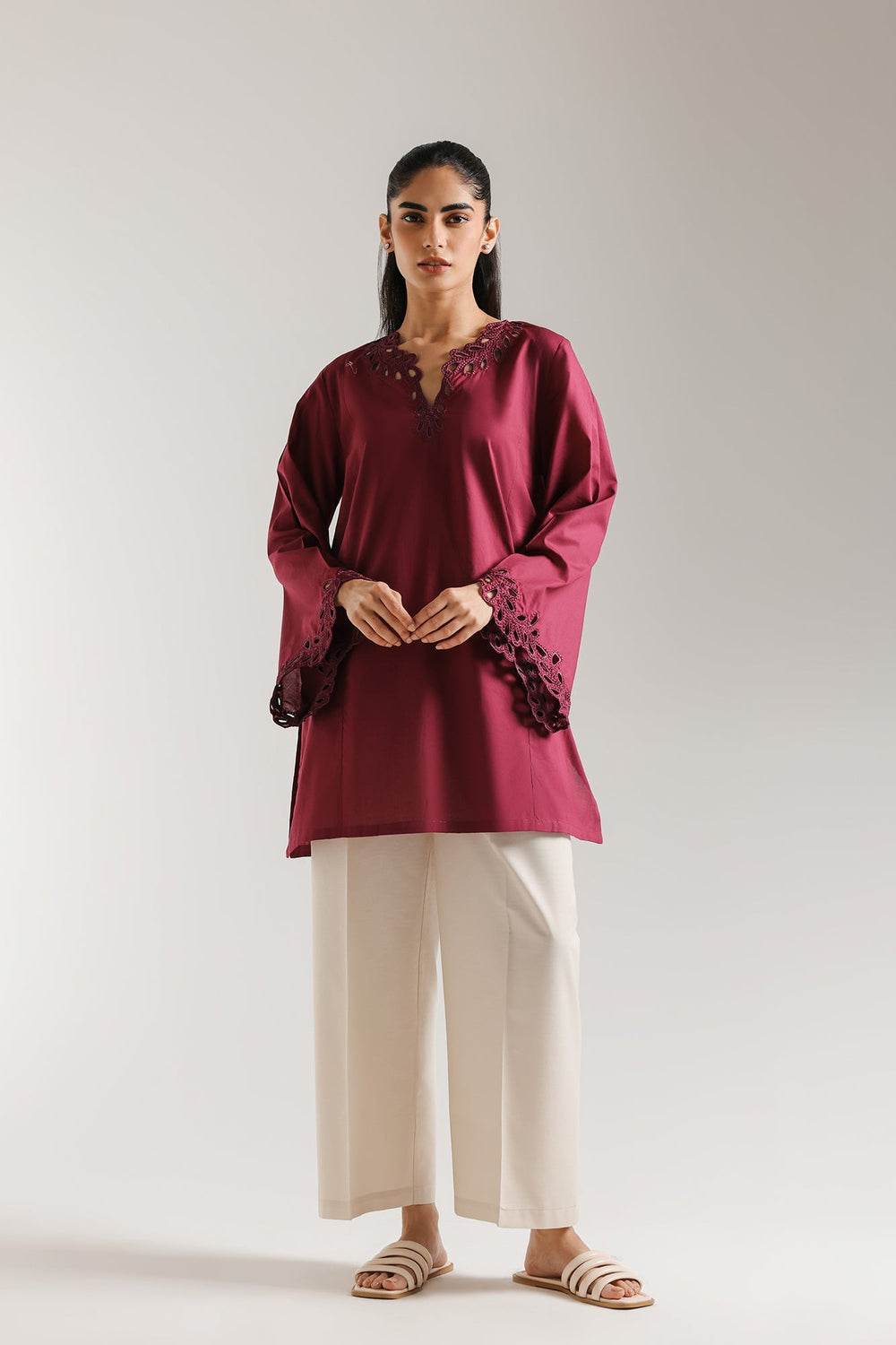 Discover the epitome of sophisticated style with this captivating kurta. Crafted in a rich, alluring magenta hue, this exquisite piece features intricate cutwork embroidery along the graceful V-neckline and wide, statement sleeves. The relaxed silhouette offers both comfort and a flattering drape, making it perfect for an elevated everyday look or a special evening out. Pair it with crisp white trousers for a timeless ensemble that speaks volumes.