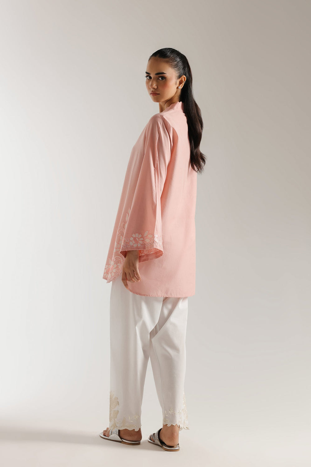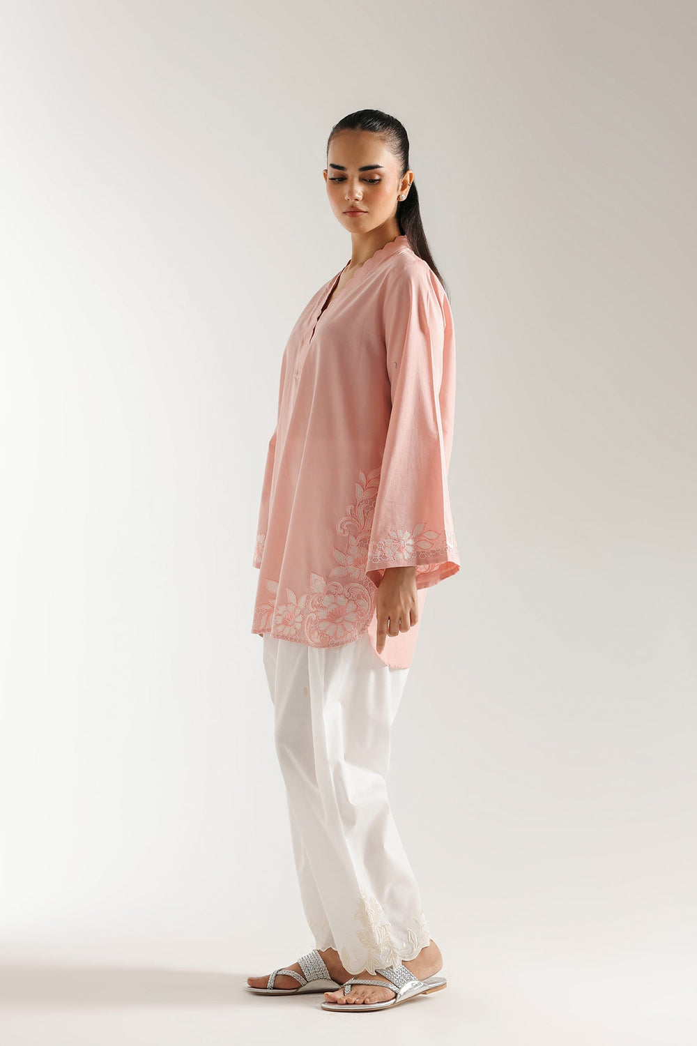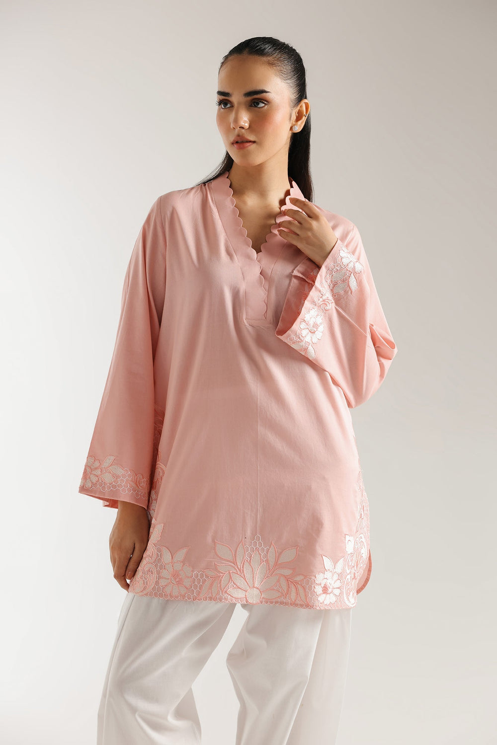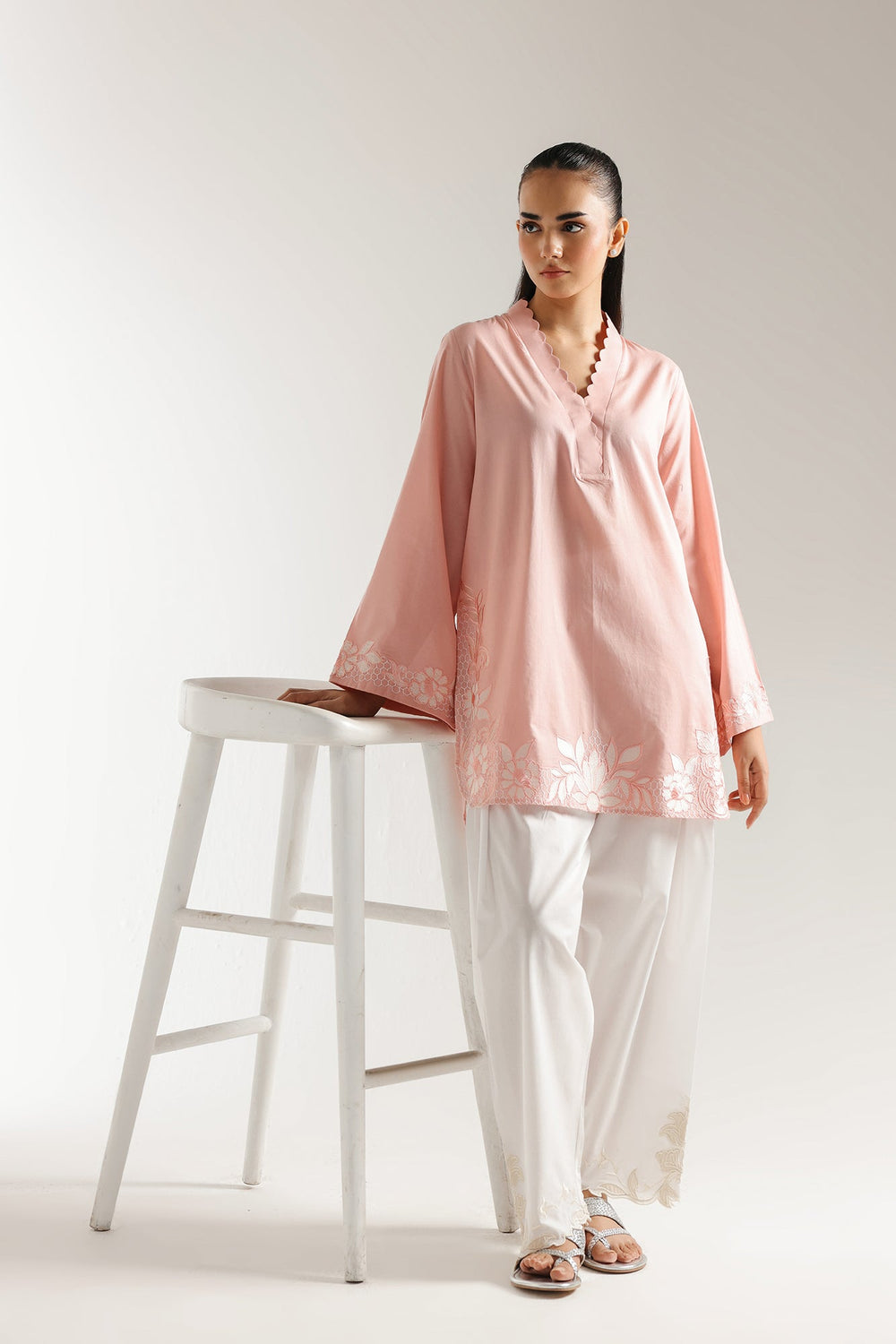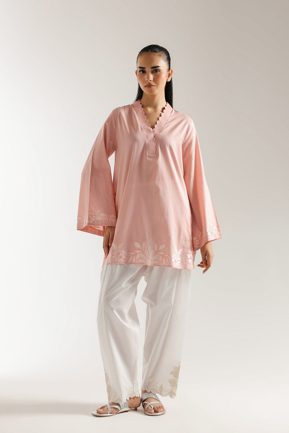 Step into effortless elegance with this enchanting blush pink kurta, a testament to refined style. Crafted from a soft, breathable fabric, its soothing hue provides the perfect canvas for the exquisite details that adorn it. The charming V-neckline features a scalloped edge, while the graceful bell sleeves and hem are adorned with intricate floral embroidery. Perfect for both casual sophistication and semi-formal gatherings, this kurta promises to elevate your look with its unique blend of comfort and captivating beauty.