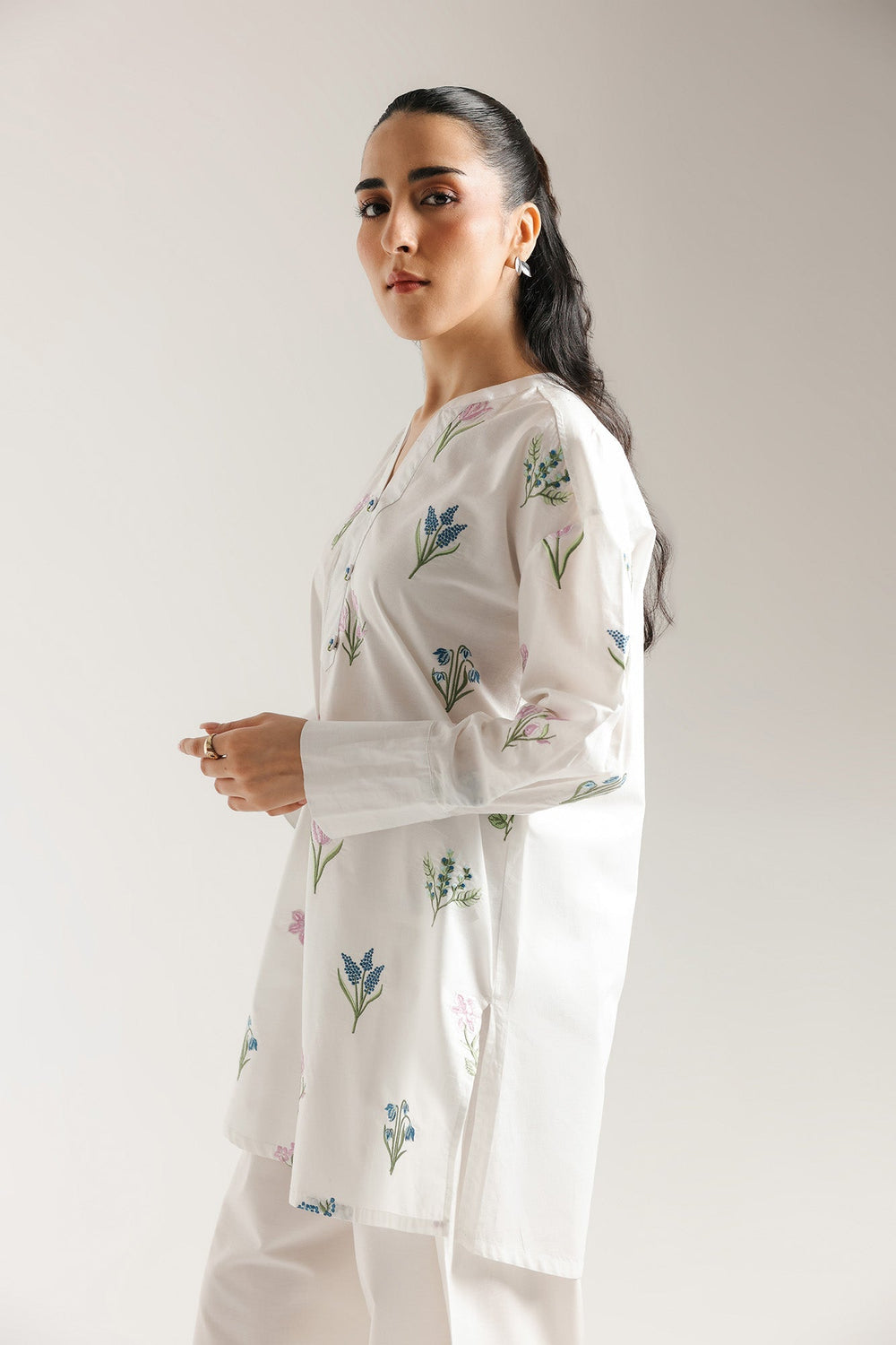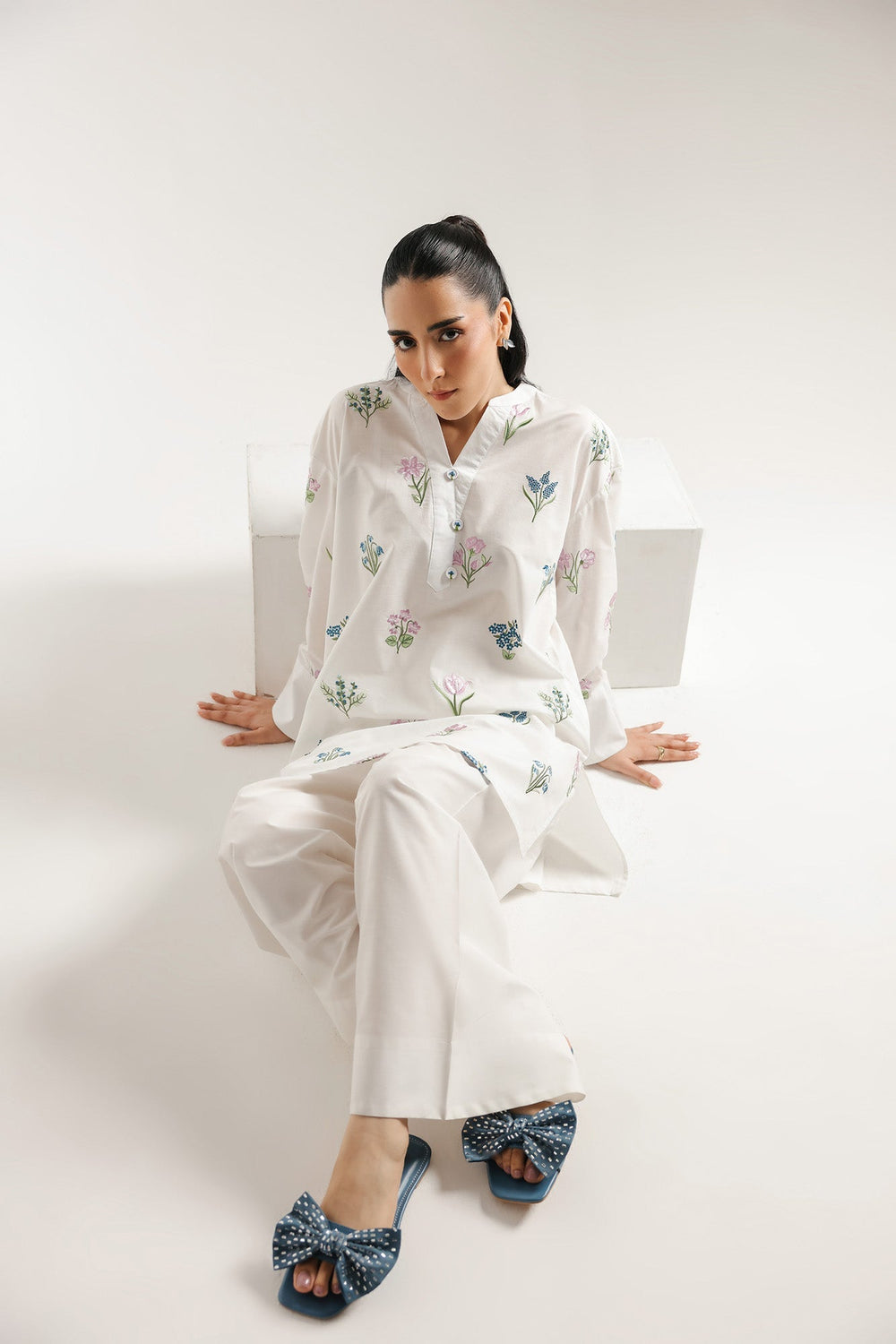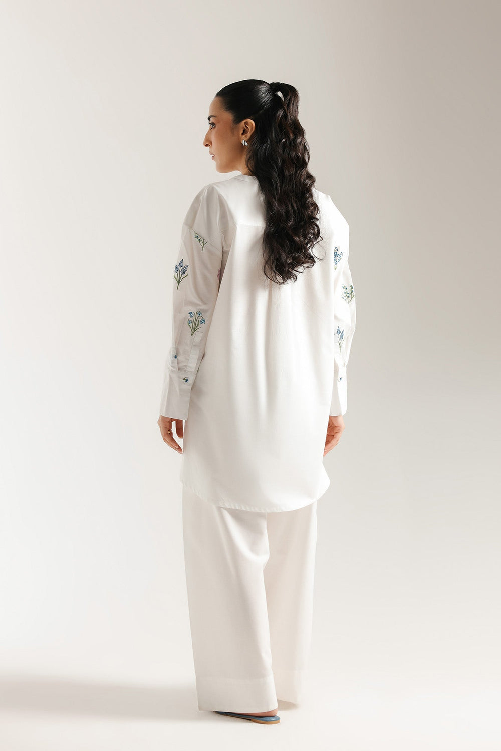 A fresh and delicate vision of modern elegance. This beautiful white shirt is adorned with stylized floral embroidery in soft pink and light blue hues. The relaxed silhouette and wide sleeves with buttoned cuffs create a comfortable yet chic look. It can be perfectly paired with wide-leg trousers, making this a perfect ensemble for a sophisticated and feminine style.