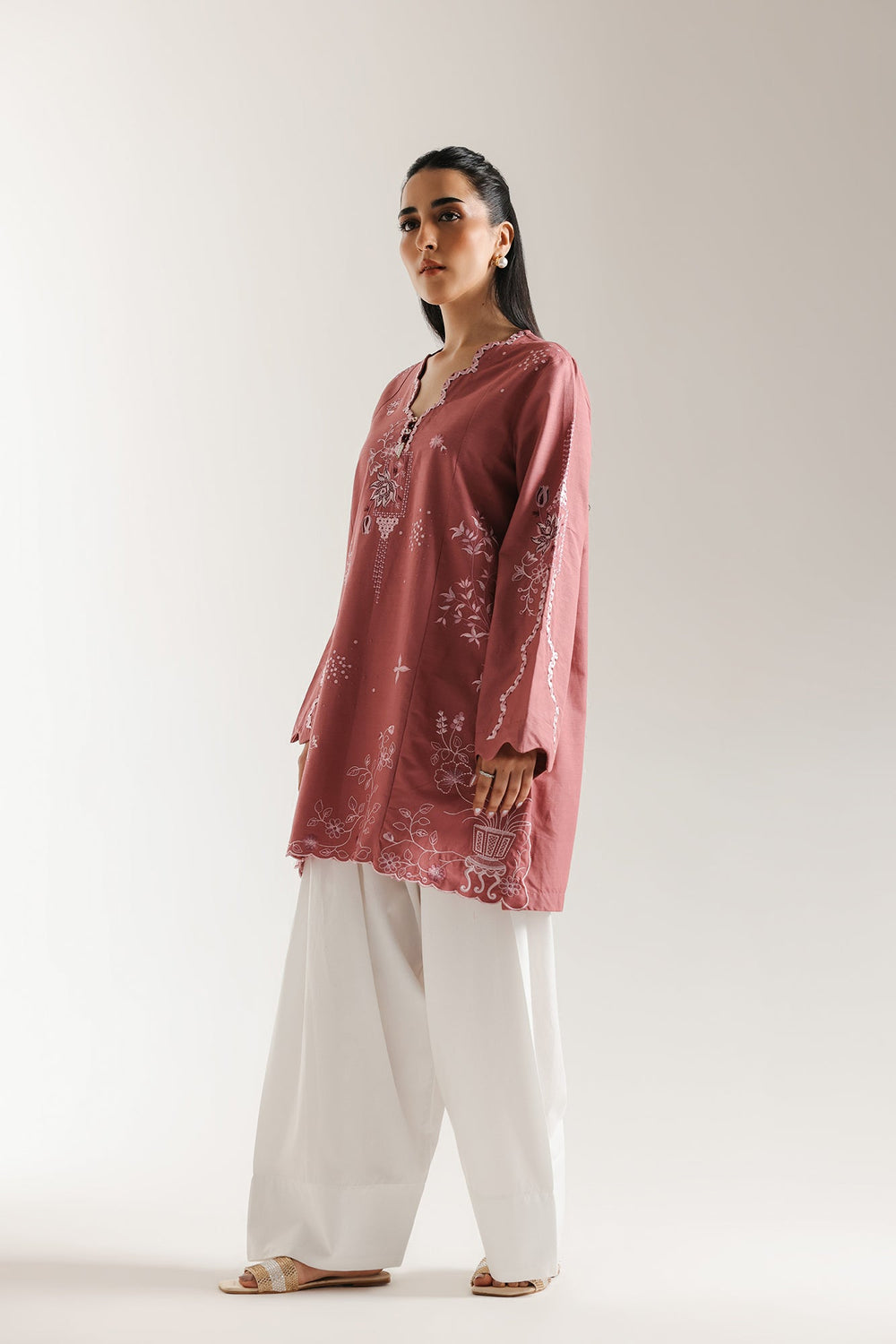 Immerse yourself in romantic, rosy charm with this exquisite dusty pink embroidered Shirt. This short, A line-cut shirt is crafted from a soft, raspberry rose fabric and features beautiful tonal thread embroidery. The intricate floral vine patterns gracefully trail across the front and wide sleeves. The V-slit neckline is accented with delicate button details and the hem is finished with a neat, scalloped cutwork edge.