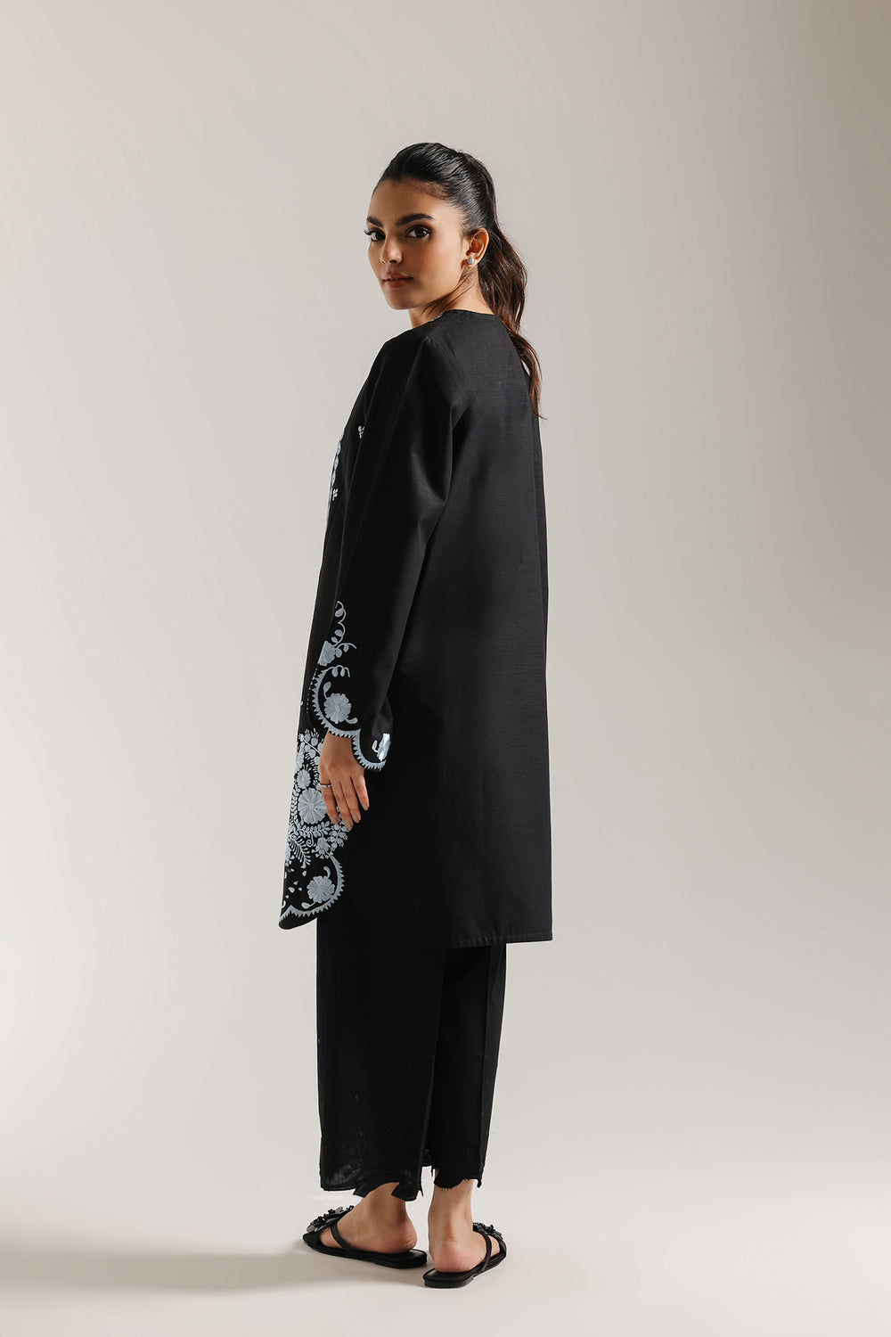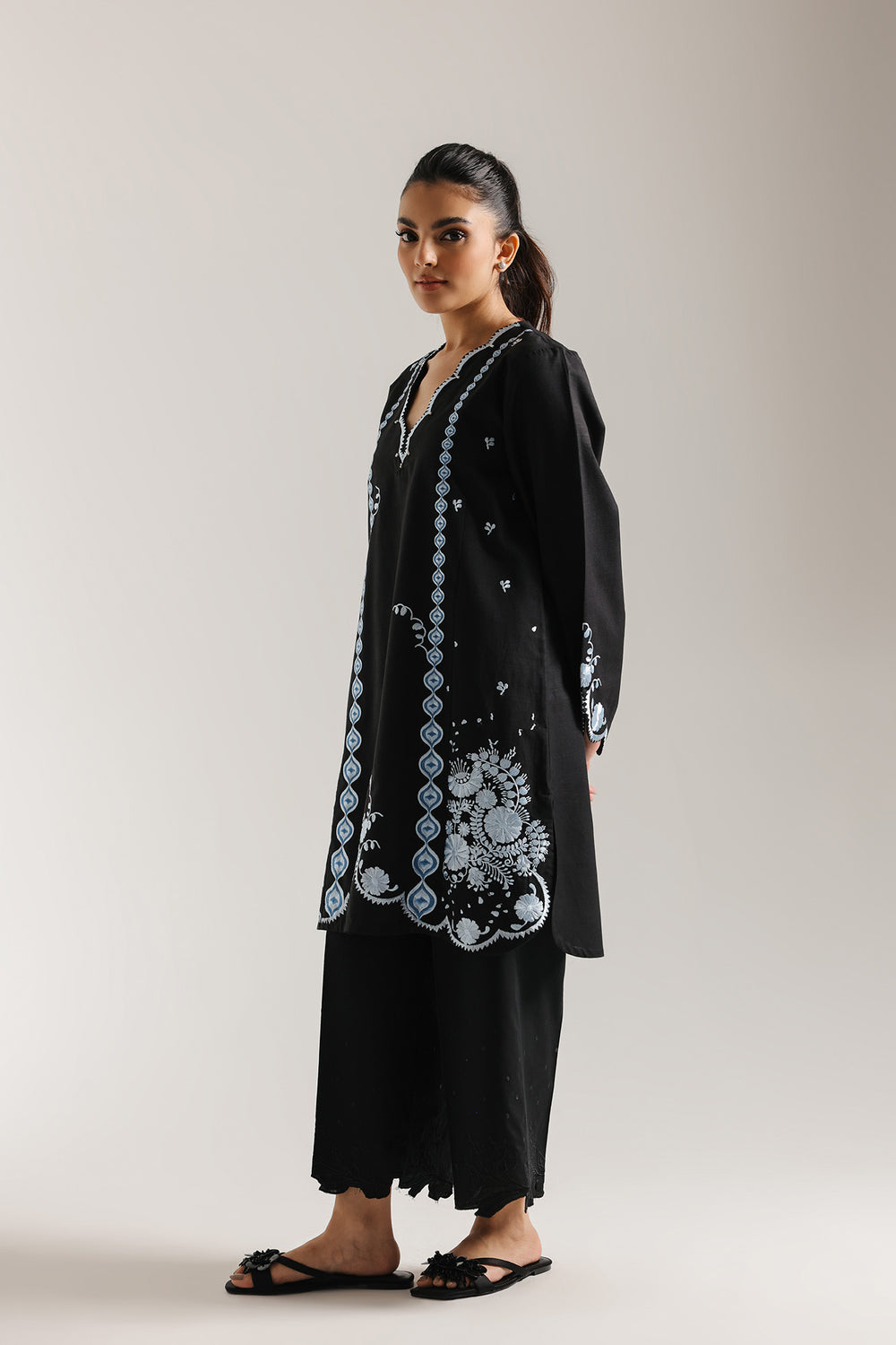 Make a striking statement with the graphic elegance of this embroidered shirt. This sleek, medium-length kurti is crafted from a solid black fabric and features crisp, bold embroidery in pale blue thread. The embroidery creates a stylized, symmetrical design that cascades down the front panels and borders the scalloped V-neckline. The wide, loose sleeves also feature the contrasting embroidery along the cuffs, creating exceptional visual impact.