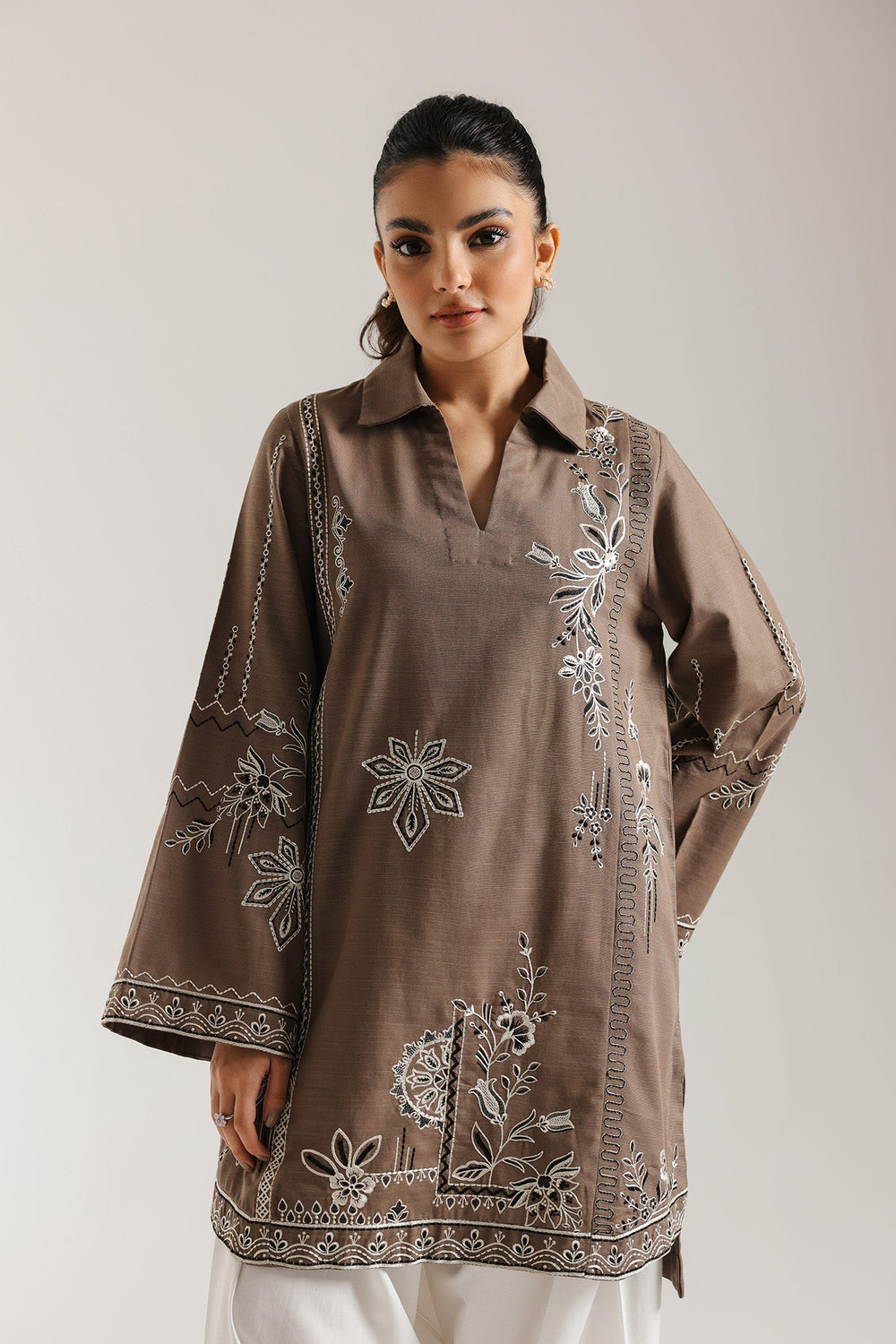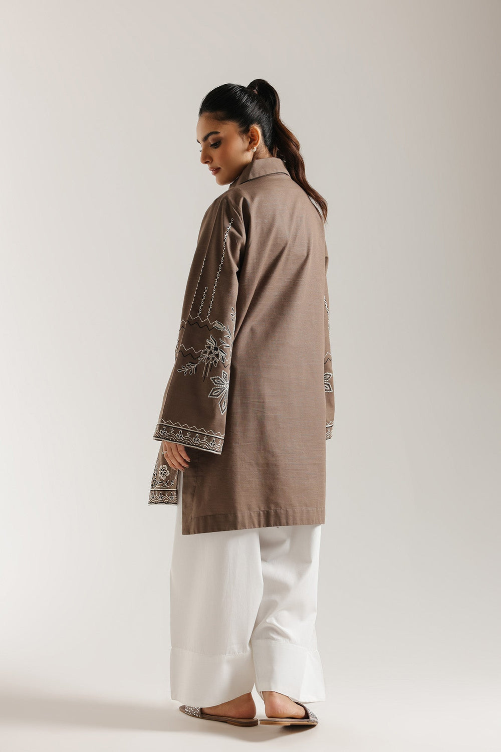 Exude contemporary sophistication in this striking embroidered suit. The ensemble features a relaxed, kurta with a simple V-neckline collar and elegant, wide-flaring sleeves, accented with subtle contrasting stitch detailing at the hem and cuffs. This clean, modern top is perfectly balanced by the statement-making trousers. This shirt seamlessly merges minimalist design with embroidery for an effortlessly chic look.