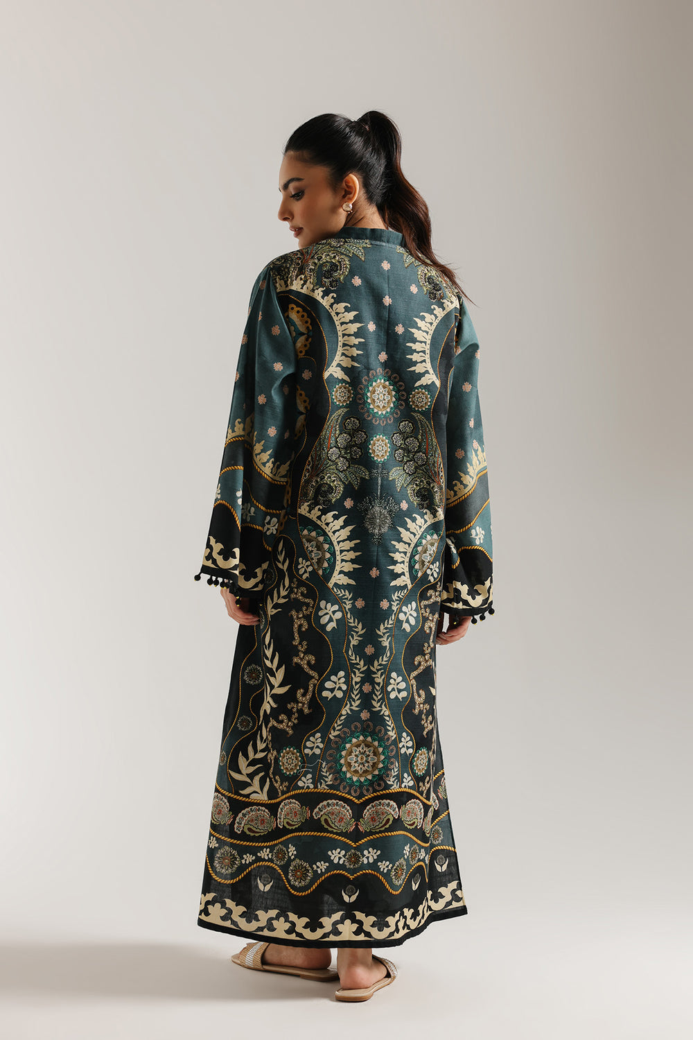 Embrace dramatic elegance with this captivating printed shirt. This long, flowing kurti is crafted from a rich fabric in a deep teal hue. The shirt is completely covered in a luxurious ornamental print featuring elaborate floral, paisley, and geometric motifs in tones of gold, ivory, black, and rust. The design forms striking vertical panels down the front, drawing the eye to the sophisticated detail. It features a flattering V-neckline with a band collar and is finished with subtle embellishments along the sleeve cuffs, adding a playful yet luxurious touch.