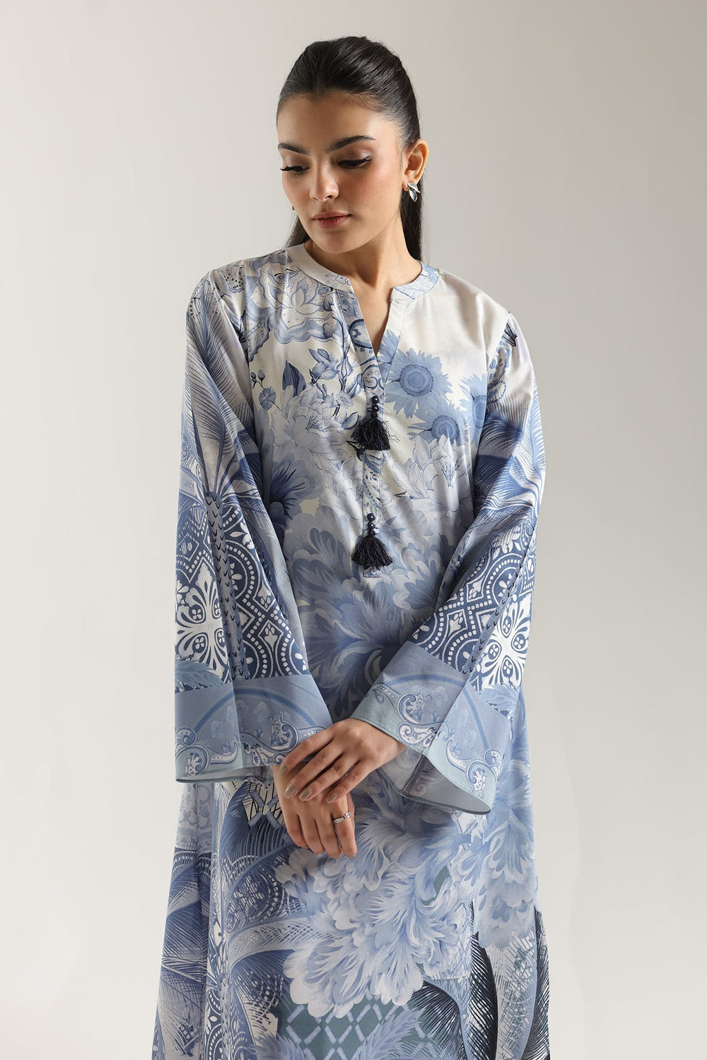A refined long shirt in creamy coconut milk hue, adorned with an intricate blue print that adds visual interest. This piece features a classic round neckline with a graceful V-slit, complemented by two decorative tassels at the front for an authentic touch. The full-length sleeves provide coverage and elegance, making this shirt versatile for layering or standalone wear. The contemporary styling, suitable for casual occasions.