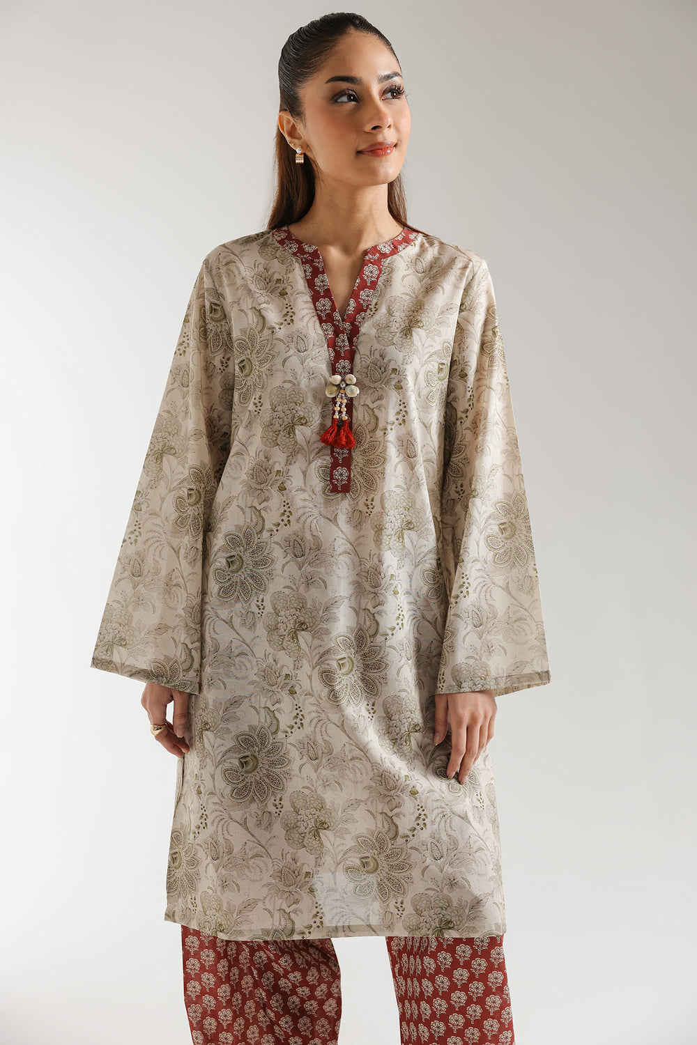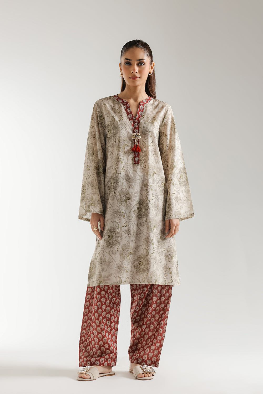 Embrace the summer season with this stylish suit, featuring a contemporary composition and captivating artistic floral prints in antique white color. Paired with a contrasted deep maroon shalwar adorned with fascinating floral prints, it's a trendy and fun outfit choice!