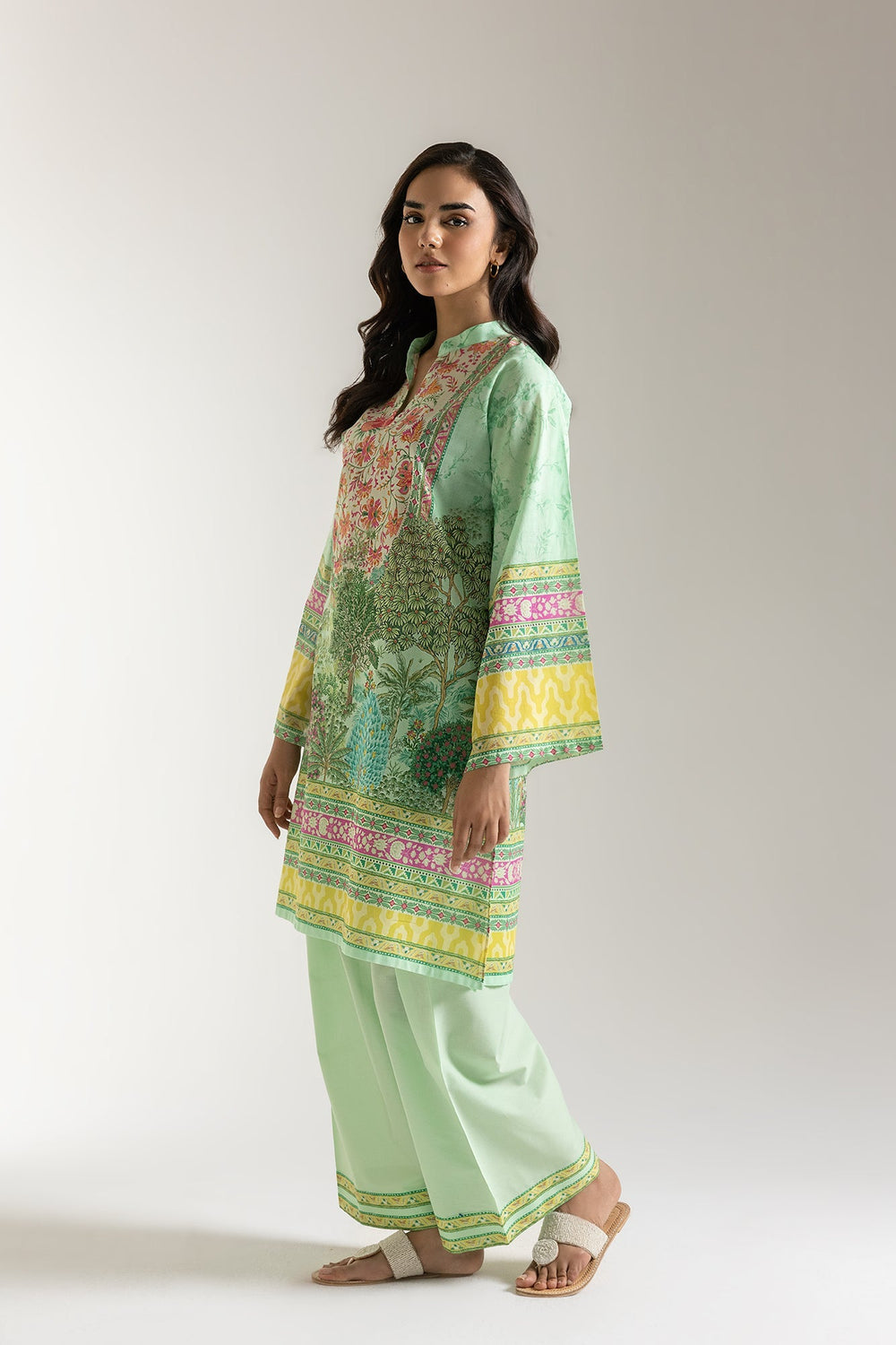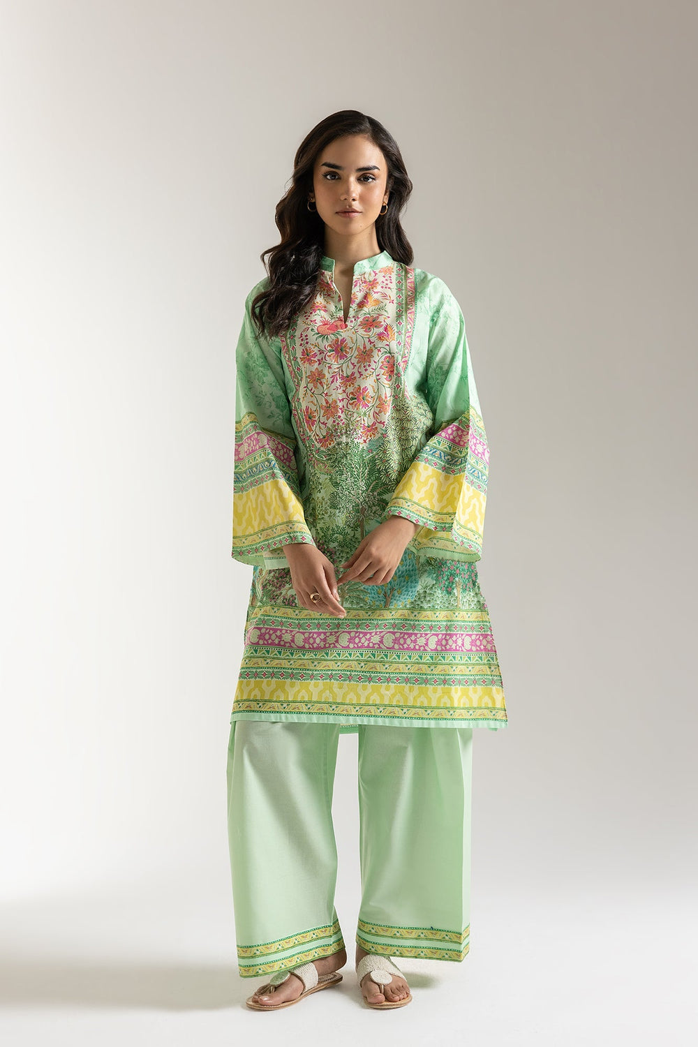 Step into the refreshing charm of our mint meadow suit, a vibrant ensemble that captures the essence of a blossoming spring. This captivating two-piece features a luminous light green kurti, adorned with a delightful medley of intricate prints. The design showcases beautiful floral motifs around the neckline and a harmonious blend of artistic patterns across the body and wide sleeves, punctuated by lively yellow and pink accents on the cuffs and hem. Paired with perfectly coordinated solid light green wide-leg shalwar, this outfit offers a harmonious blend of comfort and distinct style. Ideal for festive gatherings, joyous celebrations, or simply adding a touch of refreshing elegance to your presence.