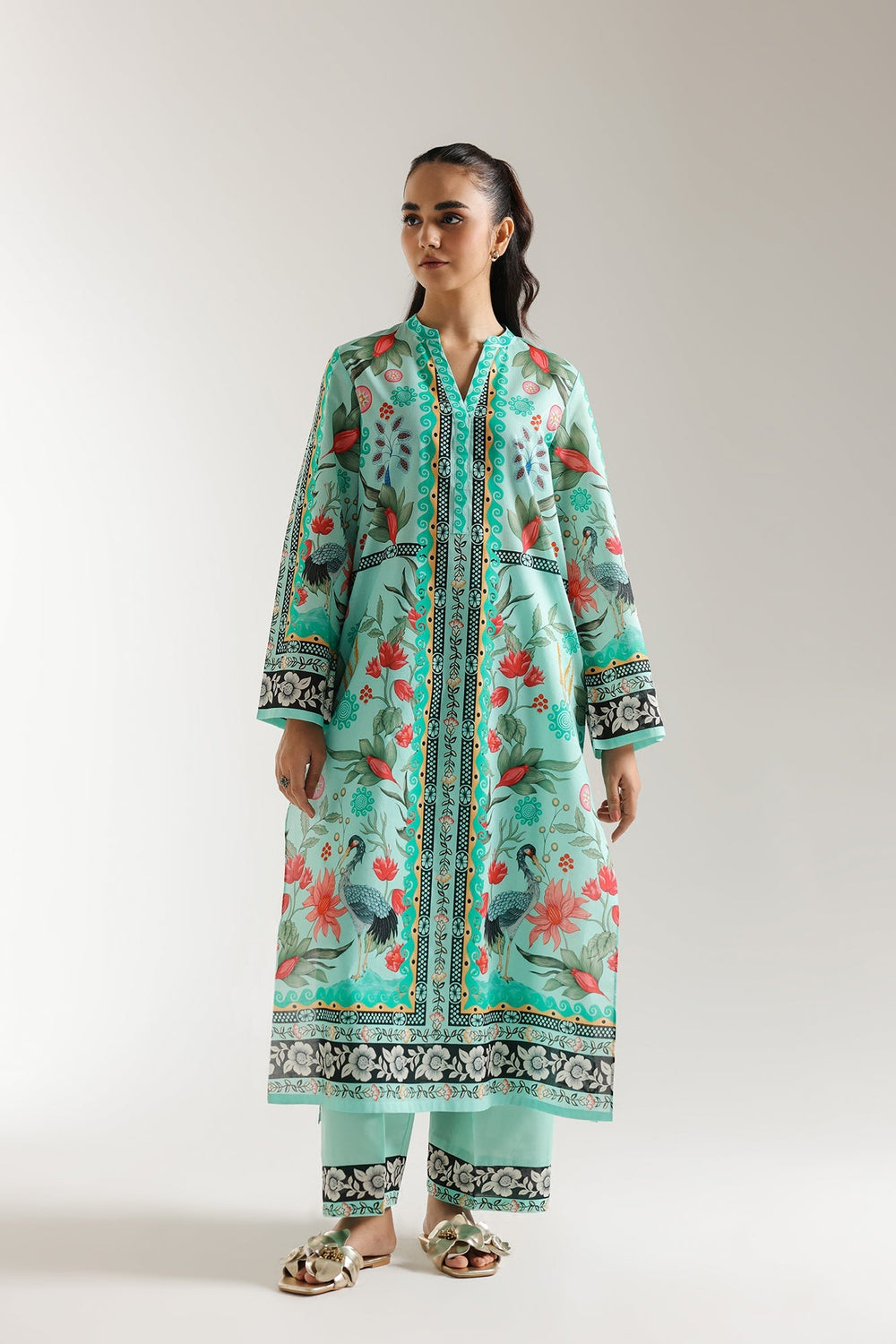 Make a bold statement with this striking two-piece set. The shirt features a rich sea green base adorned with a captivating and colorful prints, inspired by nature and traditional motifs. Details such as contrasting borders on the sleeves and hem add visual interest. The relaxed silhouette ensure a comfortable fit. Paired with matching printed trouser, this ensemble creates a cohesive and fashionable look. Perfect for those who appreciate unique patterns and vibrant style.