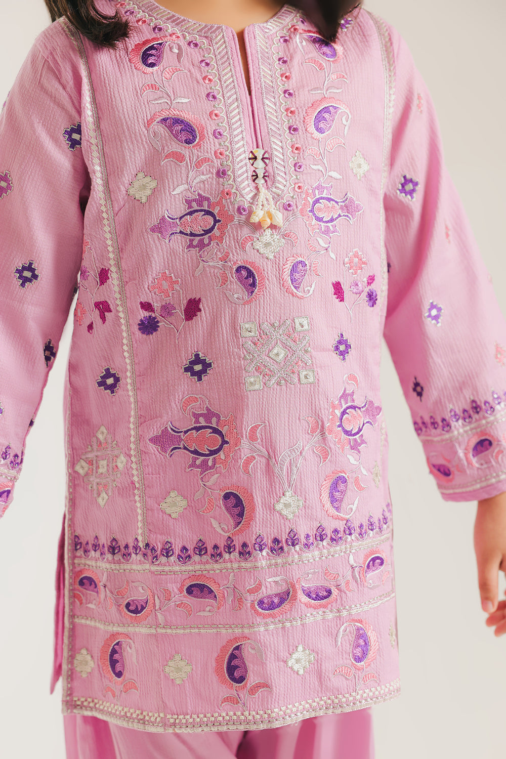 Discover a world of elegance with this charming embroidered suit. This graceful lavender-hued ensemble features a kurta with a beautiful array of intricate embroidery in shades of purple, blue, and white, creating a mesmerizing pattern across the front and sleeves. Paired with a matching shalwar, this suit is a truly sophisticated and delightful choice for any festive event.